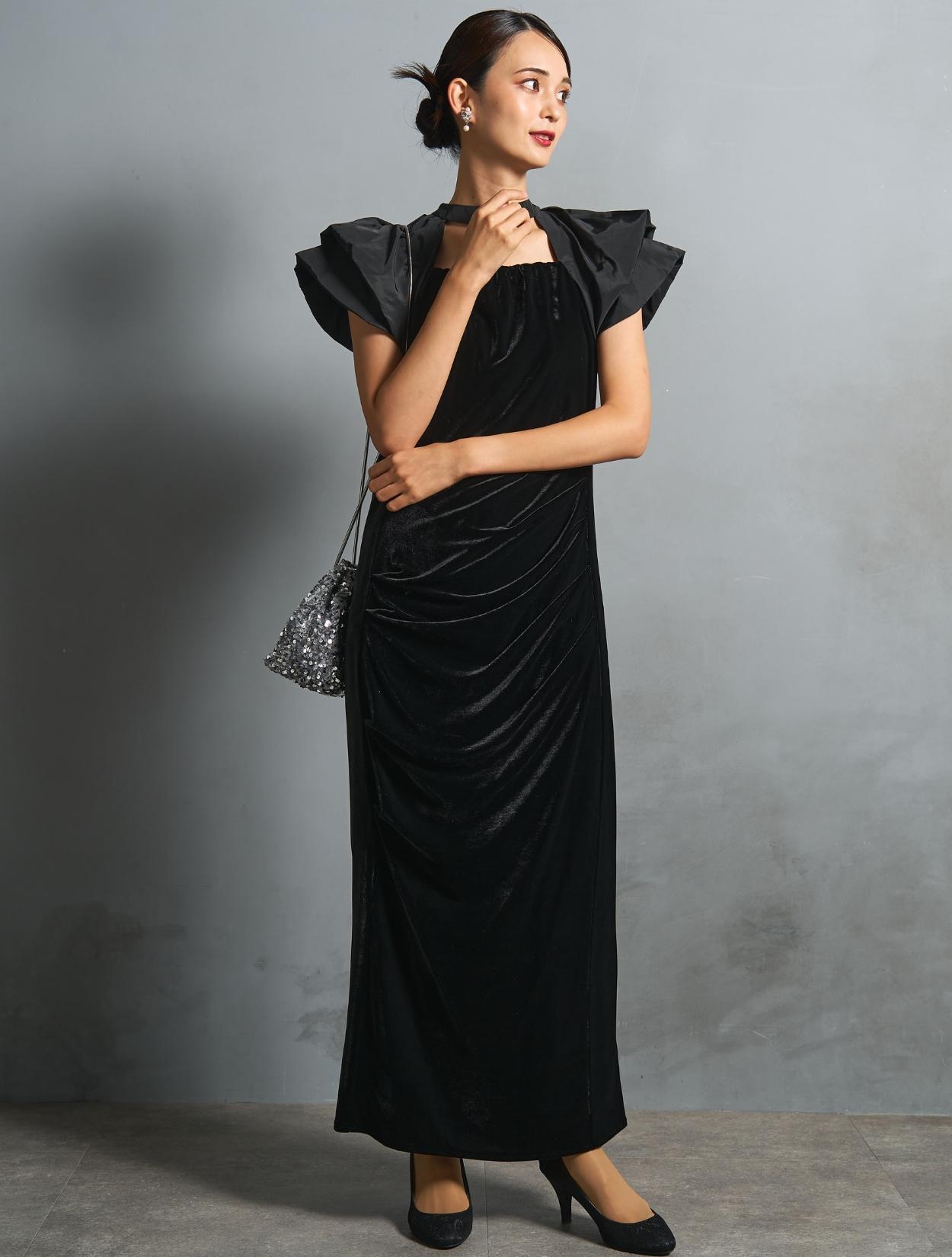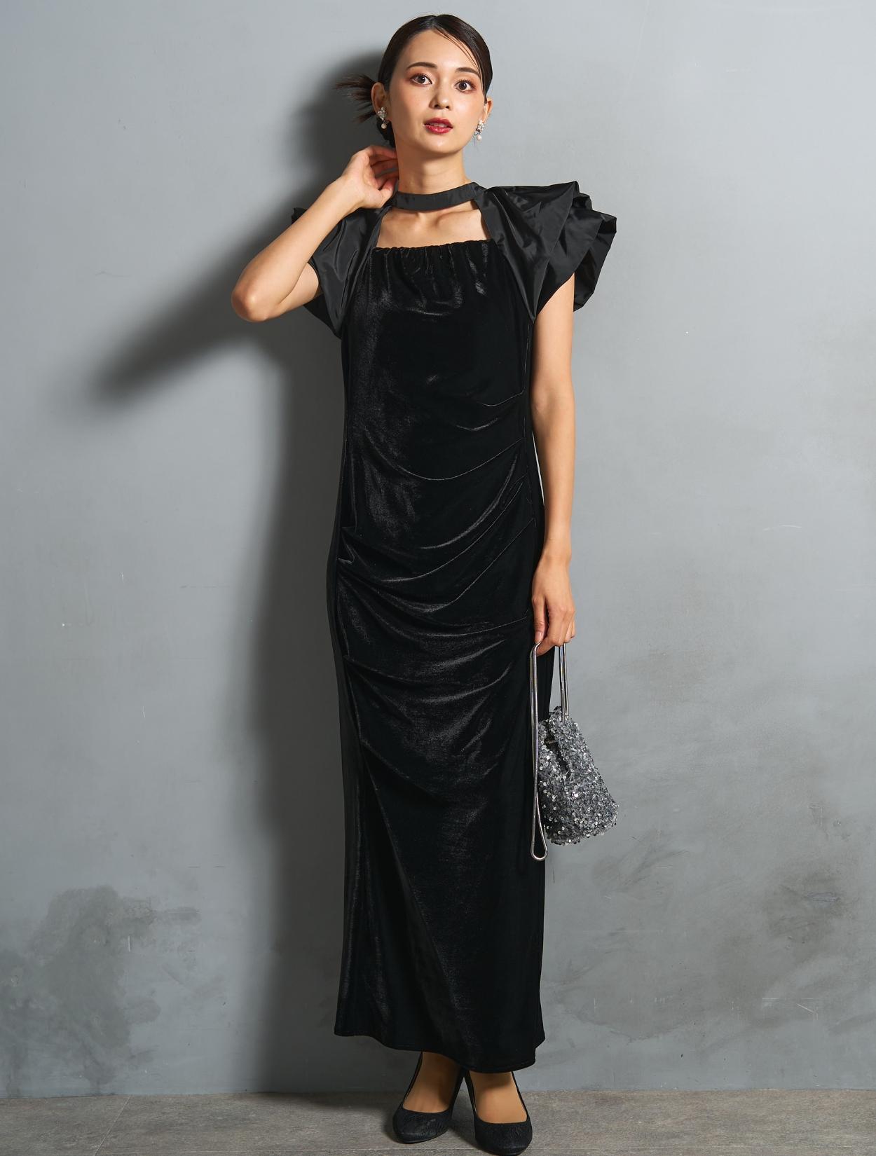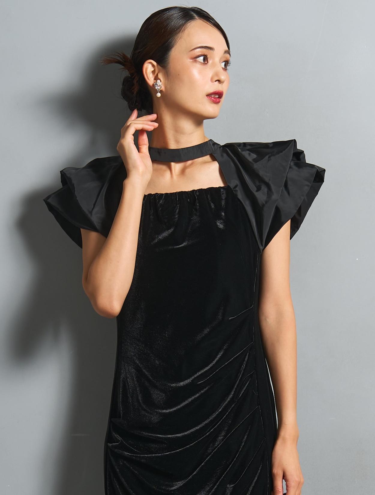 トップにボリュームを持たせたデザインが印象的。写真を撮る時もお顔周りが華やかに見えます。ベロアとは対照的なタフタ生地のお袖は、シャカっとした質感で甘くなりすぎません。硬すぎないハリ感は、袖を通した時に二の腕が細く見えるとのお声も。また、カットアウトのデコルテは、透けない生地のドレスに抜け感を出してくれます。適度な肌見せはフォーマルなシーンでは重要なポイントです。