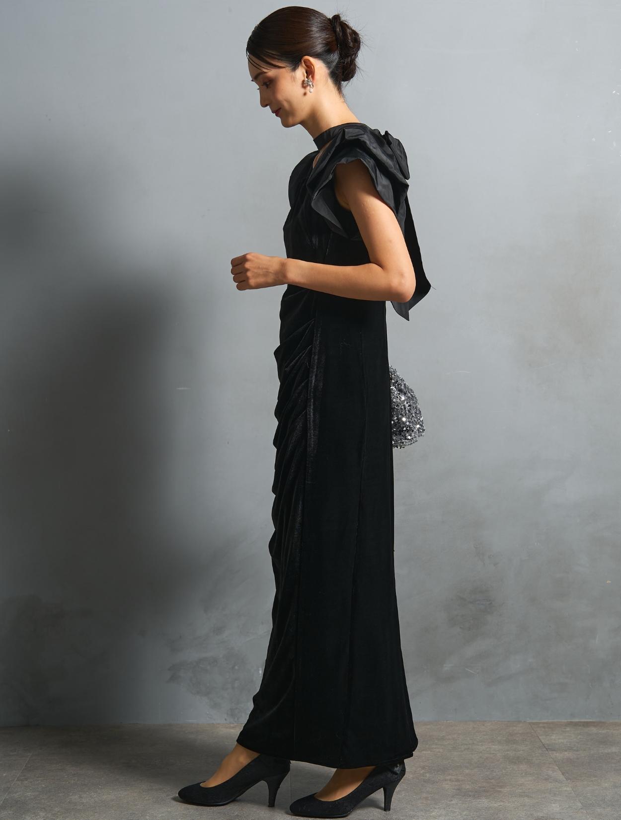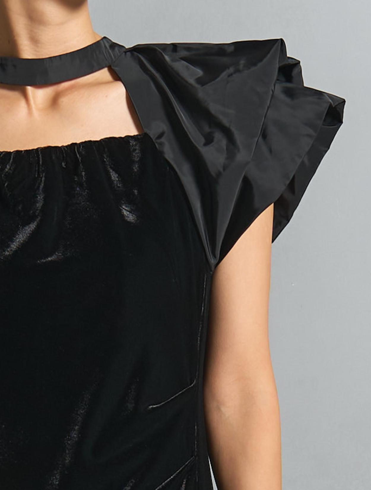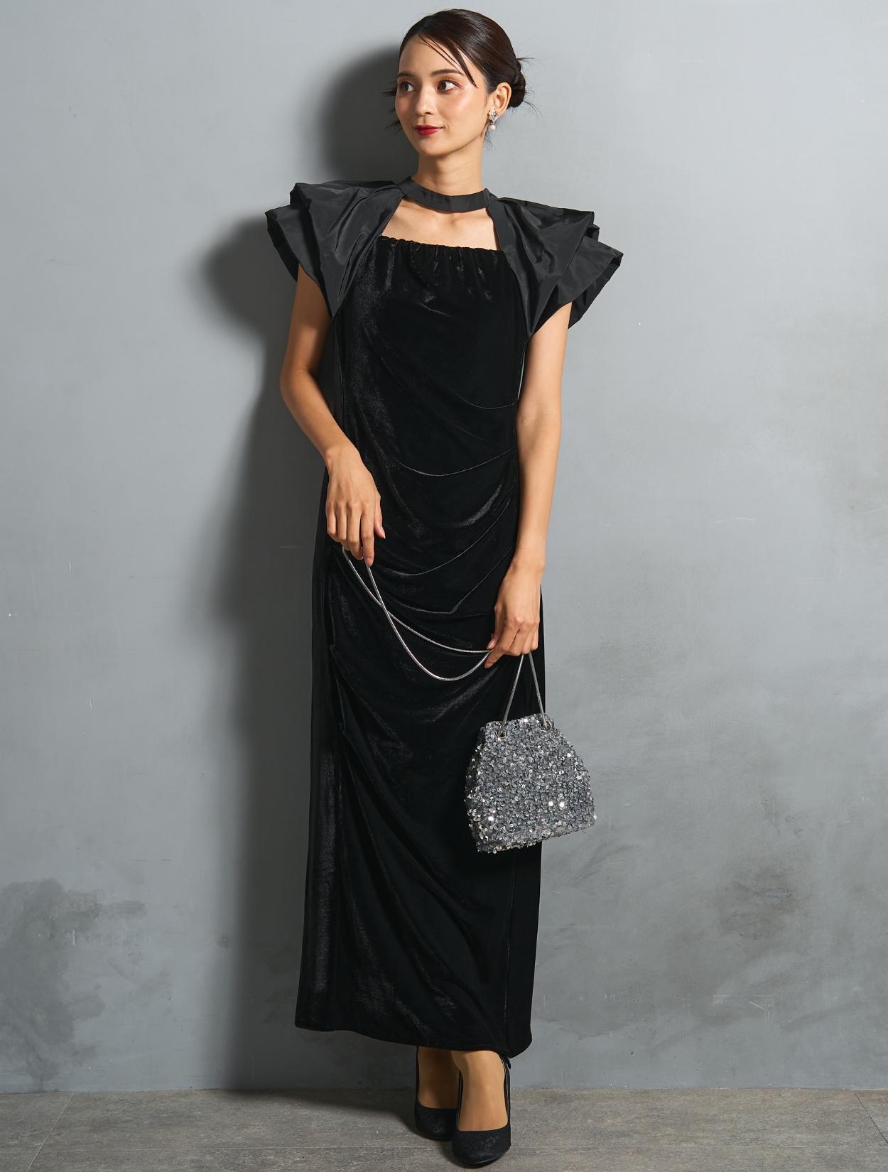 トップにボリュームを持たせたデザインが印象的。写真を撮る時もお顔周りが華やかに見えます。ベロアとは対照的なタフタ生地のお袖は、シャカっとした質感で甘くなりすぎません。硬すぎないハリ感は、袖を通した時に二の腕が細く見えるとのお声も。また、カットアウトのデコルテは、透けない生地のドレスに抜け感を出してくれます。適度な肌見せはフォーマルなシーンでは重要なポイントです。