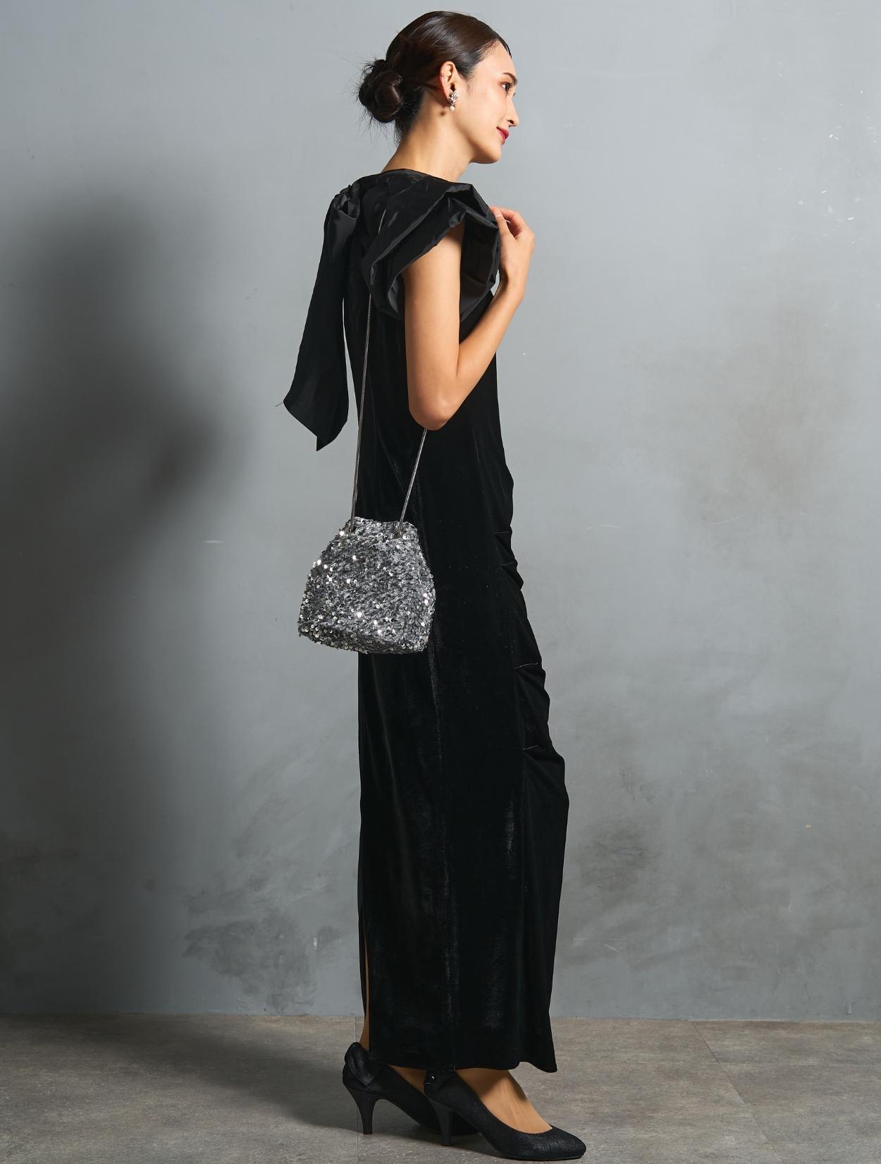 モード感たっぷりのおしゃれで大人っぽいロングドレスにシルバーのスパンコールバッグが映えるコーディネート。シックながらも華やかなパーティー感があります。首元にデザインがあるドレスなので、アクセサリーはネックレスよりイヤリングがおすすめ。キラリと光るパールビジューのイヤリングをセレクトしました。パールのアクセサリーは上品でフォーマル感もあります。