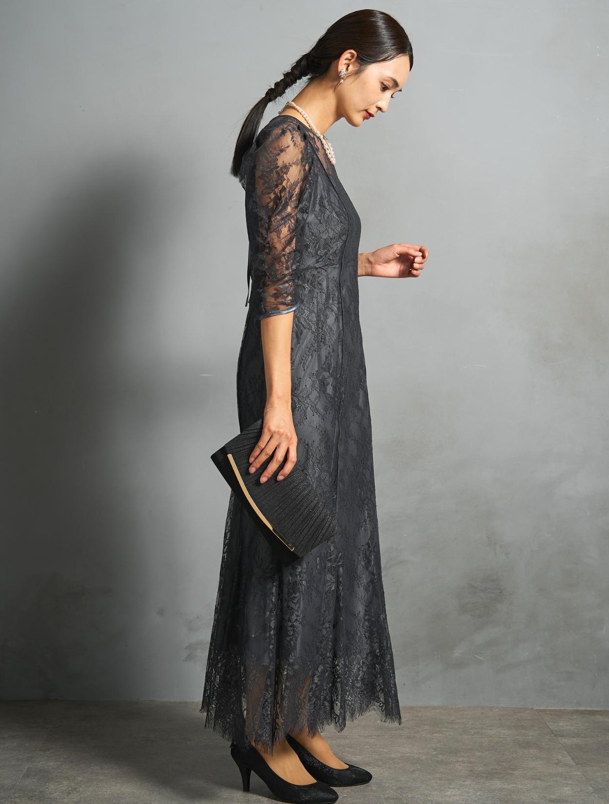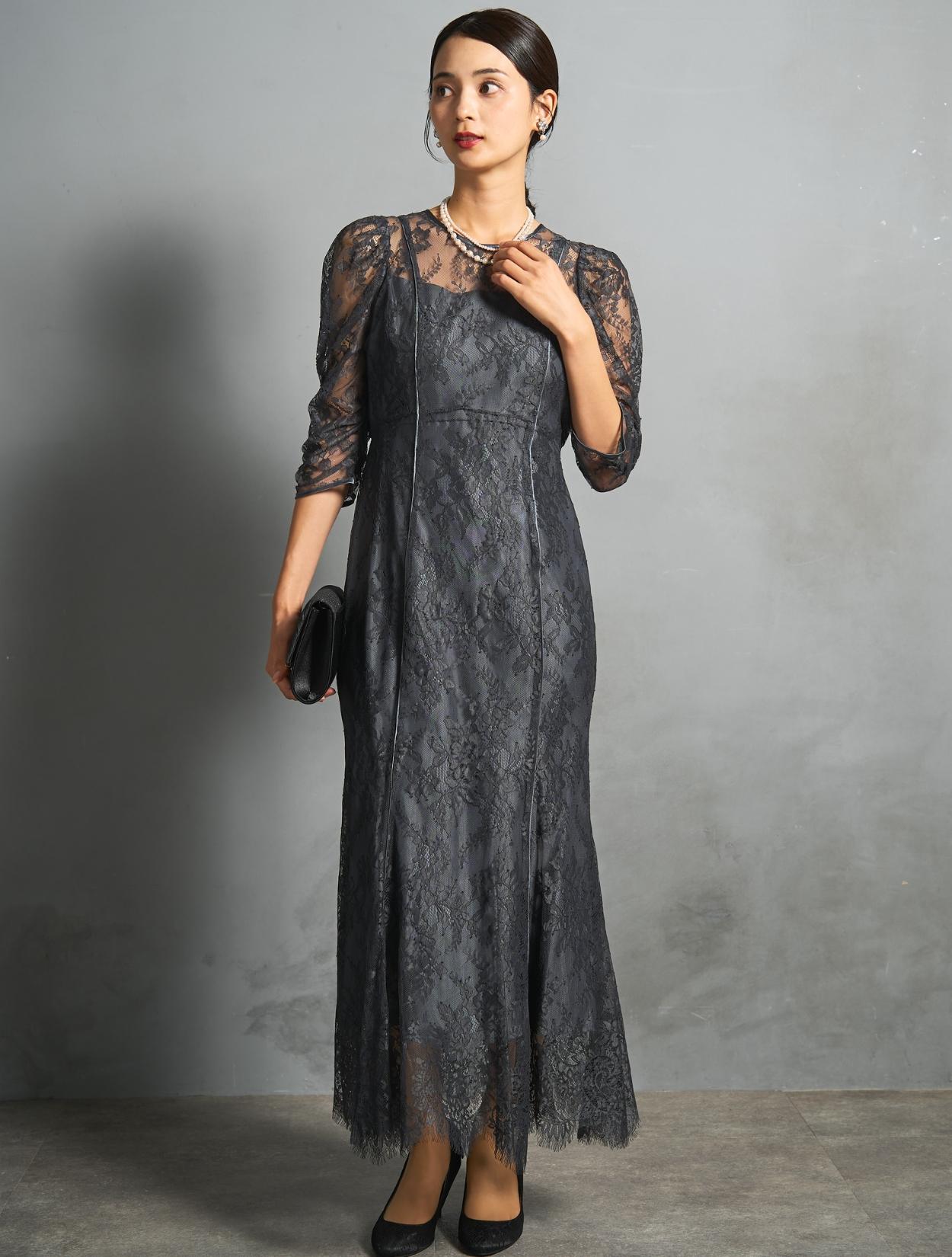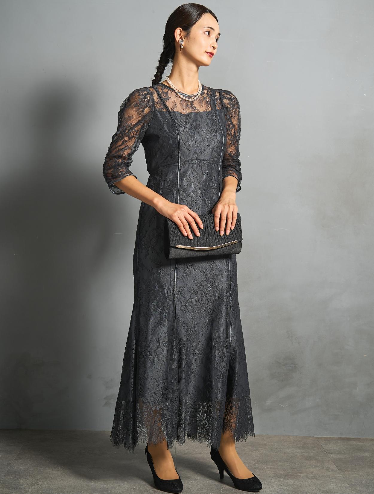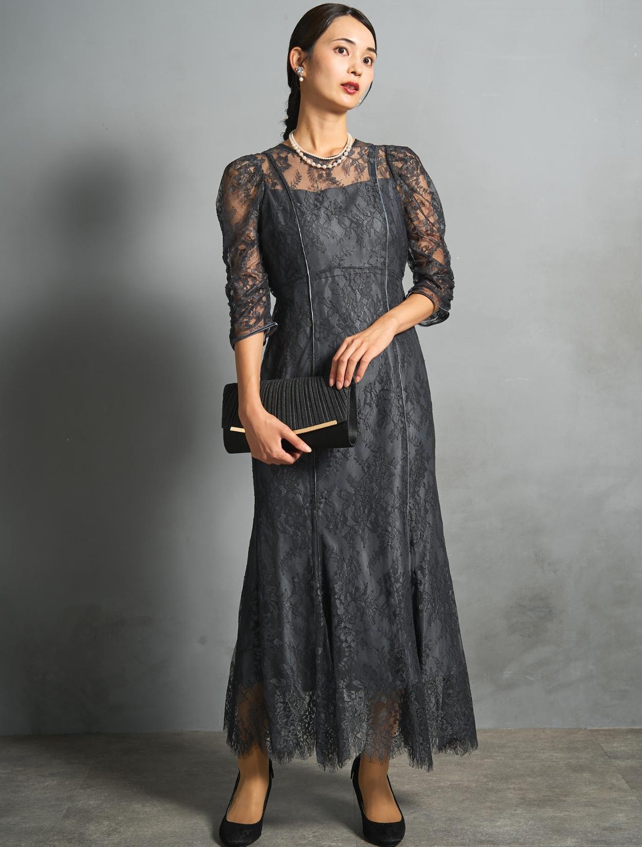 シックなチャコールグレーのレースに、裏地も濃いグレー。レースから透ける裏地の程よい光沢が、意外と華やか。地味に見えずおしゃれな印象で着こなせるカラーです。結婚式のお呼ばれから親族まで幅広く活躍します。