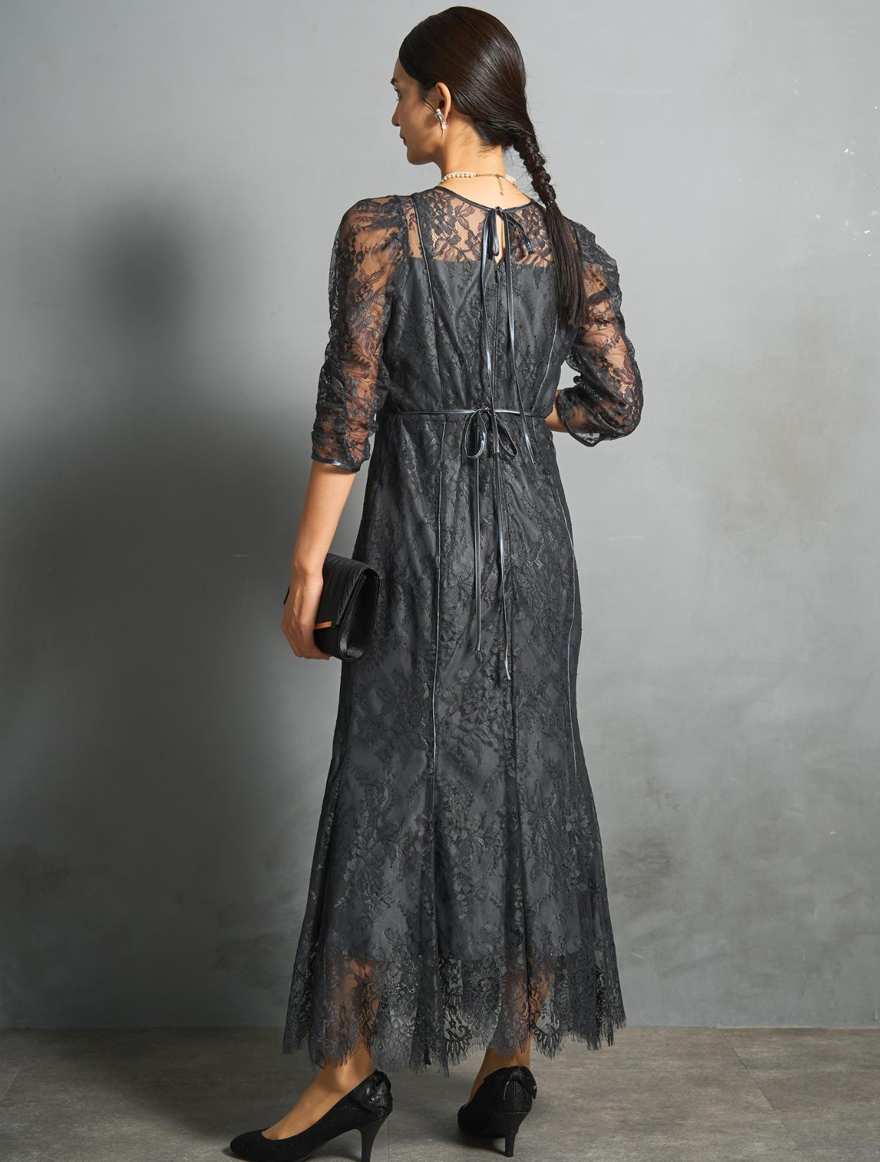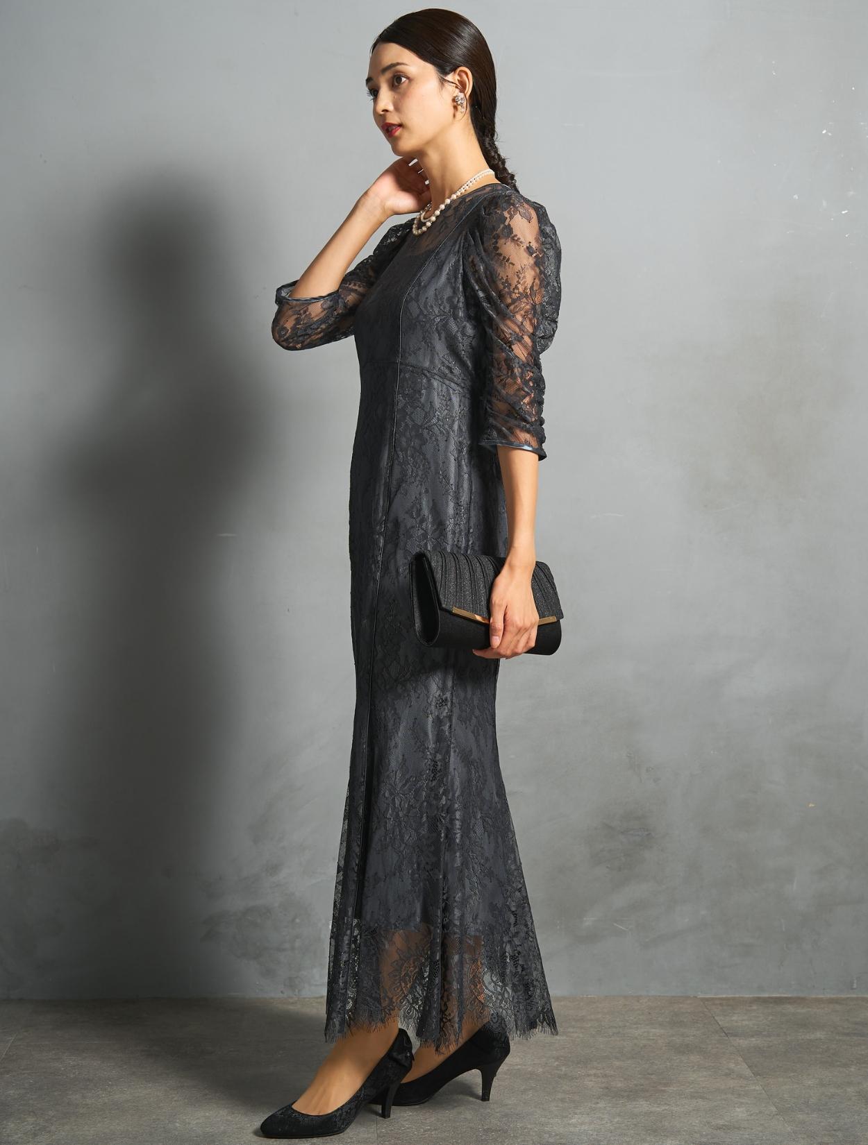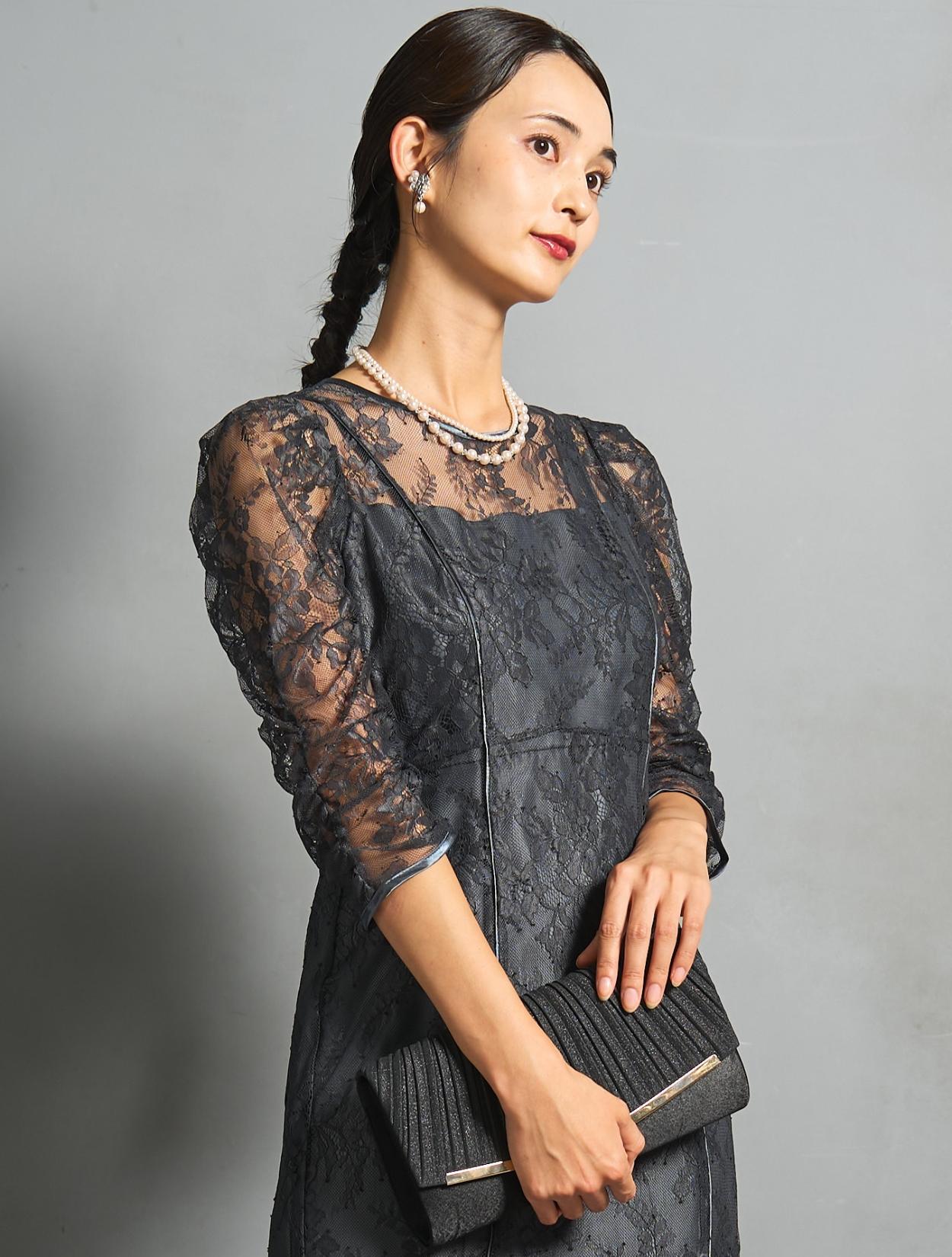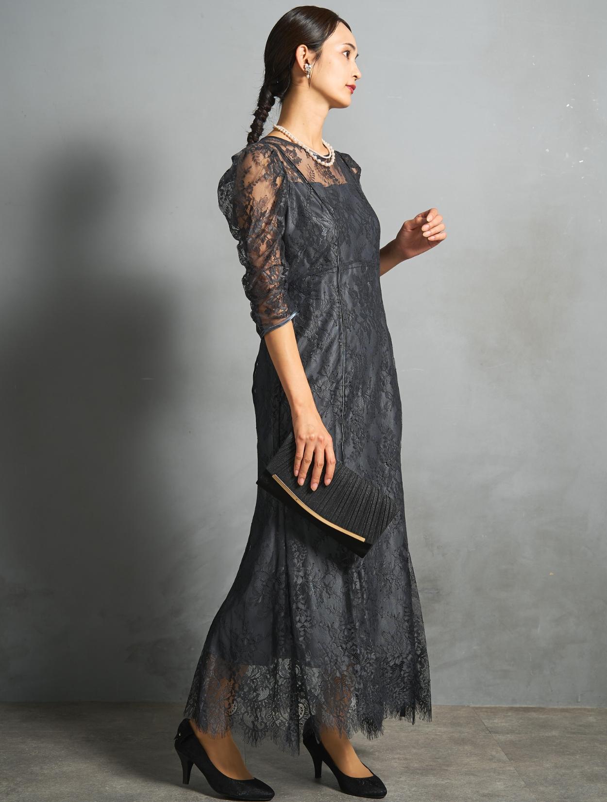 シックなチャコールグレーのレースに、裏地も濃いグレー。レースから透ける裏地の程よい光沢が、意外と華やか。地味に見えずおしゃれな印象で着こなせるカラーです。結婚式のお呼ばれから親族まで幅広く活躍します。
