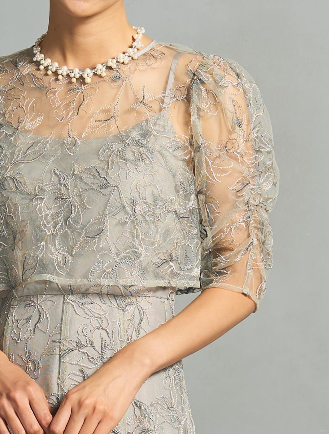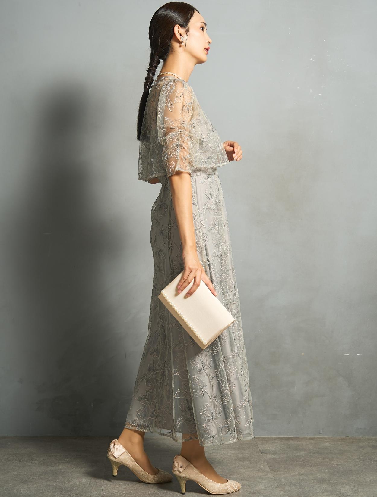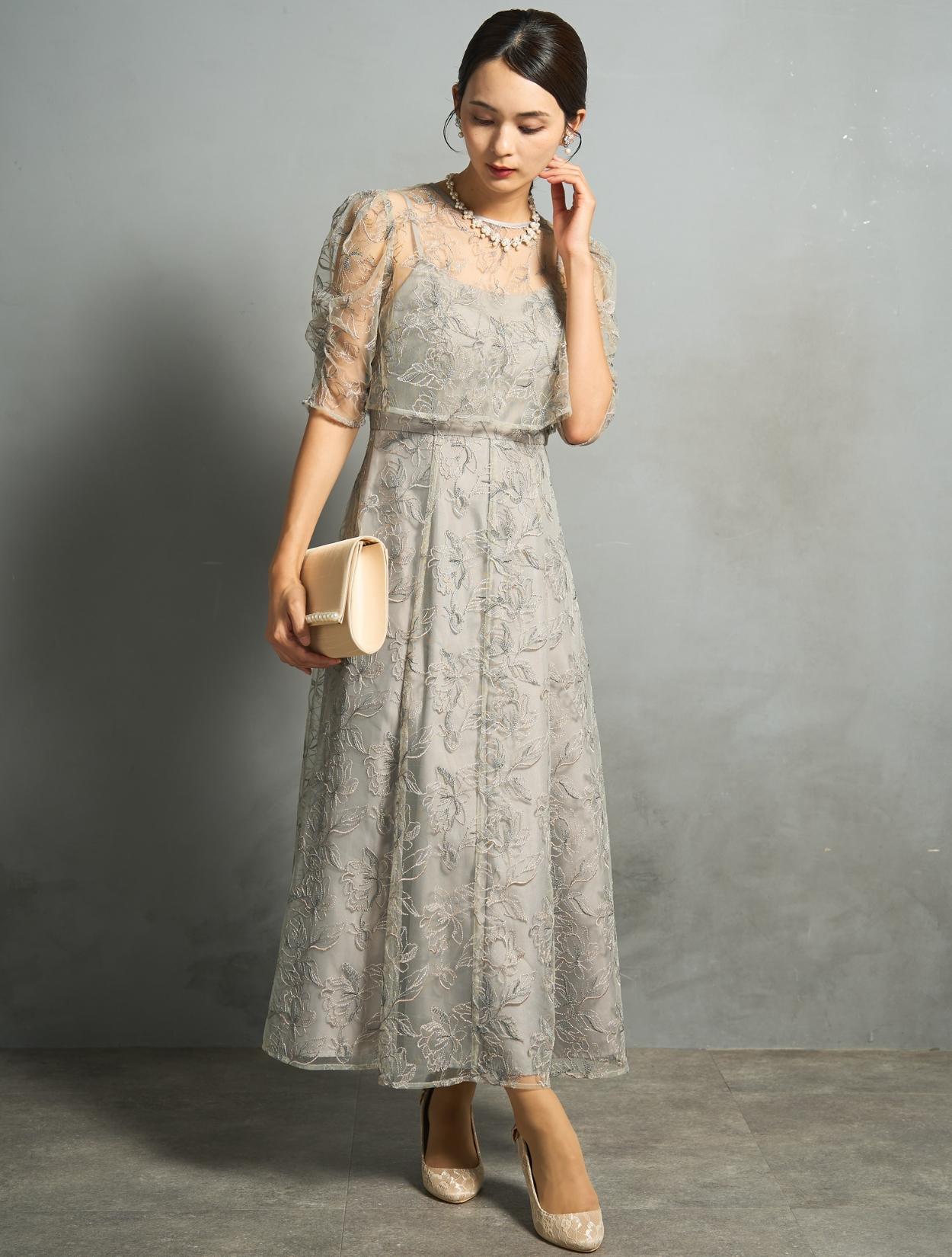 トレンド感のある総レースのレイヤードドレスは、20代30代におすすめです。チャコールグレーは華やかなドレスをお探しの40代にも◎。