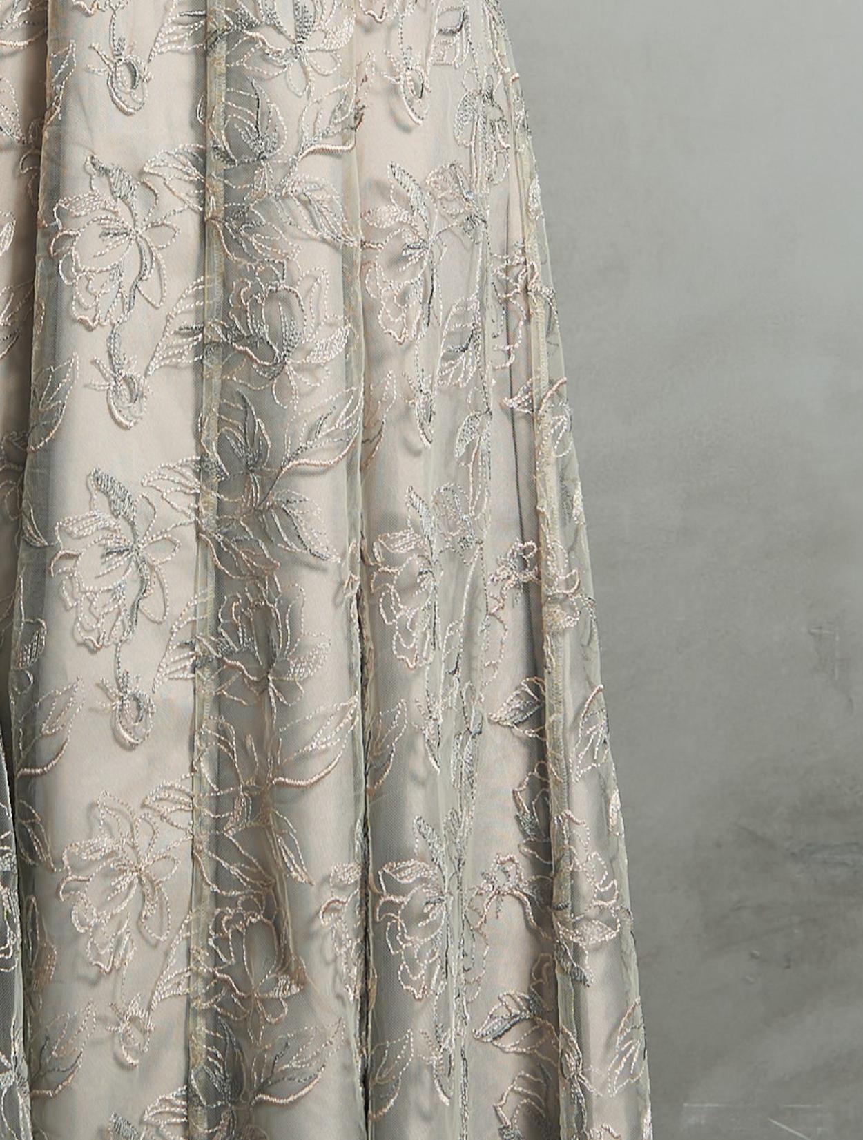 白にグリーンを一滴混ぜたような透明感のあるアイシーグリーンのチュールレース。レースから透けるインナーワンピースは、ニュアンス感があるグレイッシュグリーン。カラードレスでも控えめで上品です。挑戦しやすい人気のカラーです。