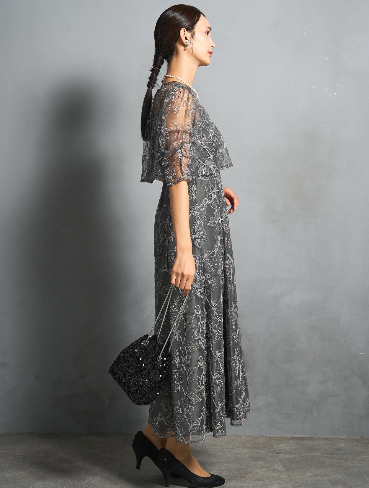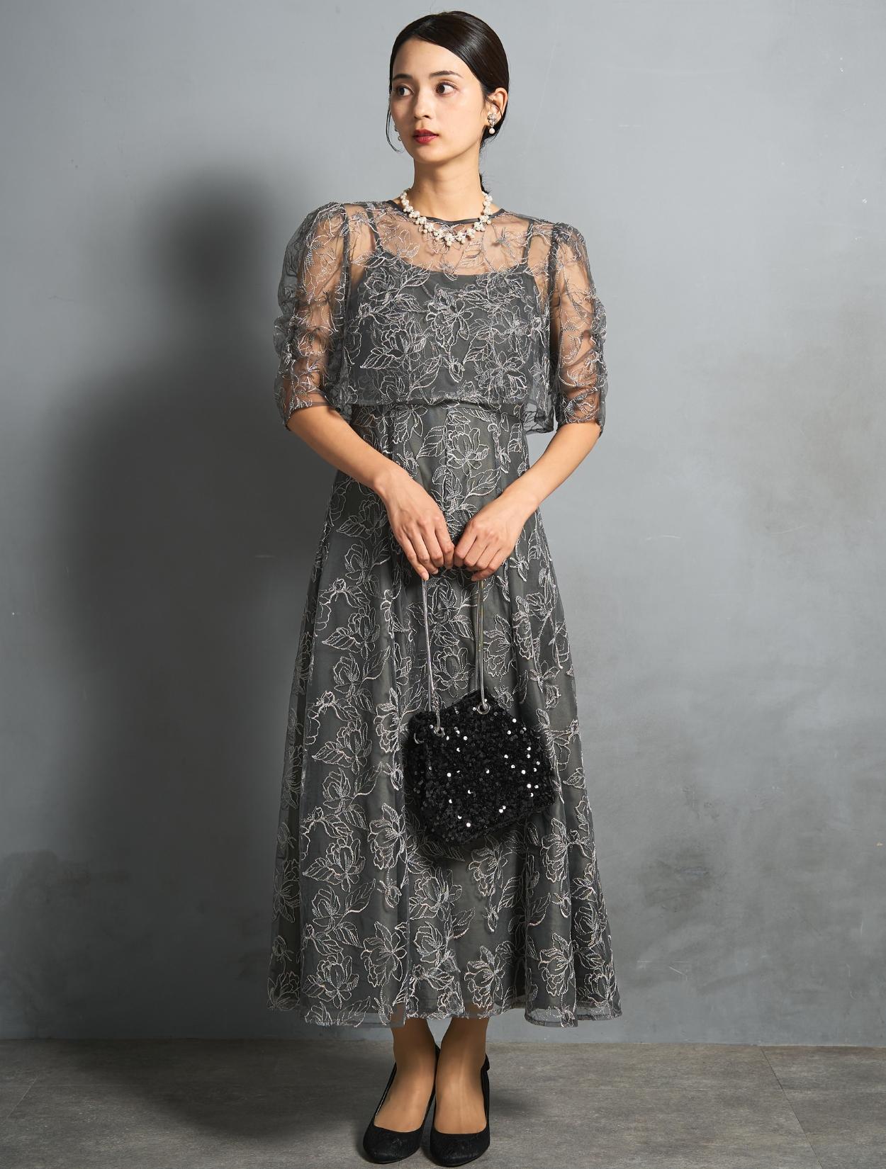 トレンド感のある総レースのレイヤードドレスは、20代30代におすすめです。チャコールグレーは華やかなドレスをお探しの40代にも◎。