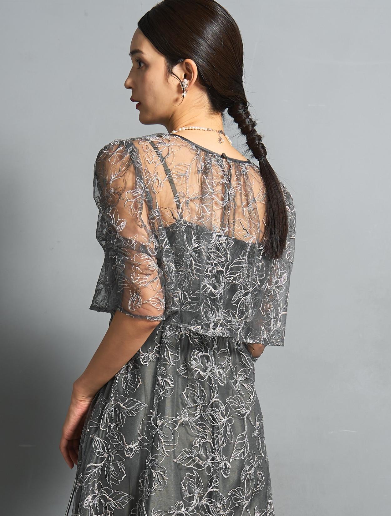 チャコールグレーのチュールレースに、インナーワンピースは緑味のあるカーキグレー。違った色味のグレーを重ねることで立体感が増してメリハリがUPする配色。派手過ぎないけど地味に見えないカラーです。ライトカラーの刺繍が映えるのもポイント。