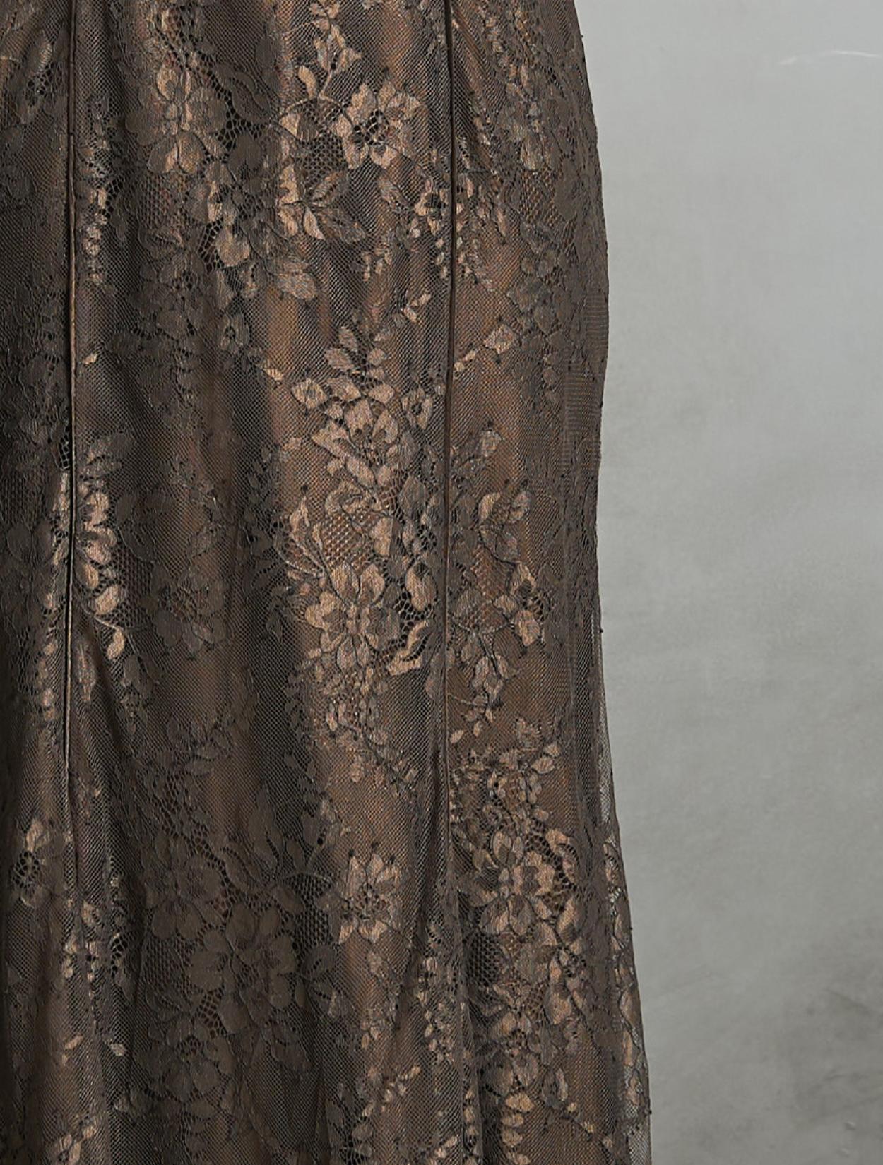 エレガントで大人っぽいマーメイドラインがポイントのロングドレス。すっきりスタイルを良く見せてくれるドレスです。フラワー柄の総レースなので華やかさもあり。スカラップ調にレースがカットされた裾は、動くと目を引くキレイめなデザイン。透け感がありロング丈でも軽やかに着こなせます。