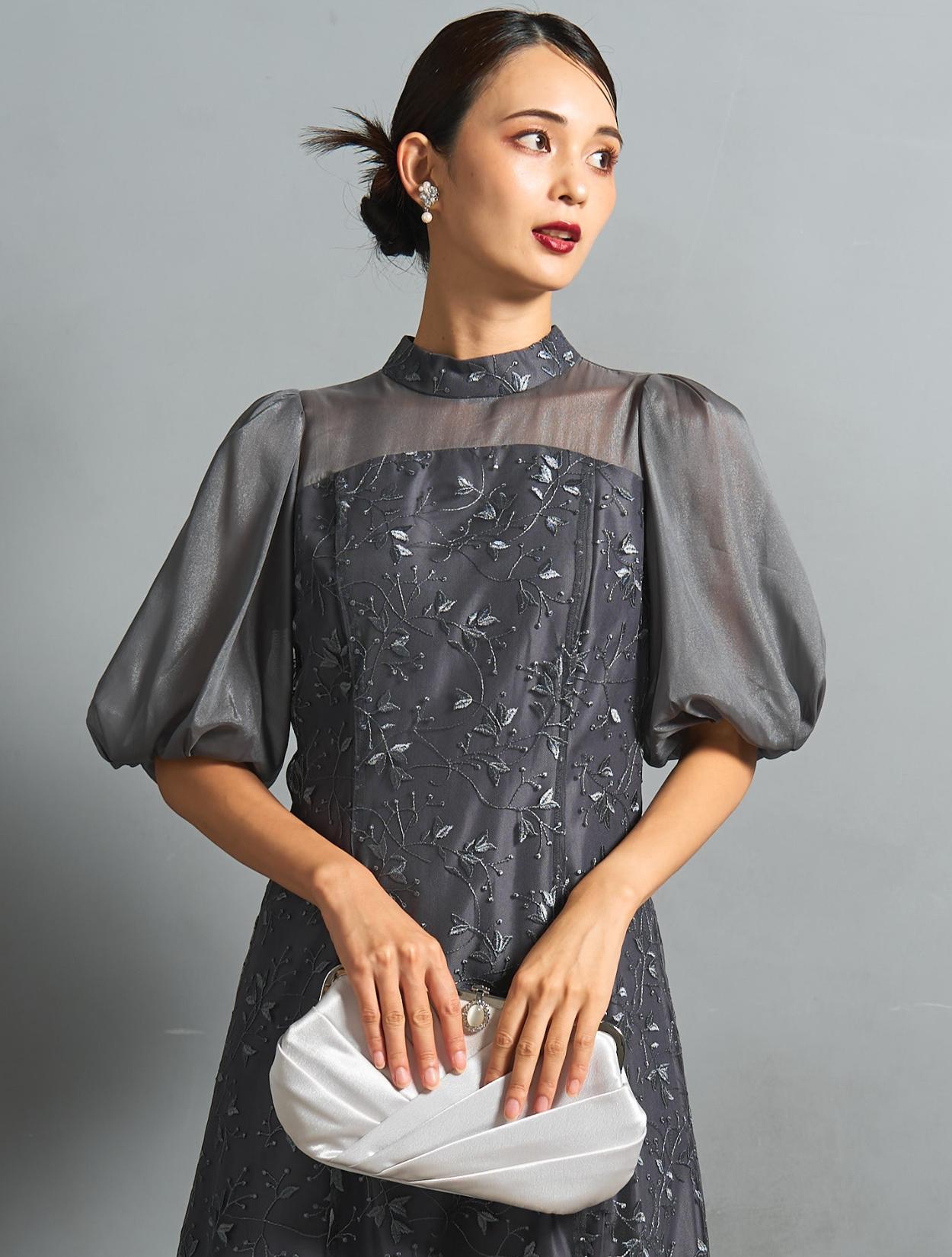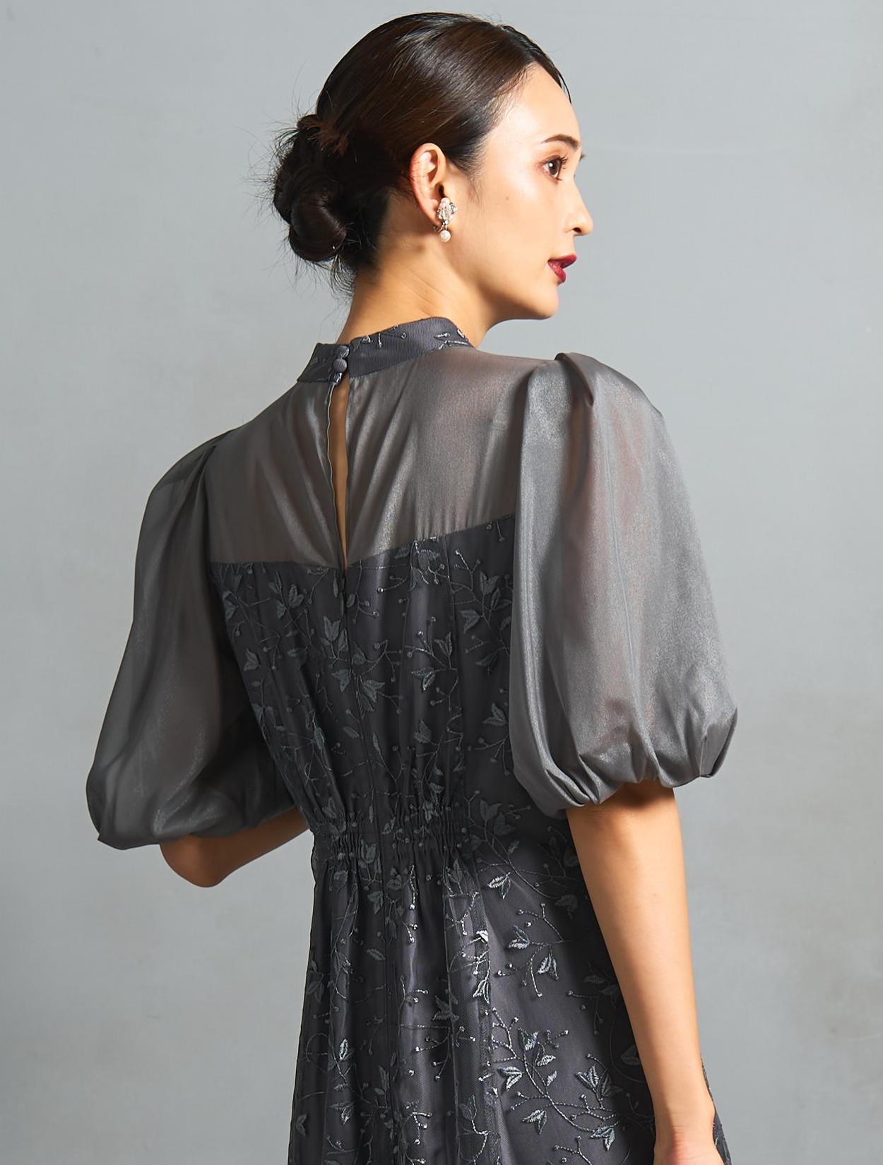 プチハイネックのデザインとオーガンジーのバルーンスリーブは、華奢な上半身がお悩みの方でもキレイにカバーして着られます。程よくフィットする上半身からウエストライン、上品な広がりのフレアスカートは、どんな方でもスッキリ着痩せ効果あり。