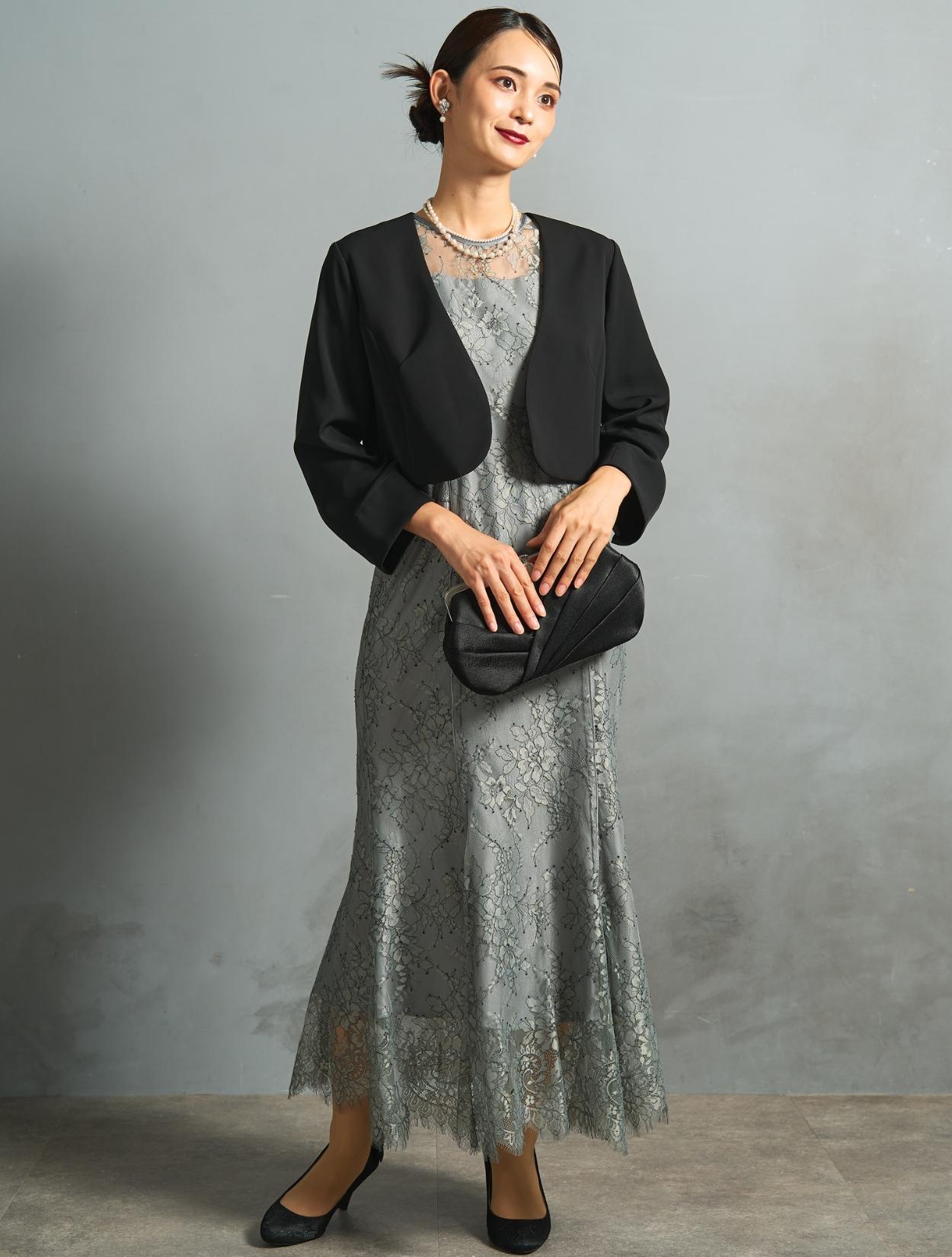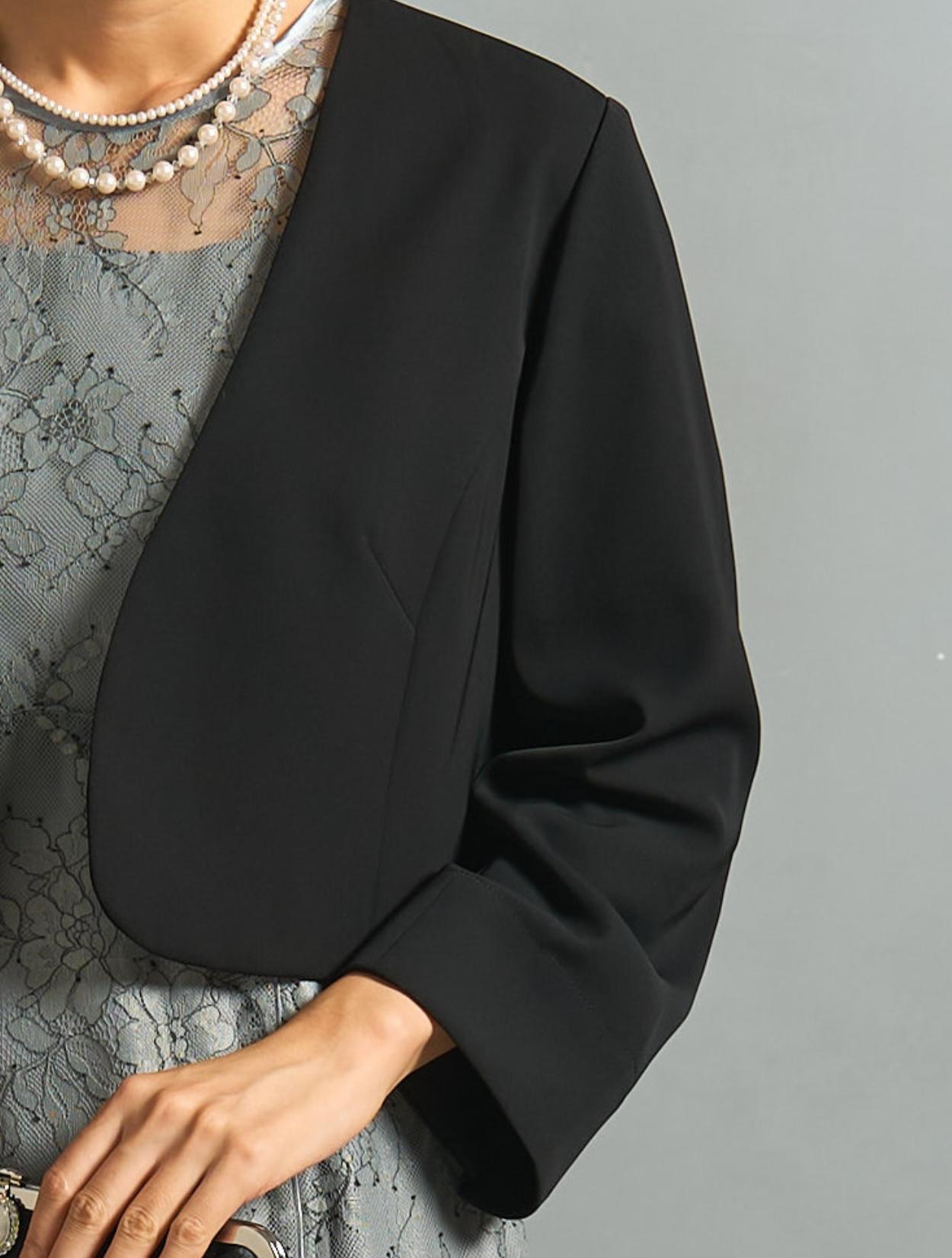 ノーカラーのすっきりしたジャケットを合わせた落ち着きのあるコーディネート。ブラックのジャケットは、カラードレスを控えめにコーディネートしてくれます。親族にもおすすめ。上品なサテン生地のシンプルなパーティーバッグは、程よい光沢感をプラス。様々なシーンや立場で活躍します。アクセサリーは上品な2連のネックレス。2種類の異なる粒のパールは、控えめながらもお顔周りを明るくしてくれます。