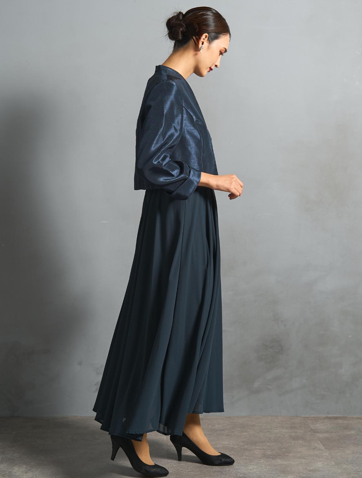 ネイビーのロングドレスにネイビーのシャンタンジャケットを合わせたフォーマル度の高いコーディネート。親族や新郎新婦のお母様にもご利用いただいているコーディネートです。落ち着きのあるブラックのレースバッグは、レースの柄が控えめながらも華やかなポイントに。シンプルなデザインのネックレスは、ポイントを下げてすっきりと見えるデザインです。