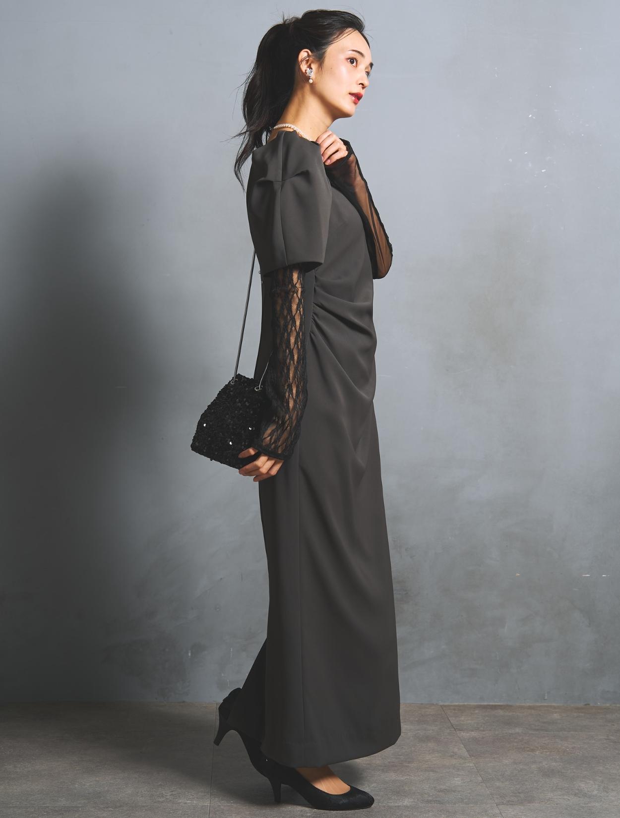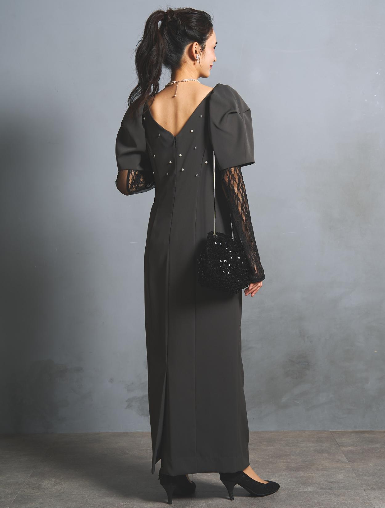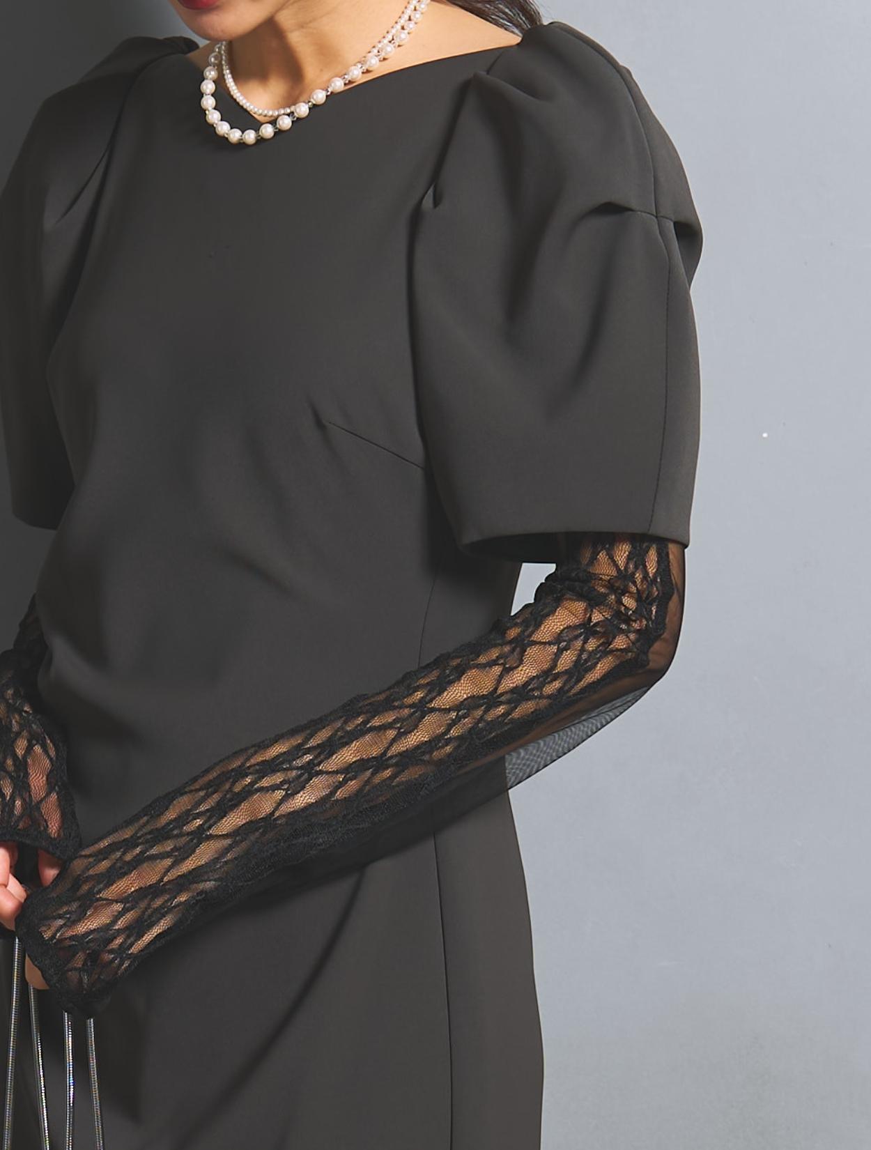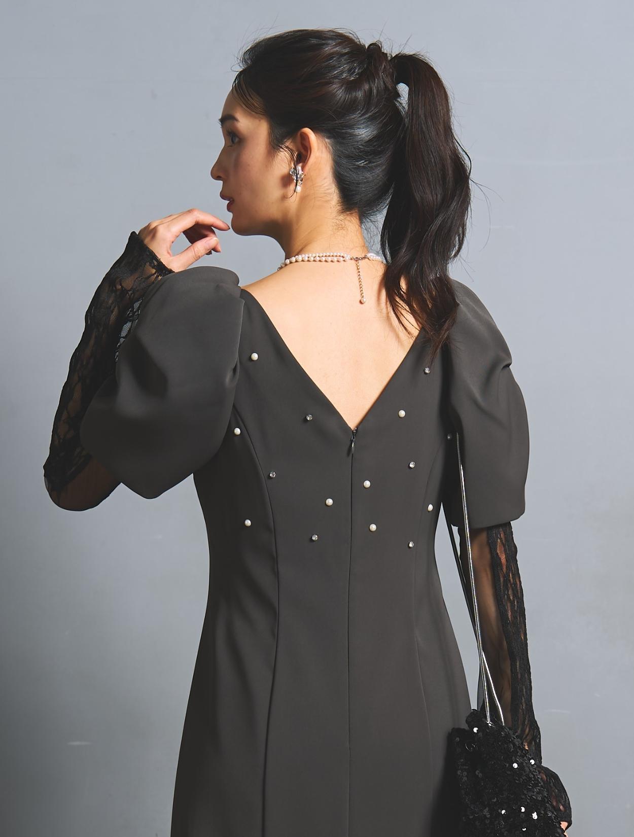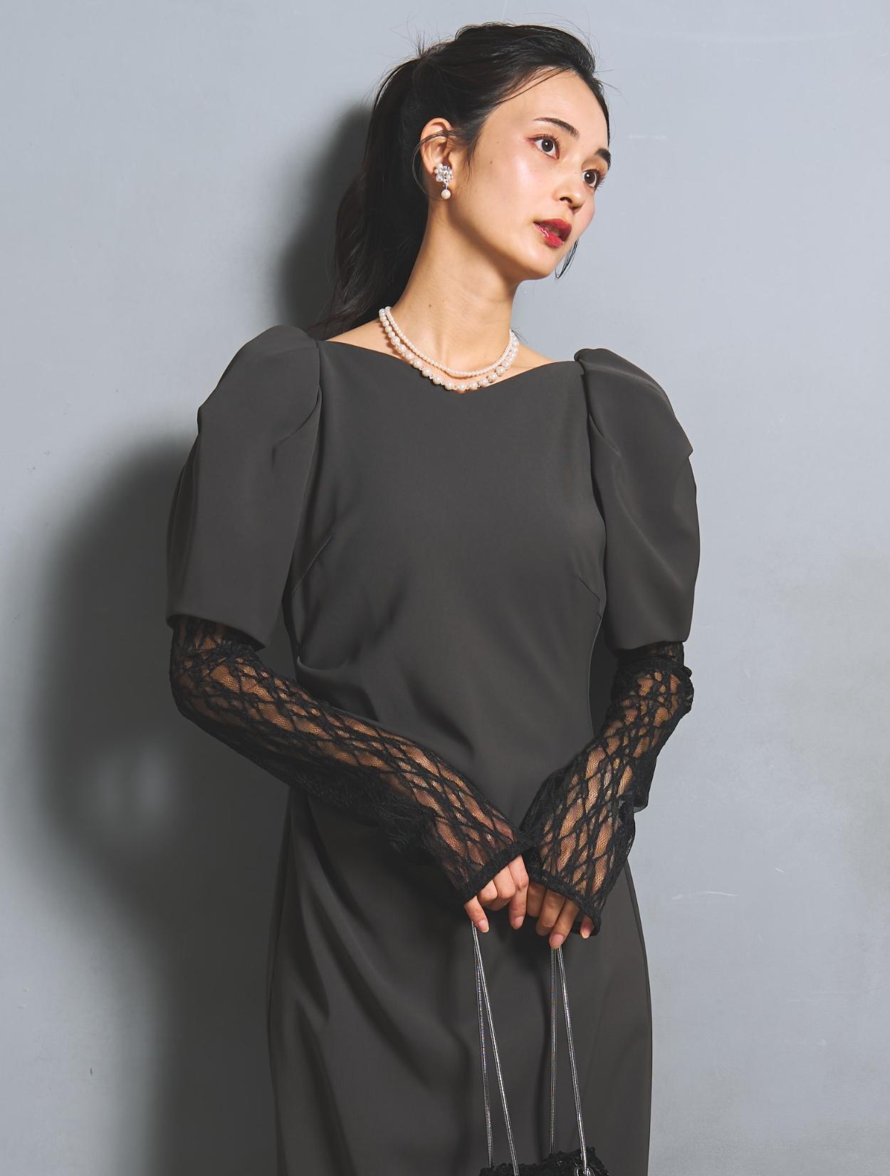 さり気なく印象付けてくれる背中のパールとクリスタルビジュー。バックスタイルにも遊び心があり、360度自信が持てるドレスです。付属のアームカバーは、レースとチュールの切替え。ストレッチが効いているので機能的にも◎。アームカバーを付けると、一気にモードな雰囲気に。