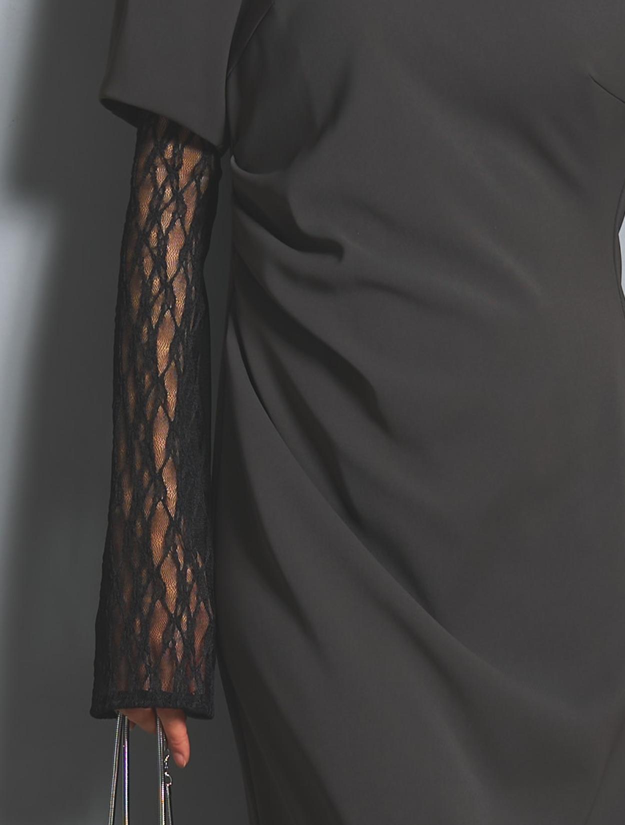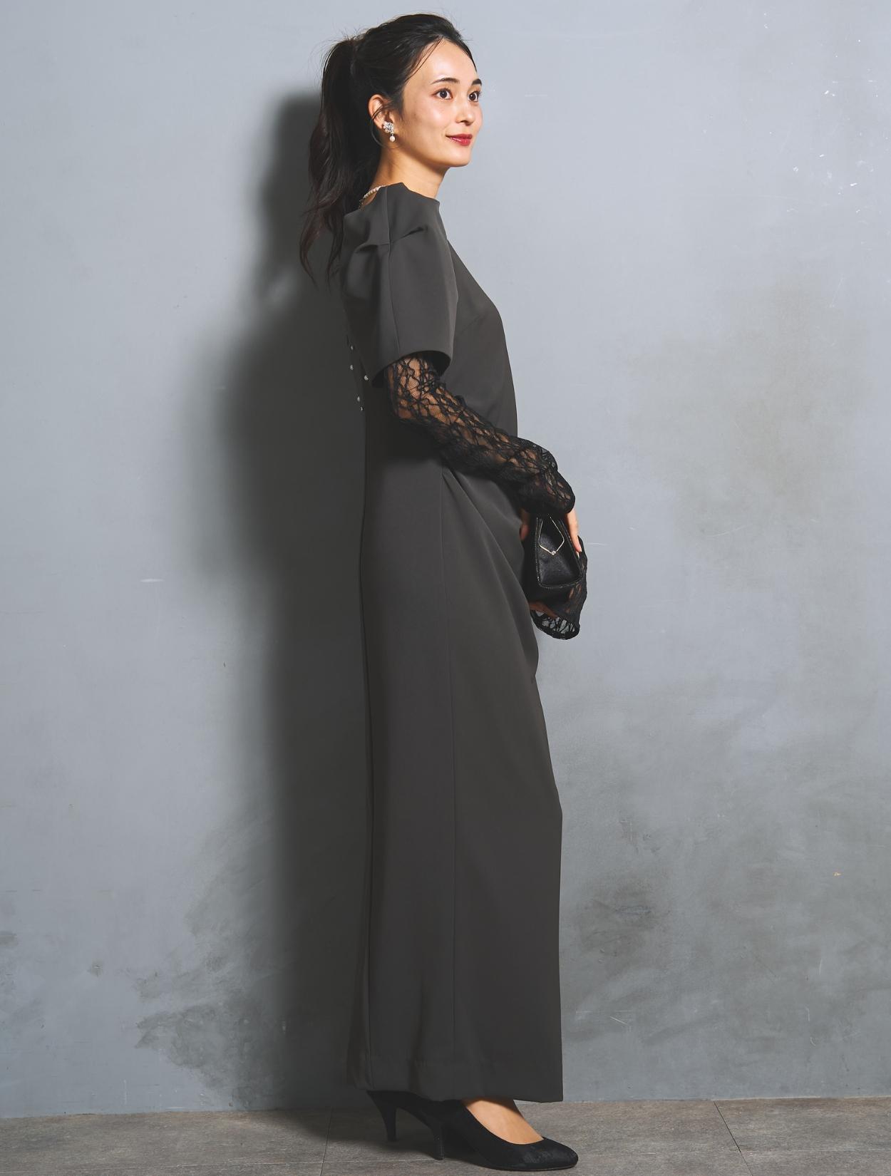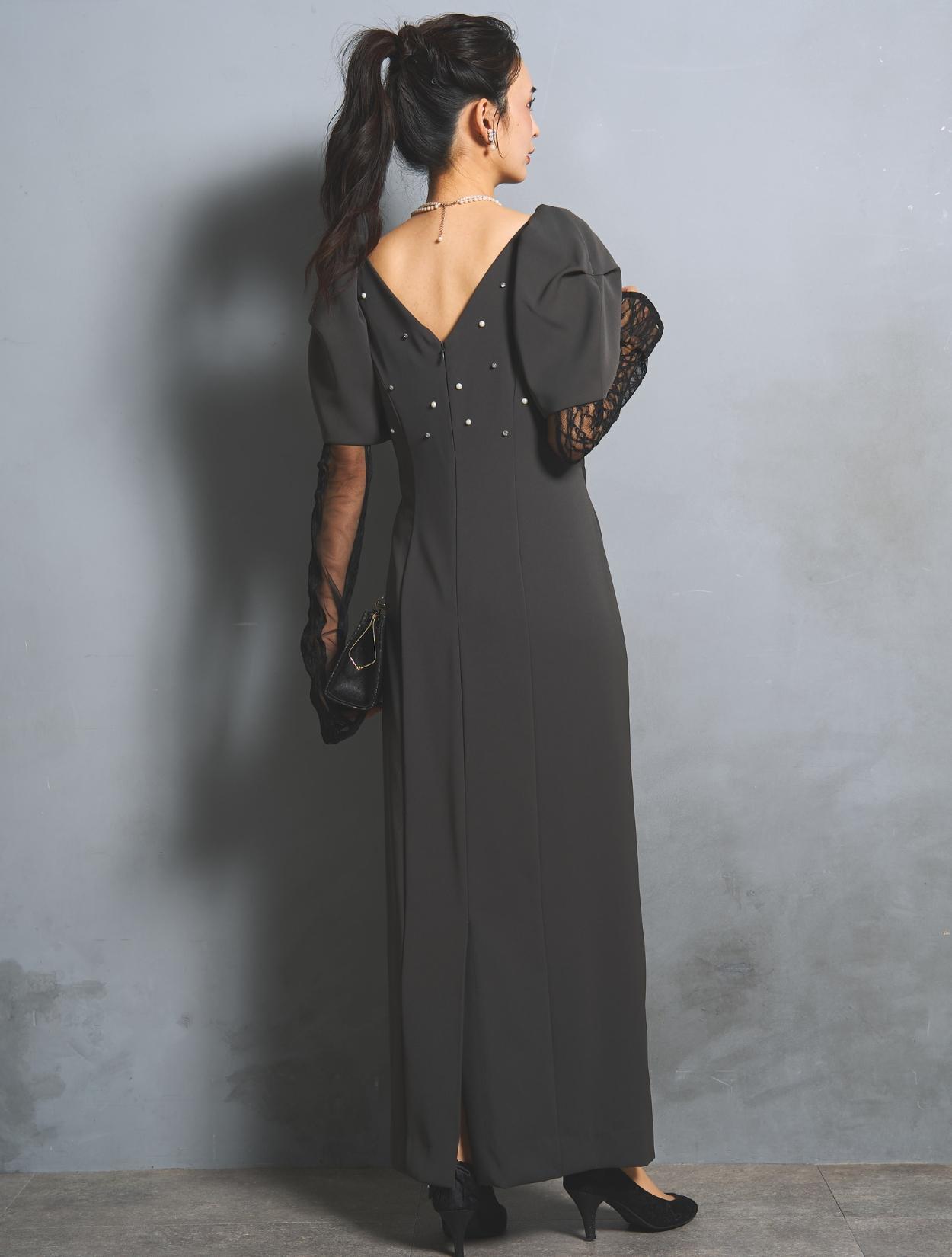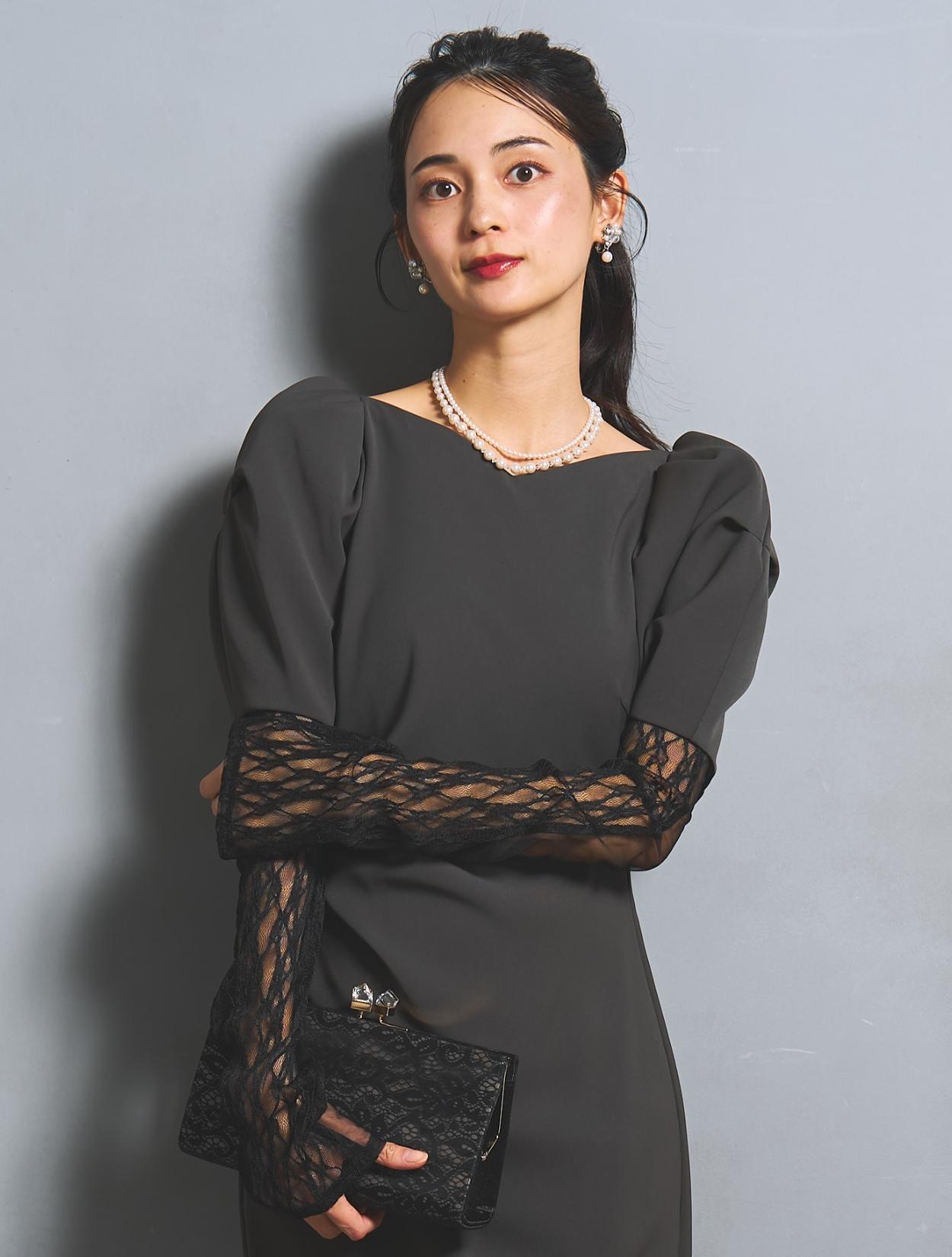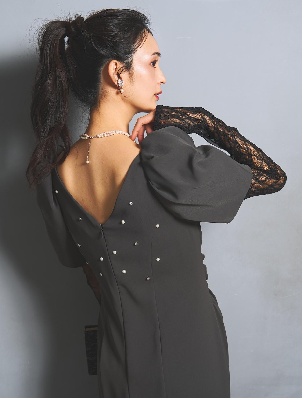 さり気なく印象付けてくれる背中のパールとクリスタルビジュー。バックスタイルにも遊び心があり、360度自信が持てるドレスです。付属のアームカバーは、レースとチュールの切替え。ストレッチが効いているので機能的にも◎。アームカバーを付けると、一気にモードな雰囲気に。