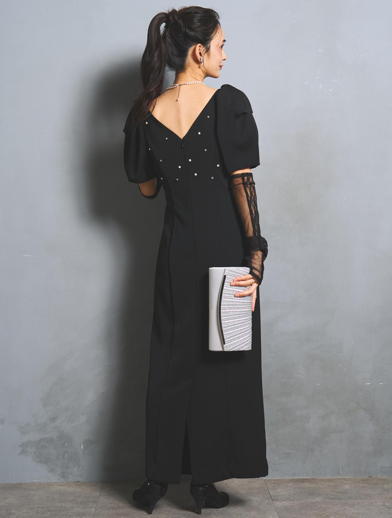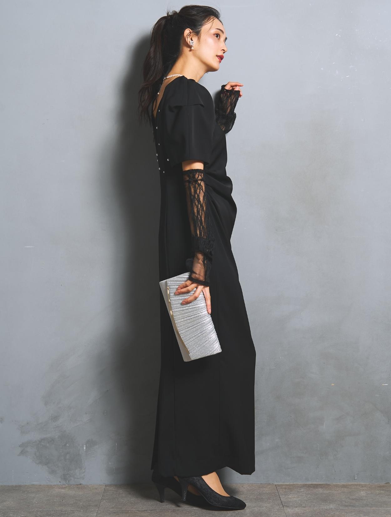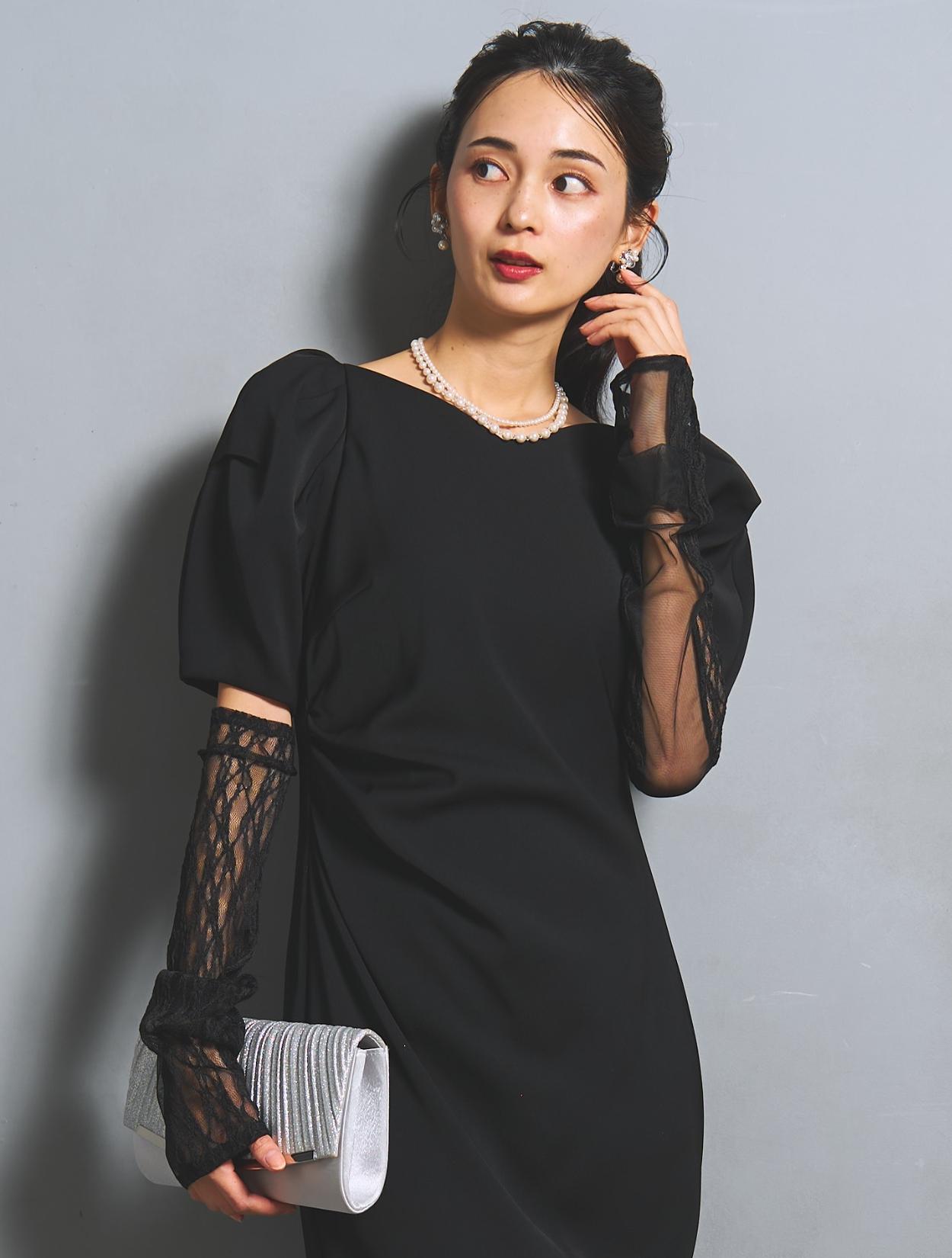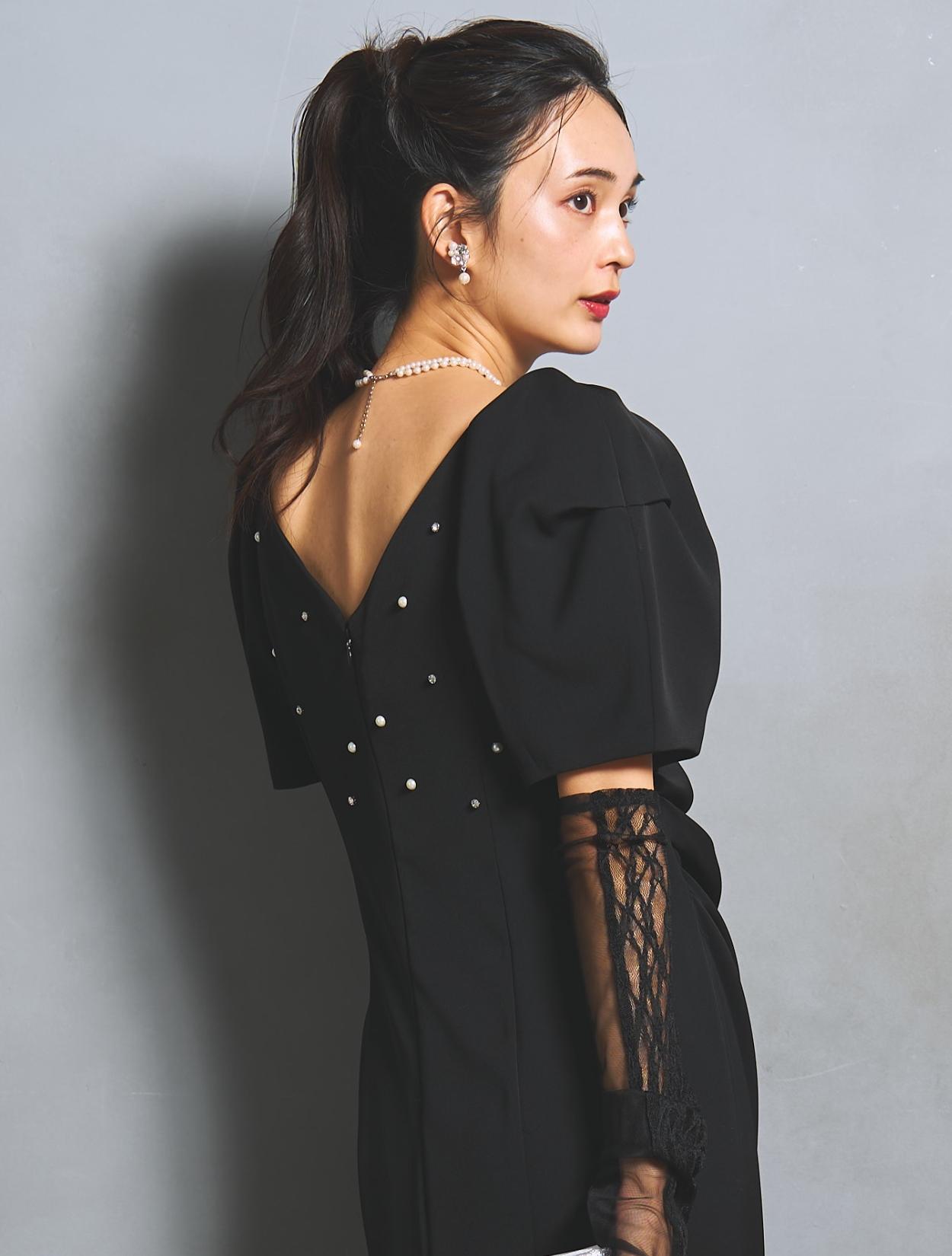 さり気なく印象付けてくれる背中のパールとクリスタルビジュー。バックスタイルにも遊び心があり、360度自信が持てるドレスです。付属のアームカバーは、レースとチュールの切替え。ストレッチが効いているので機能的にも◎。アームカバーを付けると、一気にモードな雰囲気に。