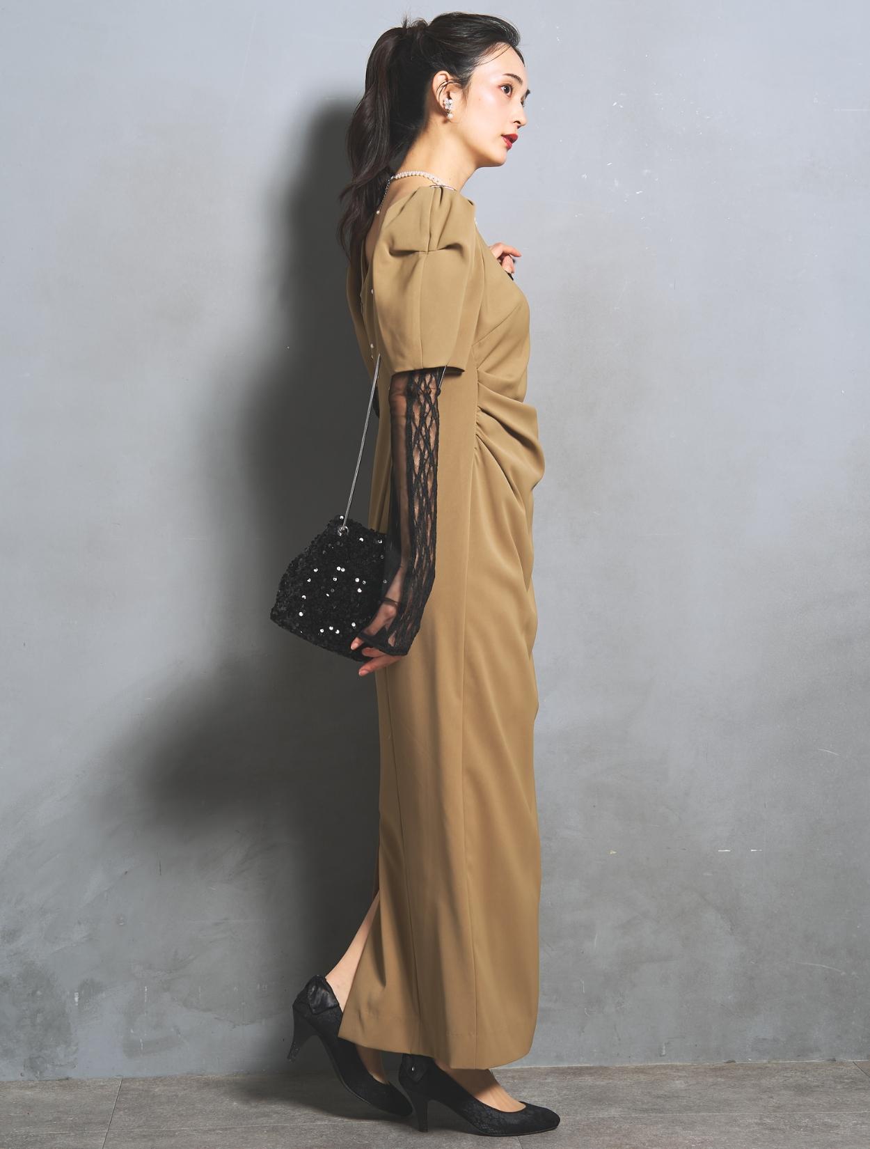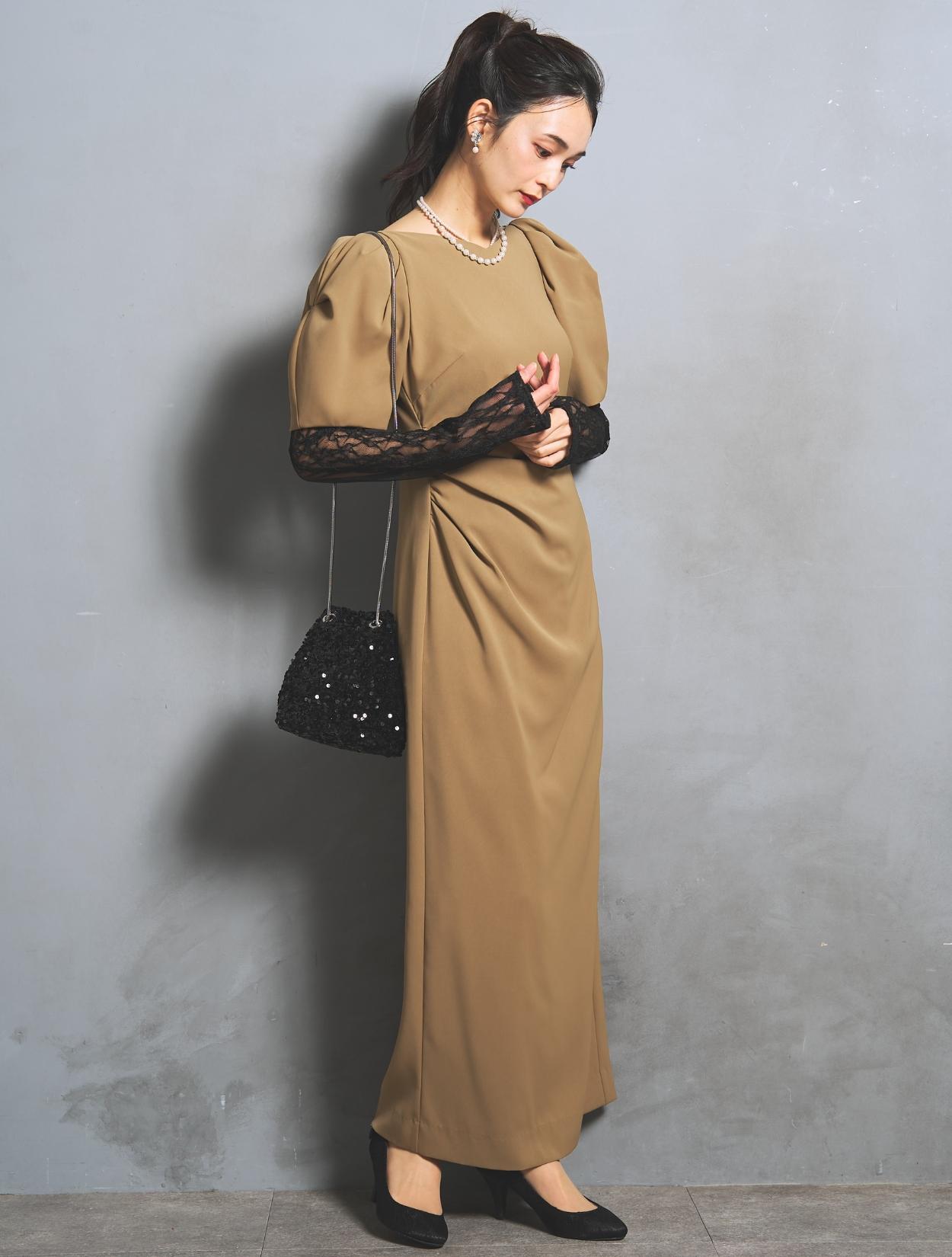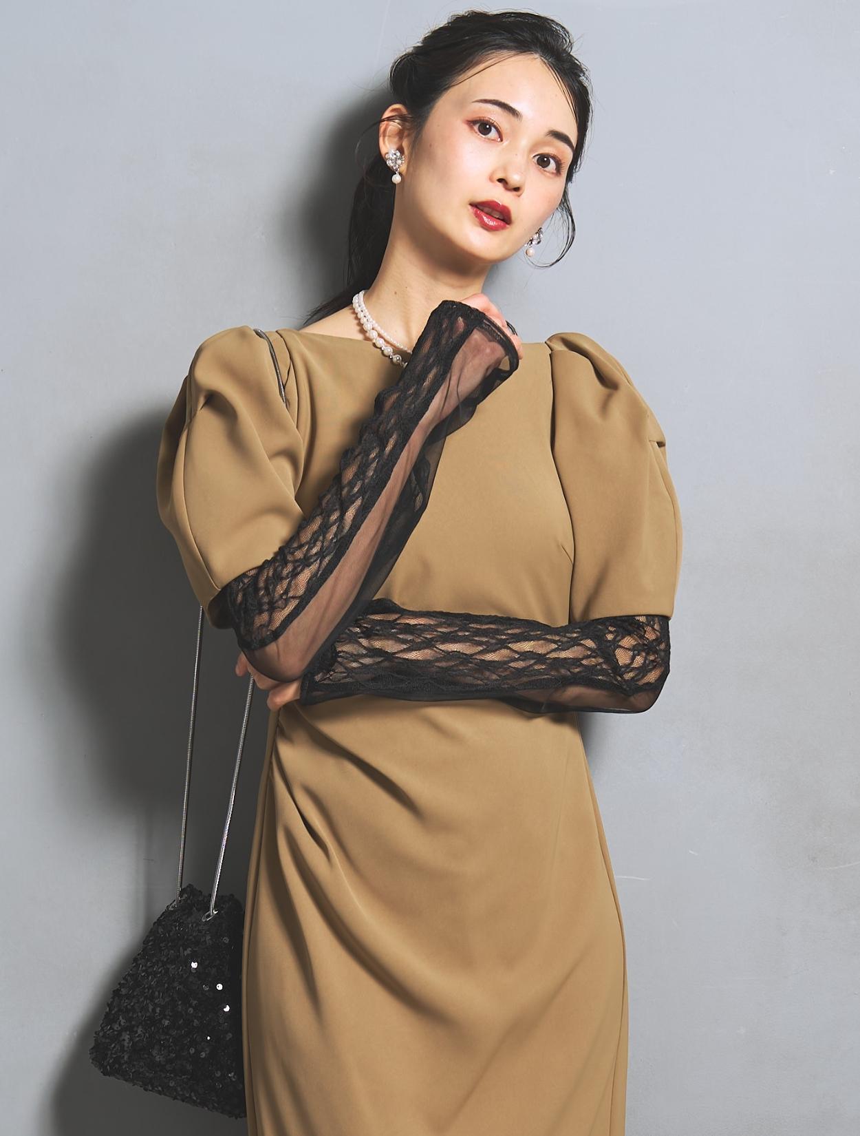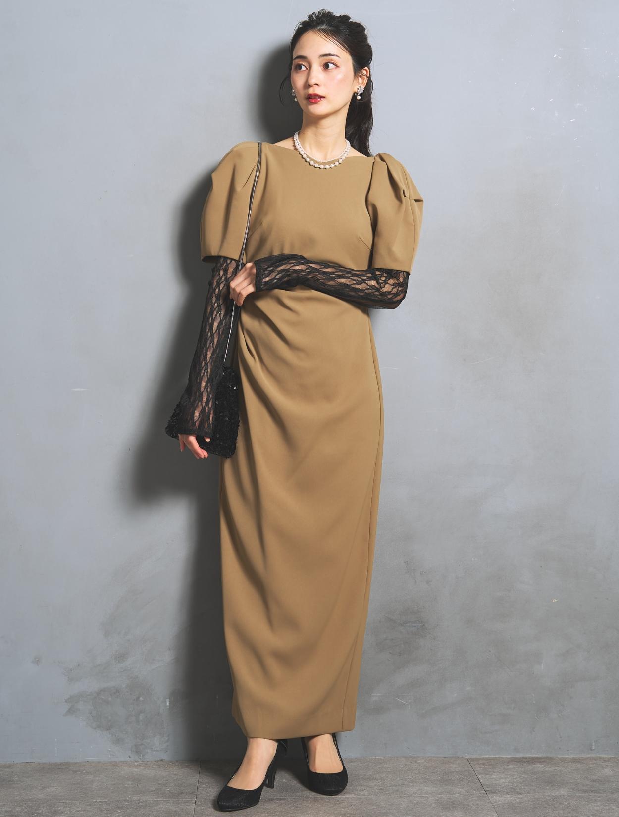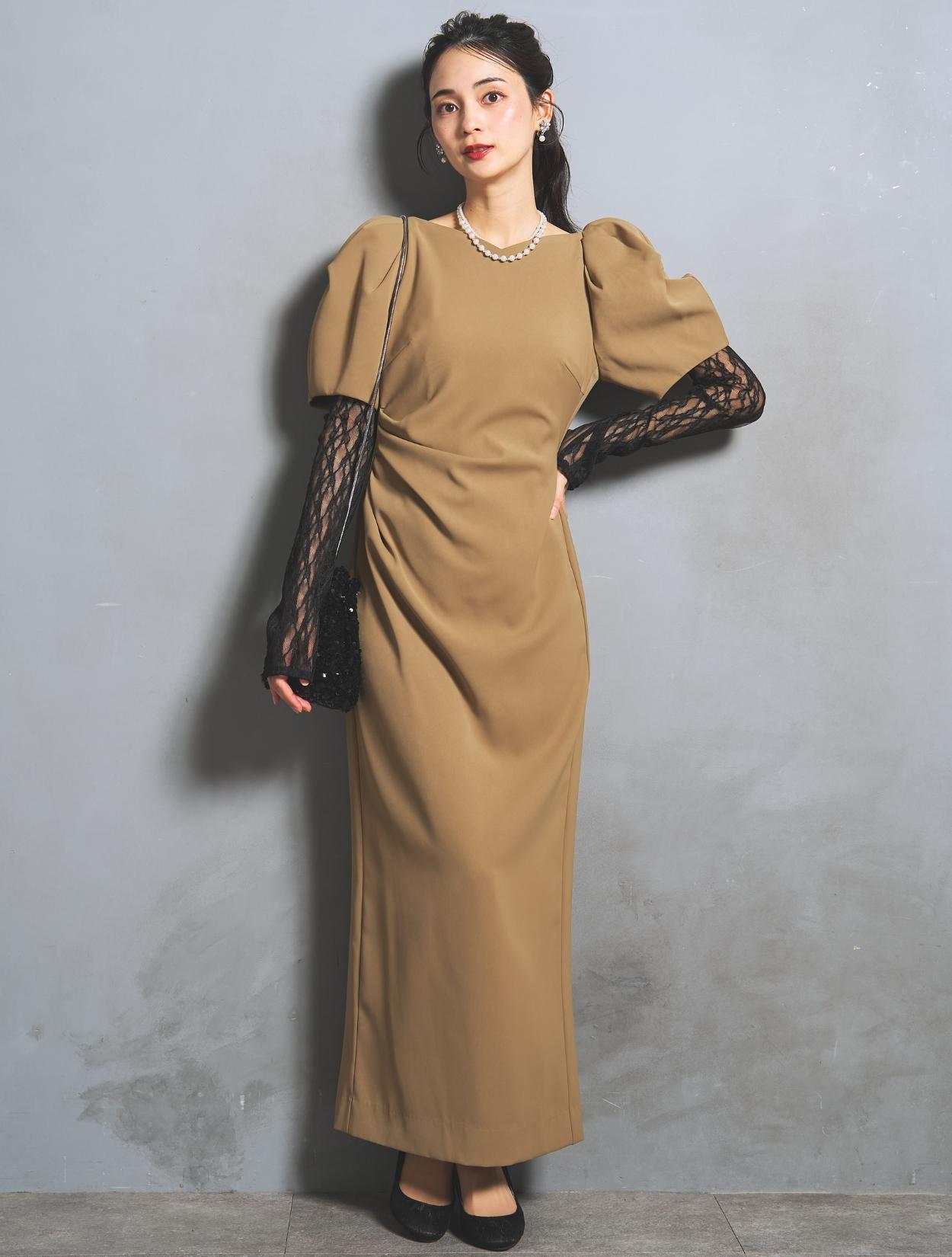 若干赤みを感じるキャメルベージュ。色味がはっきりあるベージュなので、結婚式でも安心して着られます。また、ボヤッと見えないのも嬉しいポイント。アームカバーのブラックとのコントラストが楽しめます。