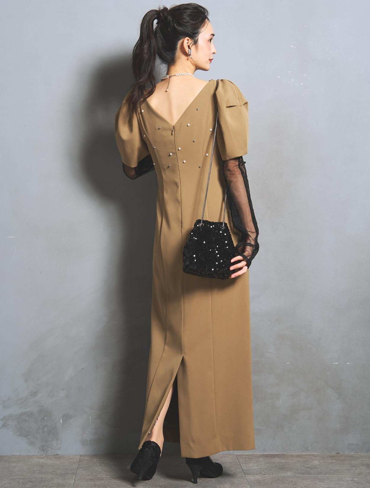 アームカバーのカラーに合わせたブラックのバッグをコーディネート。全体をベーシックカラーの2色でまとめているので、フォーマル感もあり。人気のスパンコールバッグは、トレンド感のあるおすすめアイテム。ドレスの正面はシンプルなデザインなので、パールのネックレスが良く映えて◎。バックスタイルのパールともリンクします。