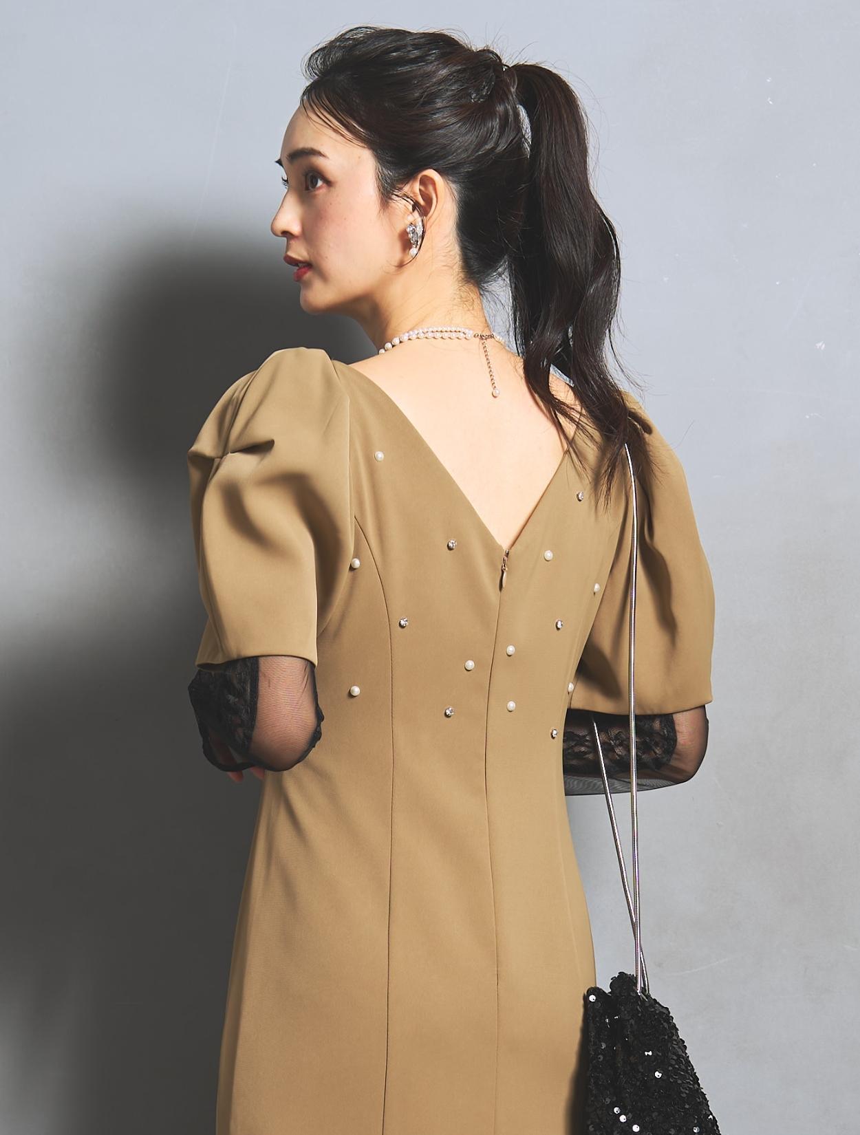 さり気なく印象付けてくれる背中のパールとクリスタルビジュー。バックスタイルにも遊び心があり、360度自信が持てるドレスです。付属のアームカバーは、レースとチュールの切替え。ストレッチが効いているので機能的にも◎。アームカバーを付けると、一気にモードな雰囲気に。