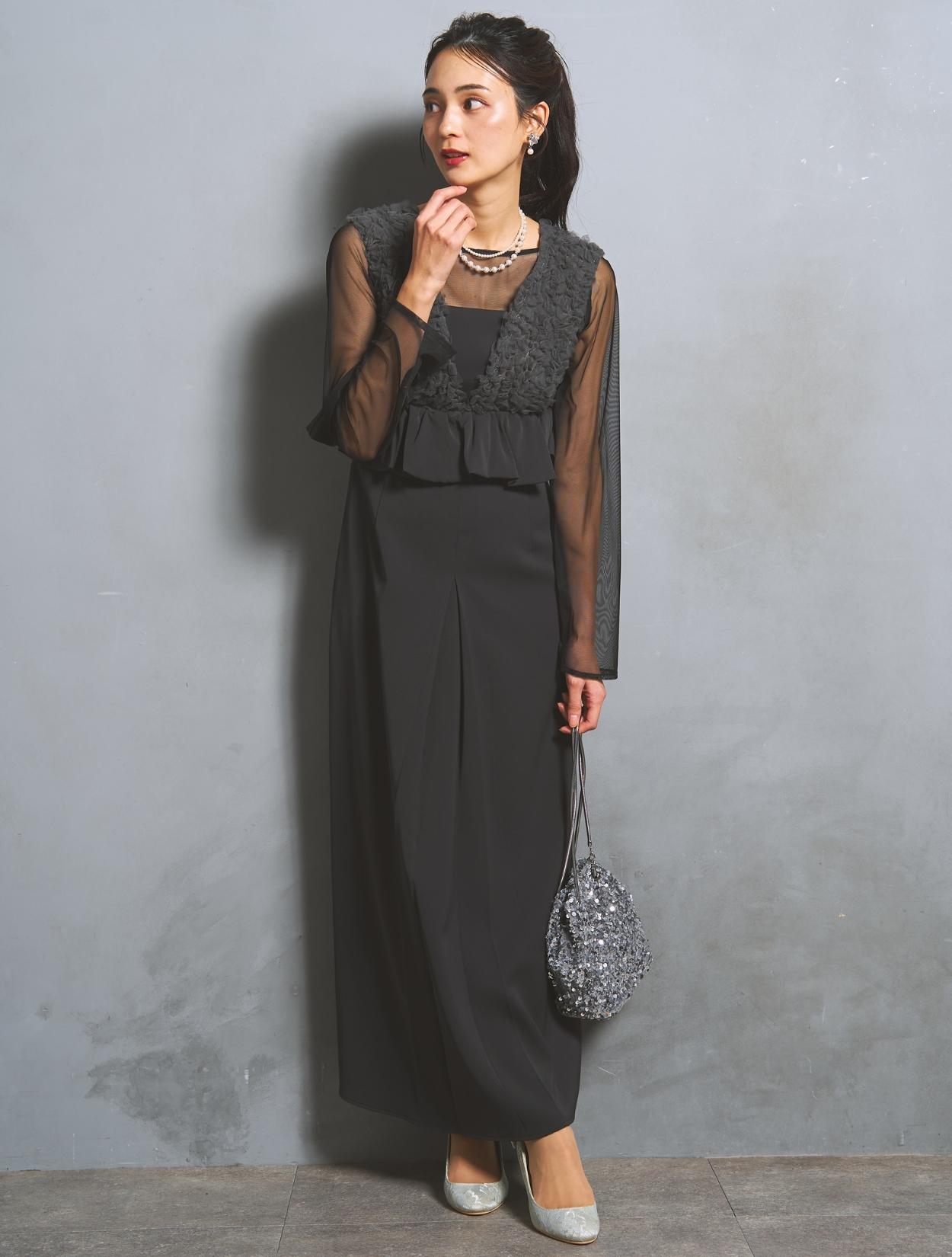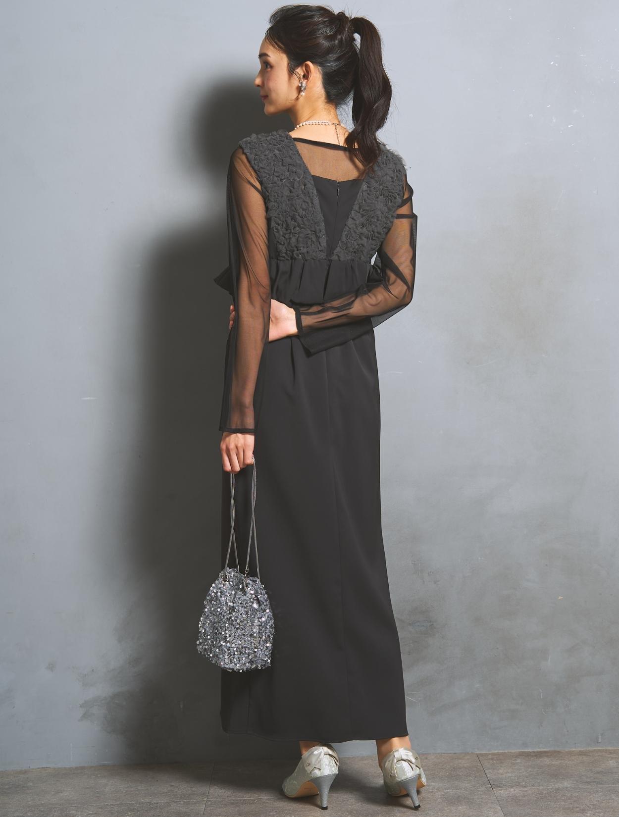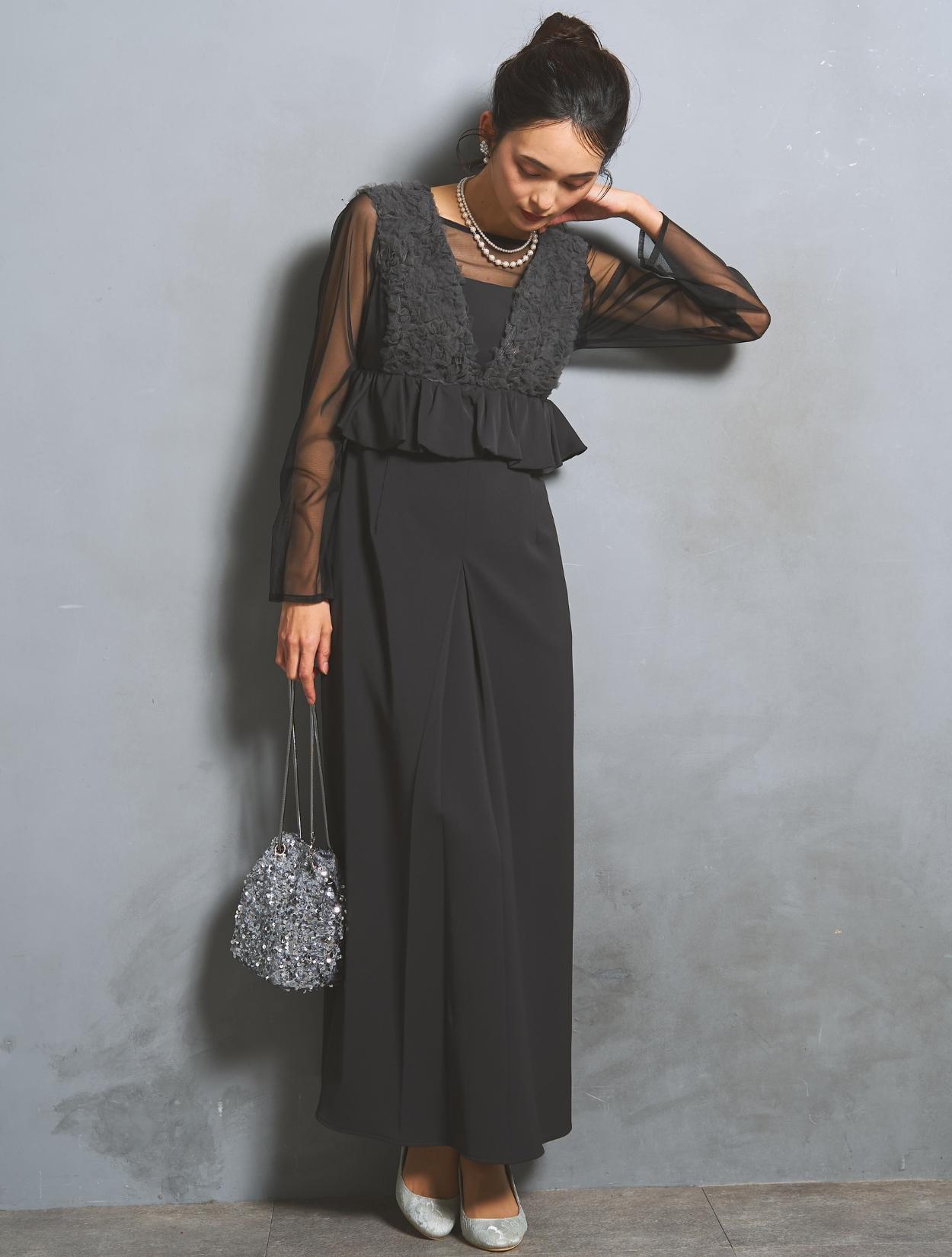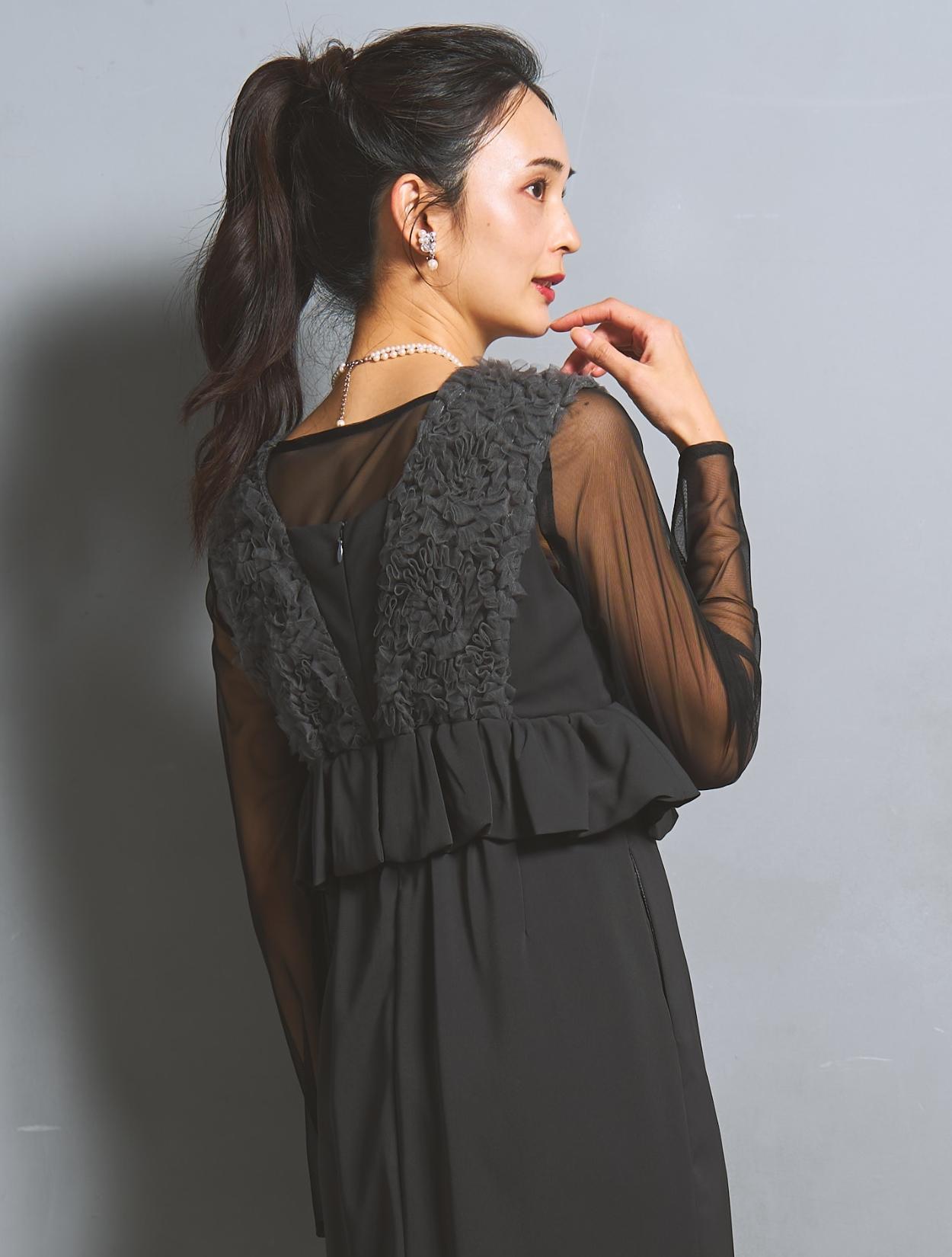 トレンド感のあるモチーフチュールに、軽さのあるシアーブラウス、ハリのあるダブルクロス生地と、異素材を組み合わせた立体感のあるドレス。メリハリを持って着こなせます。