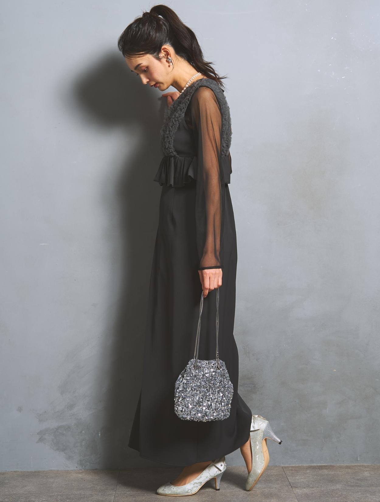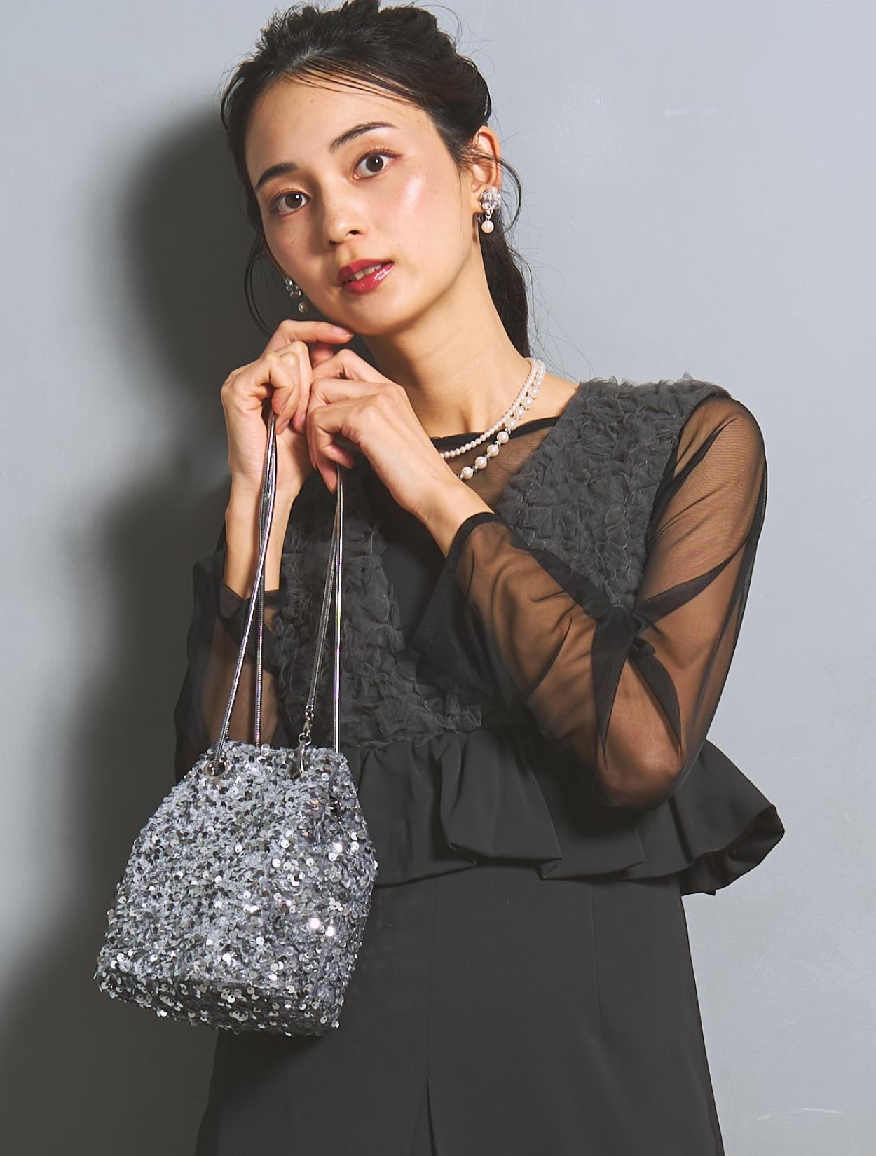 カチッと見えるボックスタックドレスの印象をあえて外すような、ラフな雰囲気のスパンコールバッグをコーディネート。キラキラしたシルバーカラーがチャコールグレーを華やかなパーティー仕様に。アクセサリーは、フォーマルなシーンでも自信を持って着用できる2連のパールネックレスをチョイス。Vネックのラインに上品に映えます。
