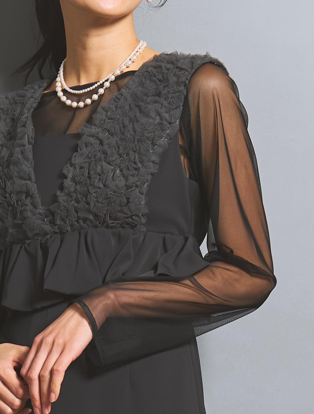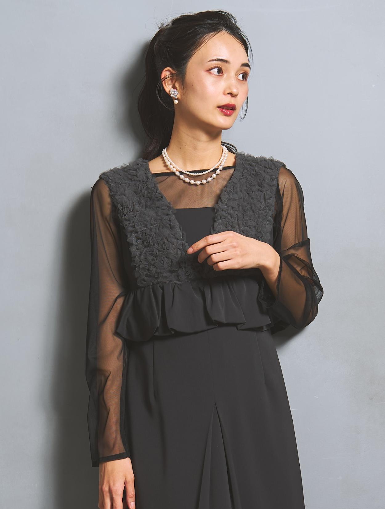 Vラインのチュールモチーフは、程よくボリュームを出しながらも首元をスッキリ見せてくれるデザイン。短い首がお悩みの方でも挑戦しやすいです。インナーのシアーブラウスも横に広めに開いているので、首元が詰まった印象になりにくいのも嬉しいポイント。