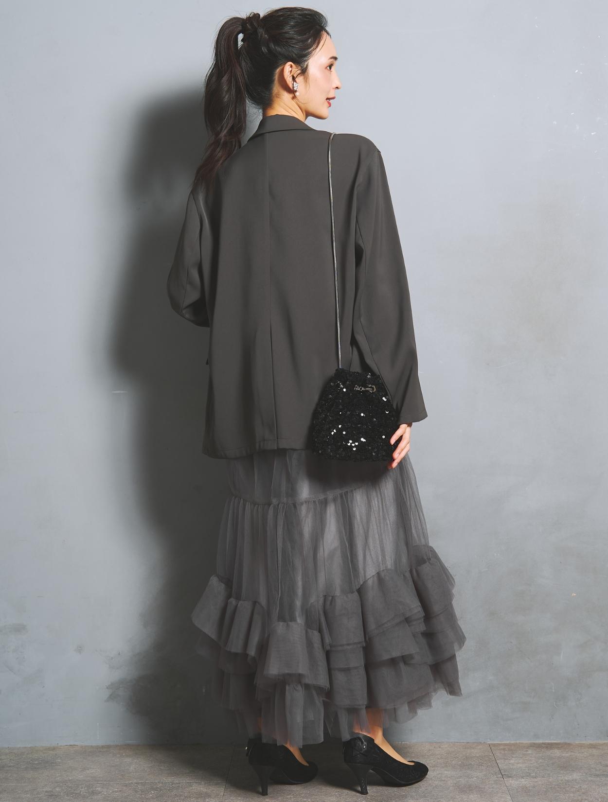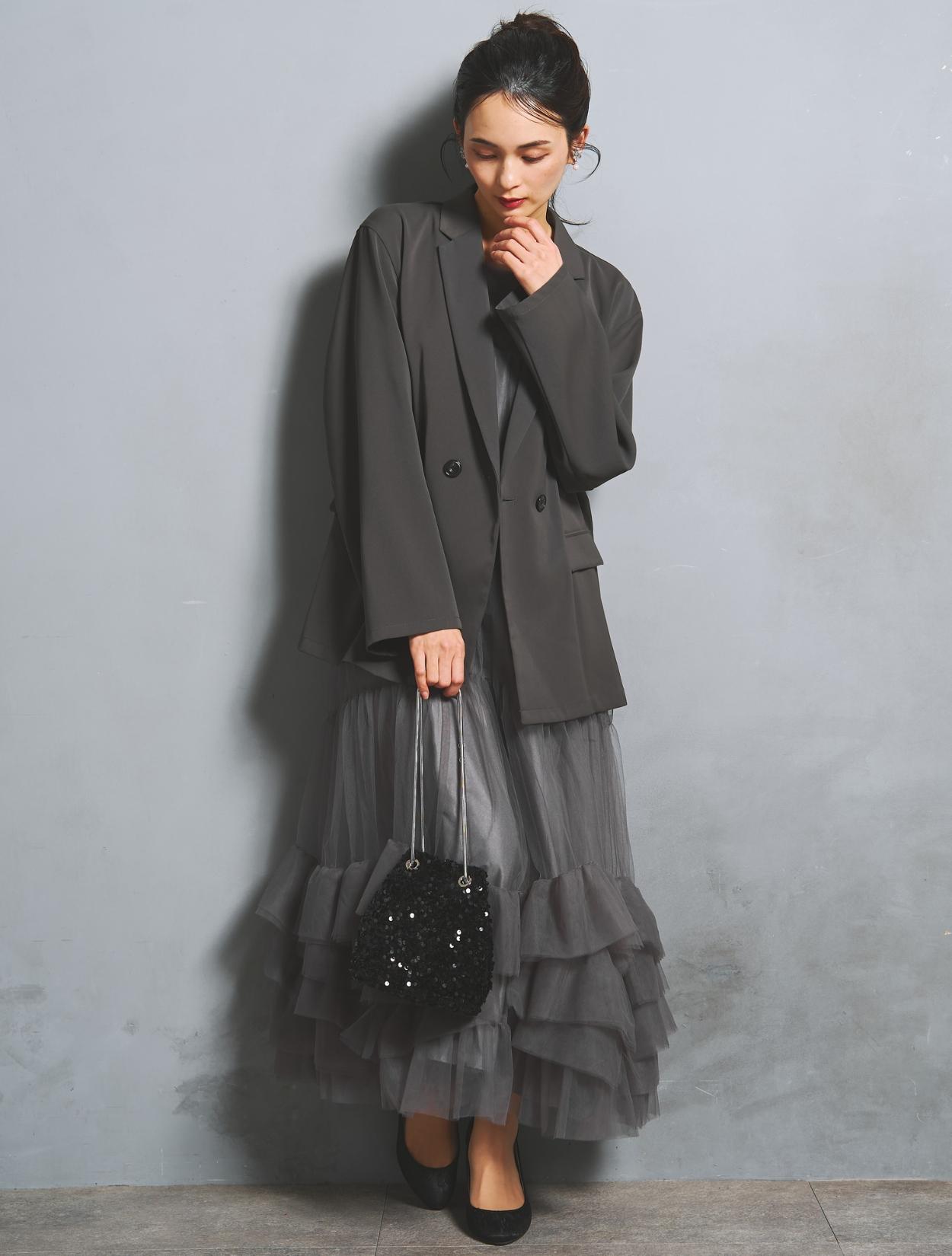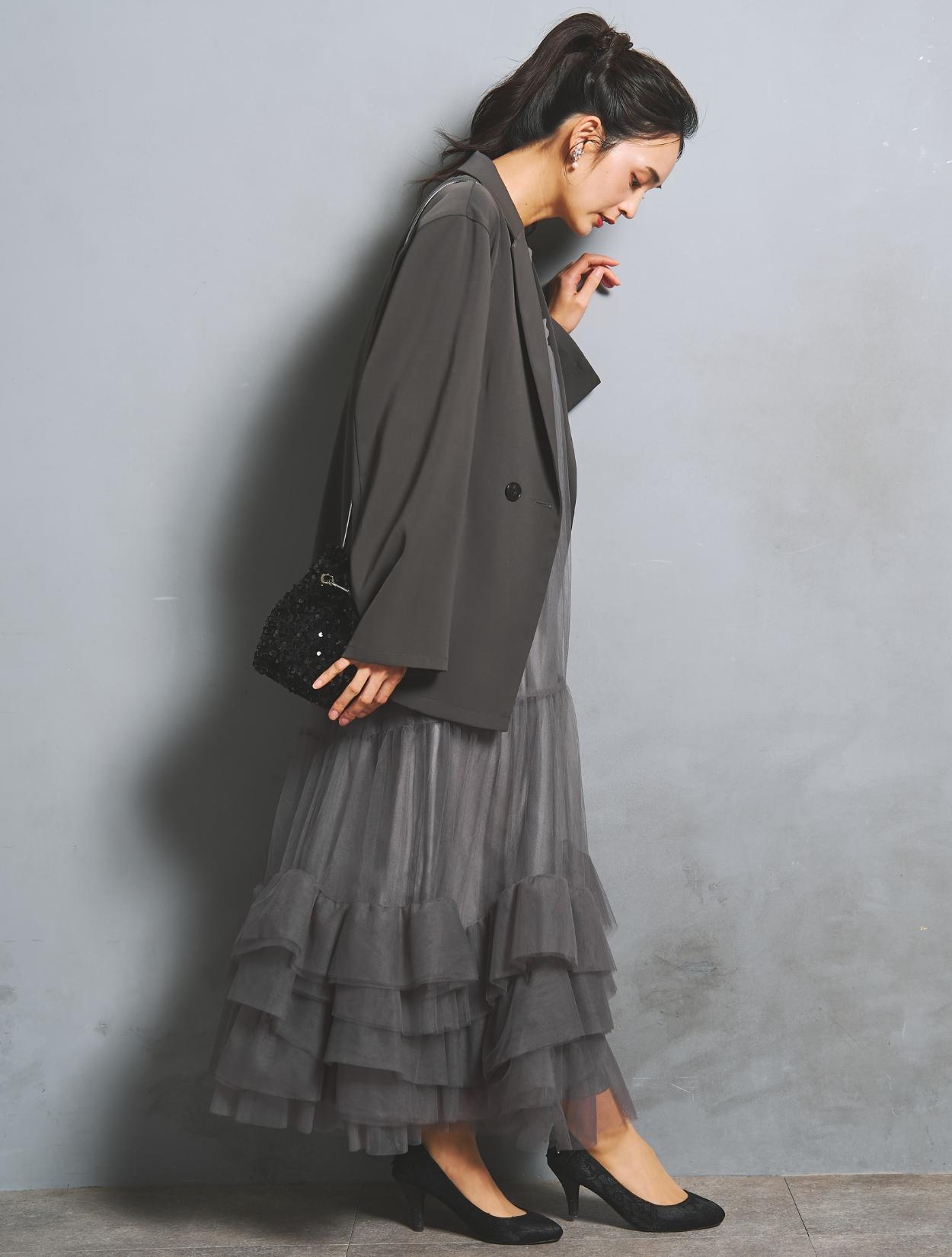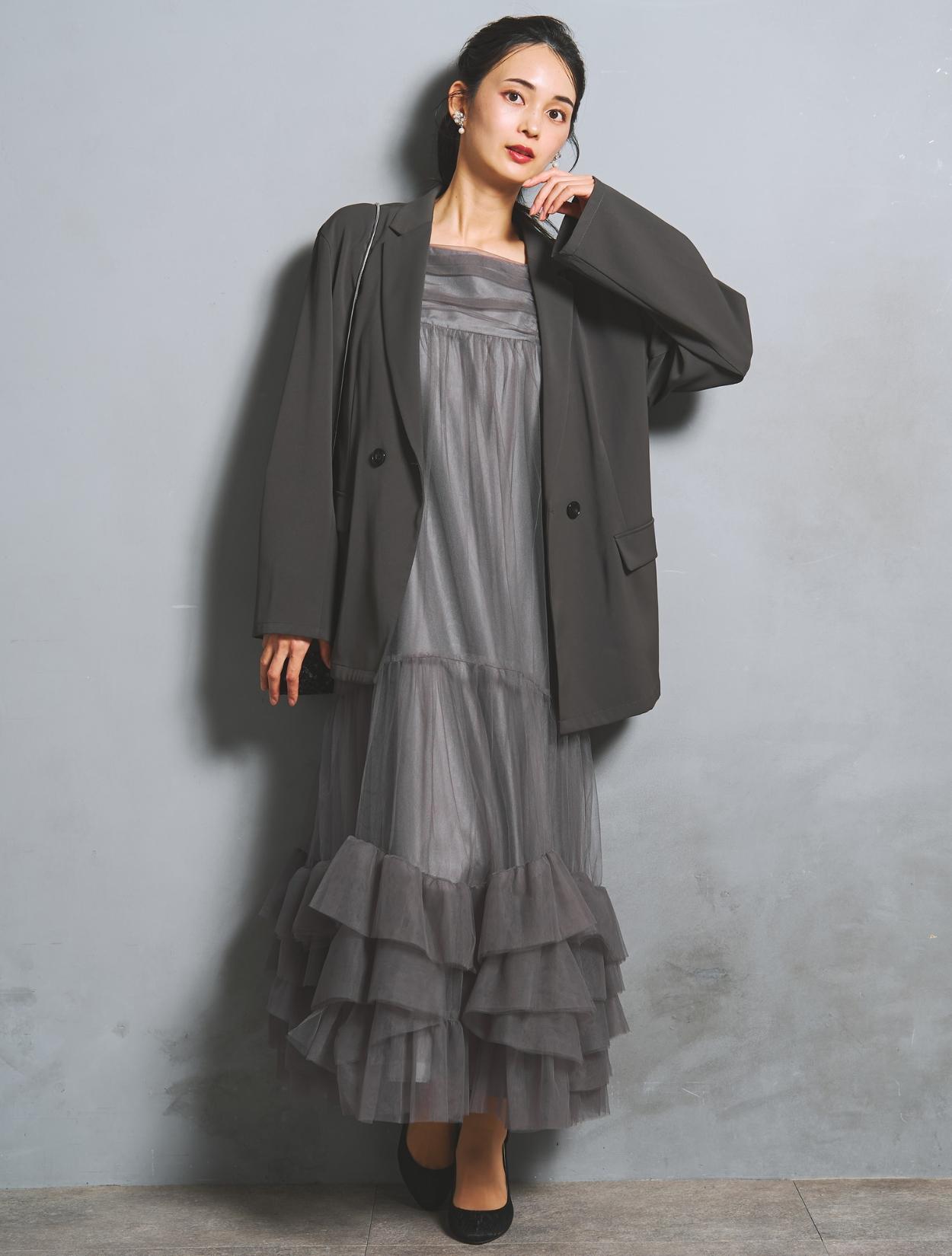 裾に大胆なフリルをあしらったチュールワンピースと、W仕立てジャケットがセットになった、こなれ感たっぷりのトレンドドレス。絶妙な甘辛バランスがおしゃれさんに人気です。
