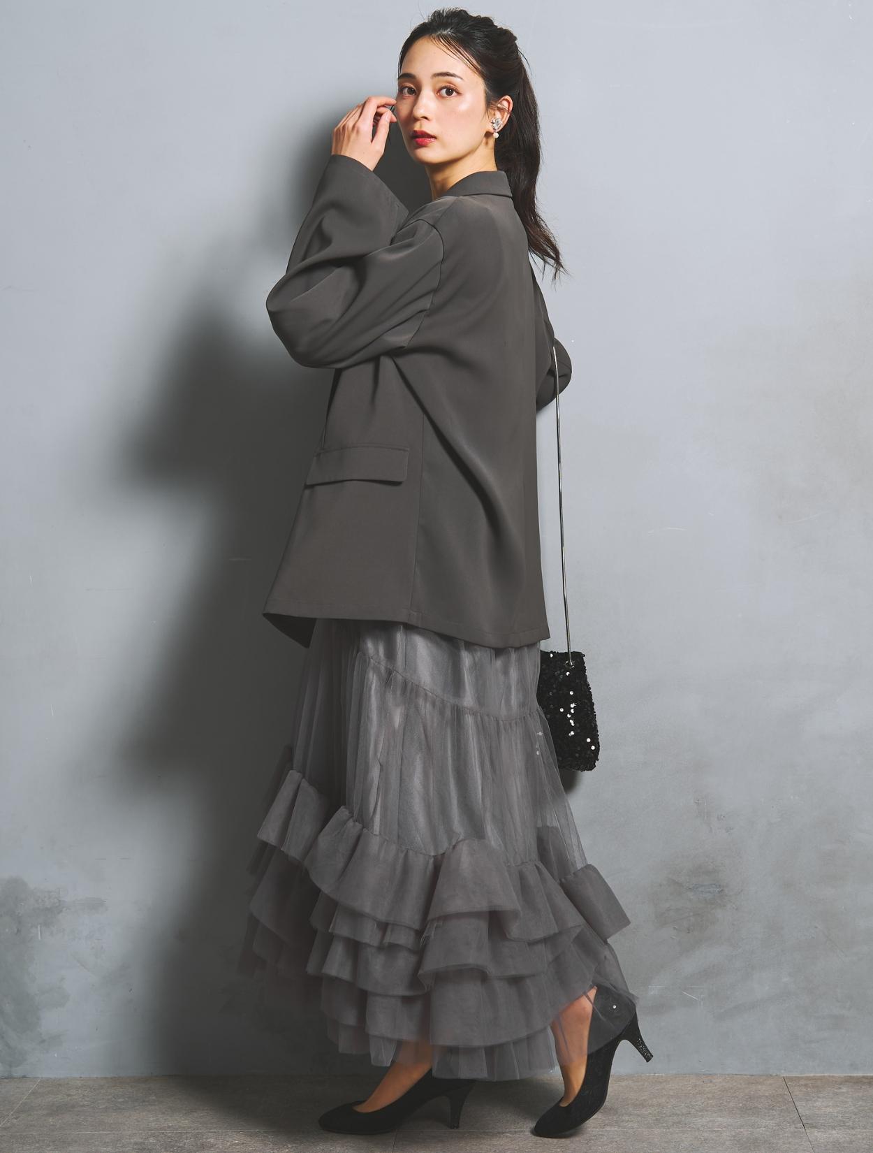 たっぷりのチュールフリルにトレンド感たっぷりのジャケットコーデは、20代30代におすすめです。