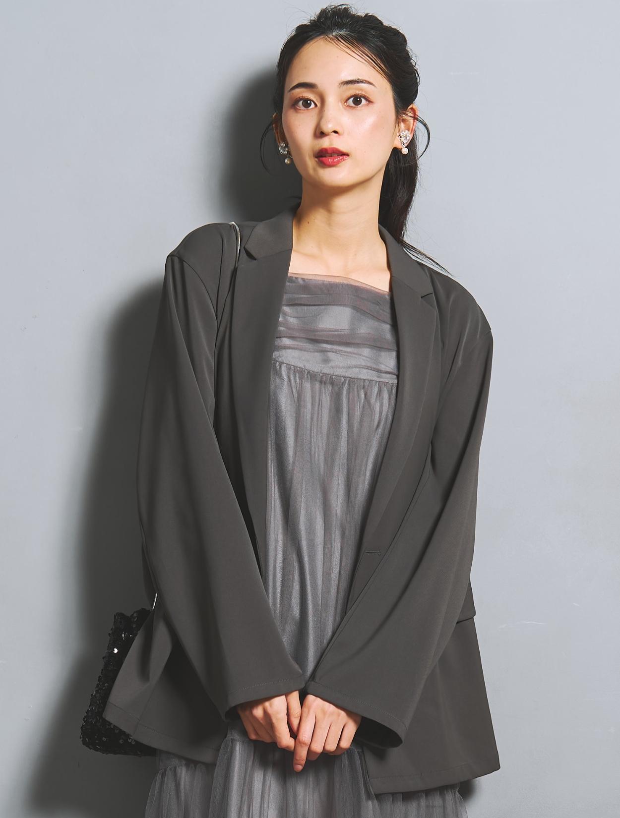 ジャケットはとろみのある生地で、落ち感が程よいリラックスムード。ゆとりを持たせたサイズ感で、サラッと羽織るだけでこなれたスタイリングに。華奢な方がざっくり着てもかっこいい着こなしになりますし、キャミワンピでは上半身の肉付きが気になる…という方にもカバー力抜群の強い味方のジャケットです。