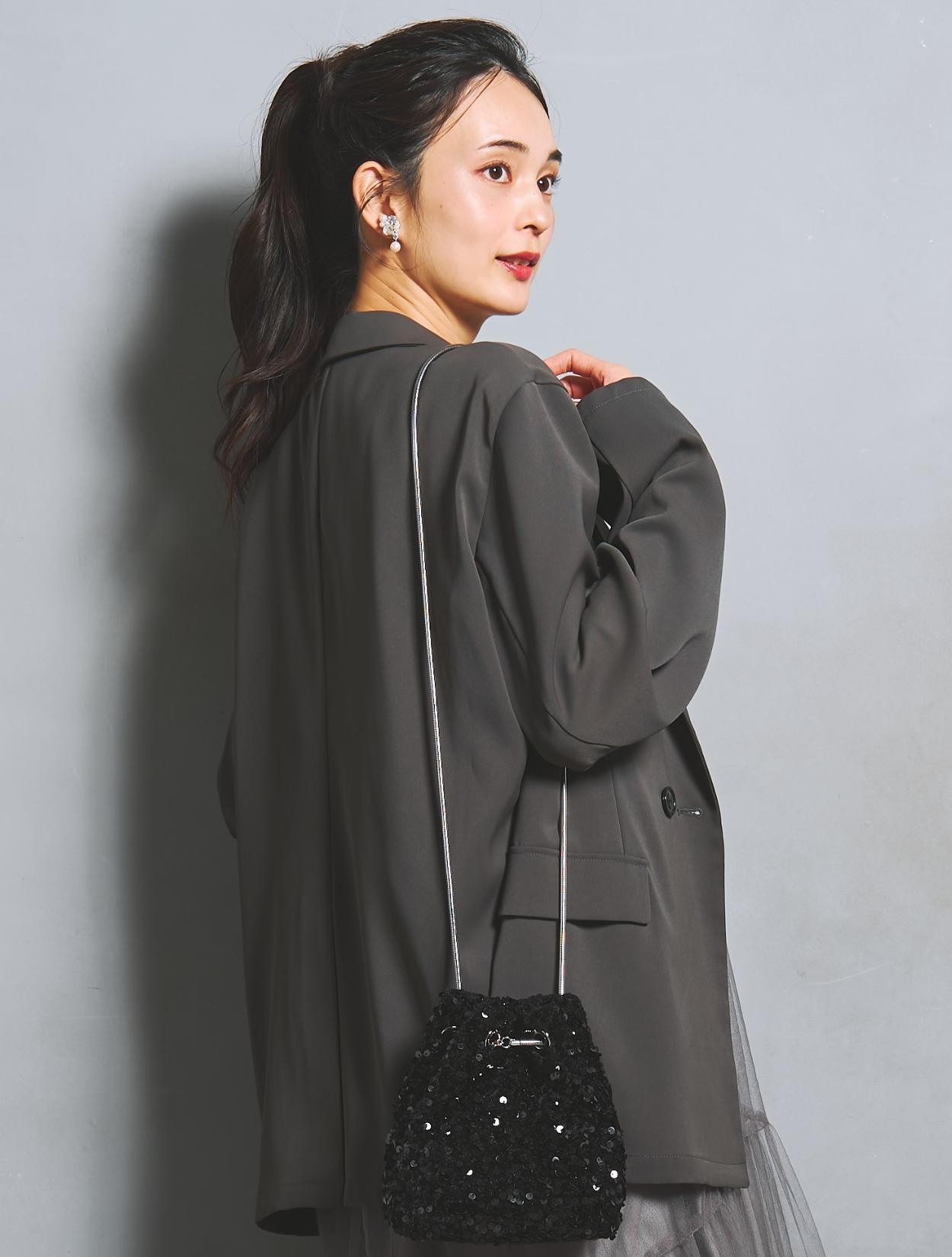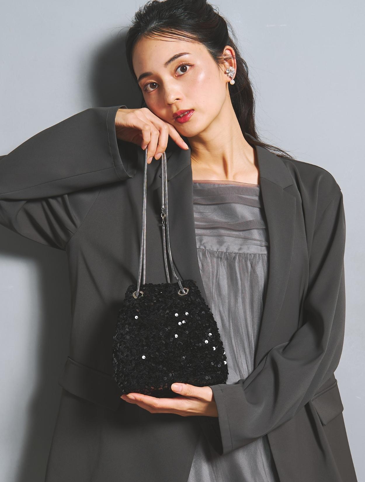 ざっくりと羽織るジャケットが今っぽいドレスに、スパンコールのバッグを合わせたトレンドコーデ。張り切り過ぎていないいい意味でラフな印象が人気。ブラックスパンコールのキラキラが、コーデ全体に立体感を出してくれます。イヤリングはお顔映りを華やかに見せてくれるビジュータイプ。パールモチーフでフォーマル感もあります。