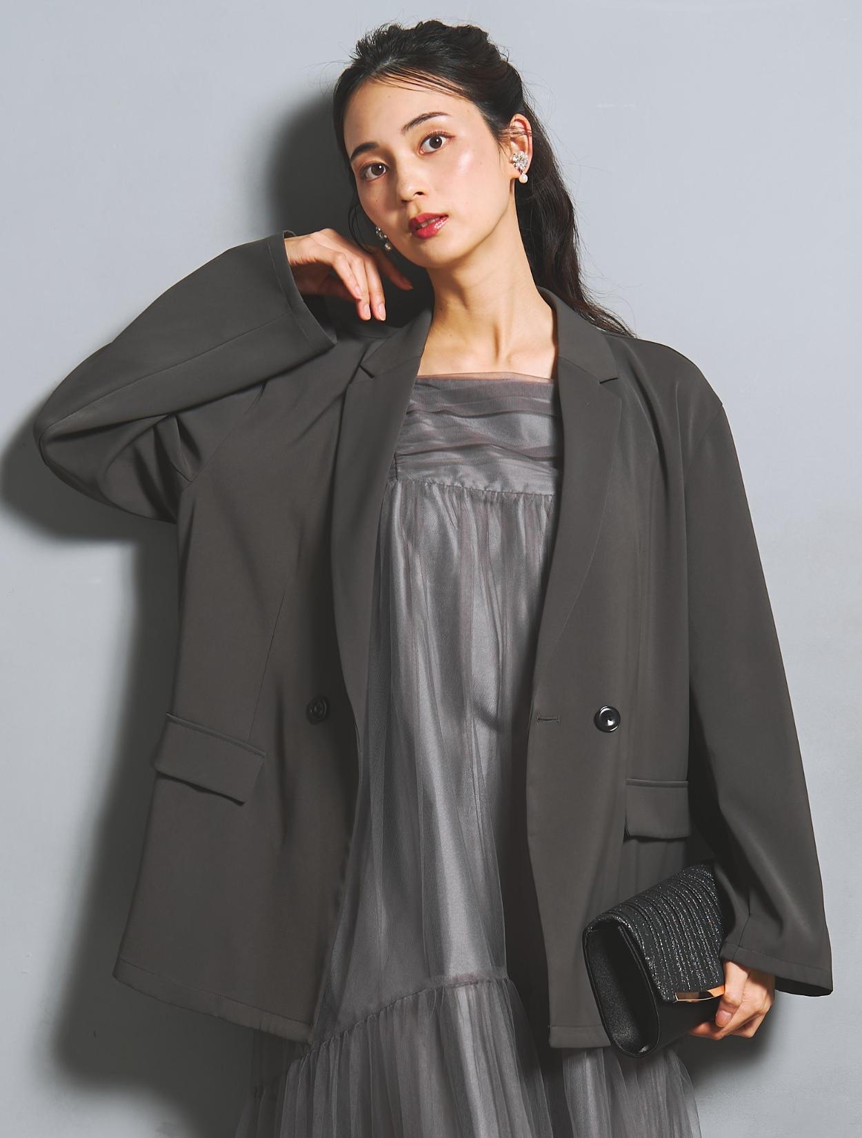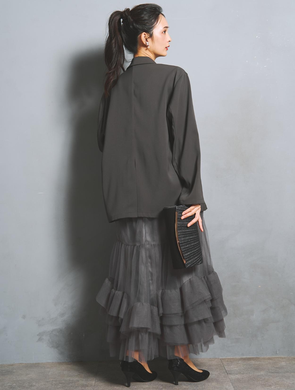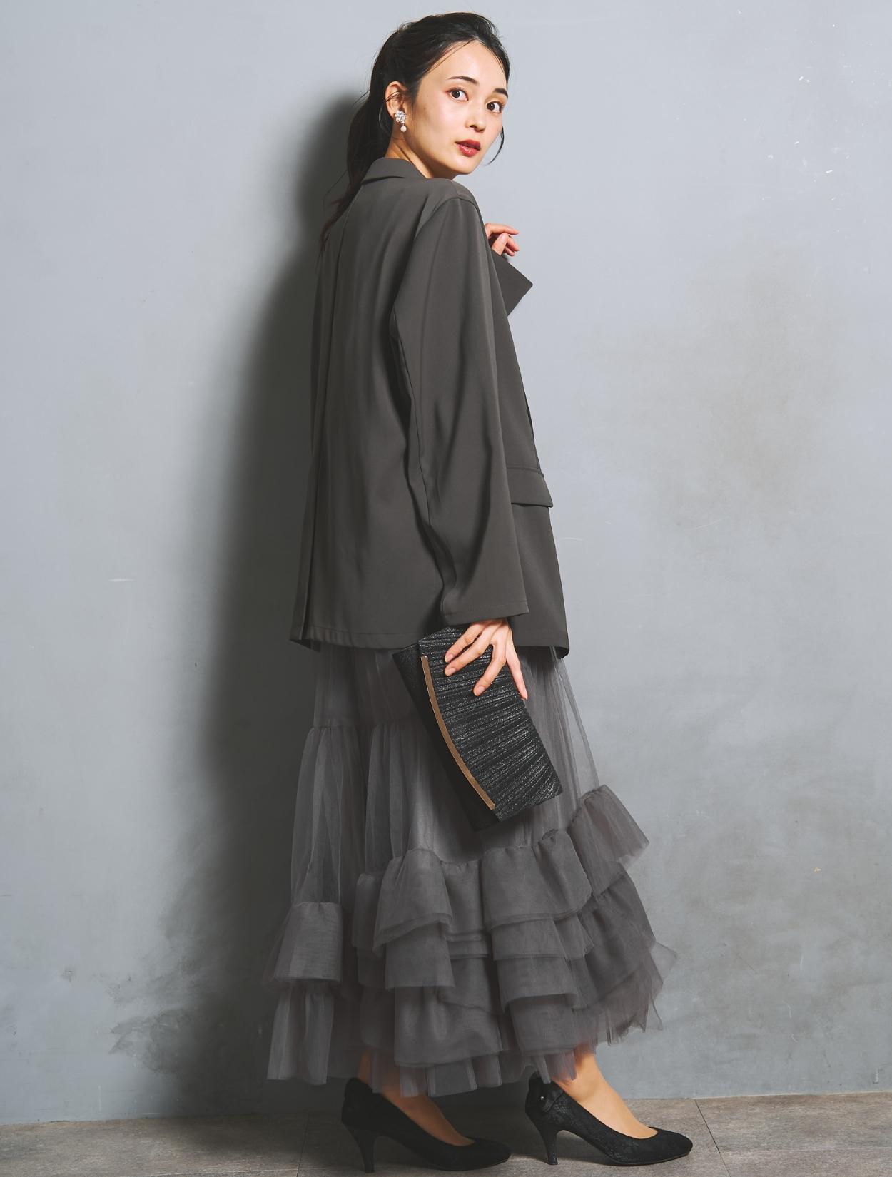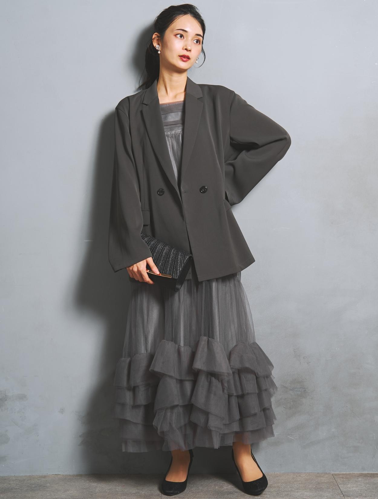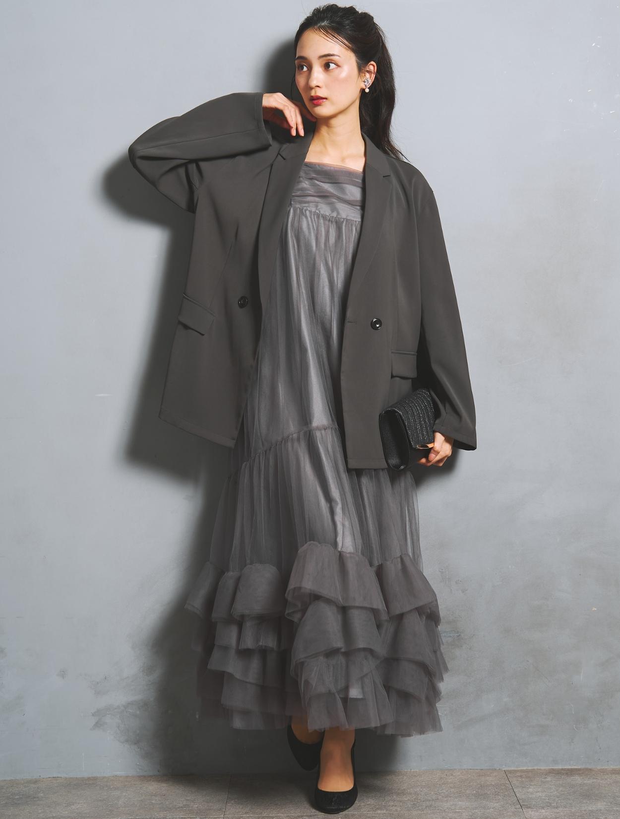 裾に大胆なフリルをあしらったチュールワンピースと、W仕立てジャケットがセットになった、こなれ感たっぷりのトレンドドレス。絶妙な甘辛バランスがおしゃれさんに人気です。