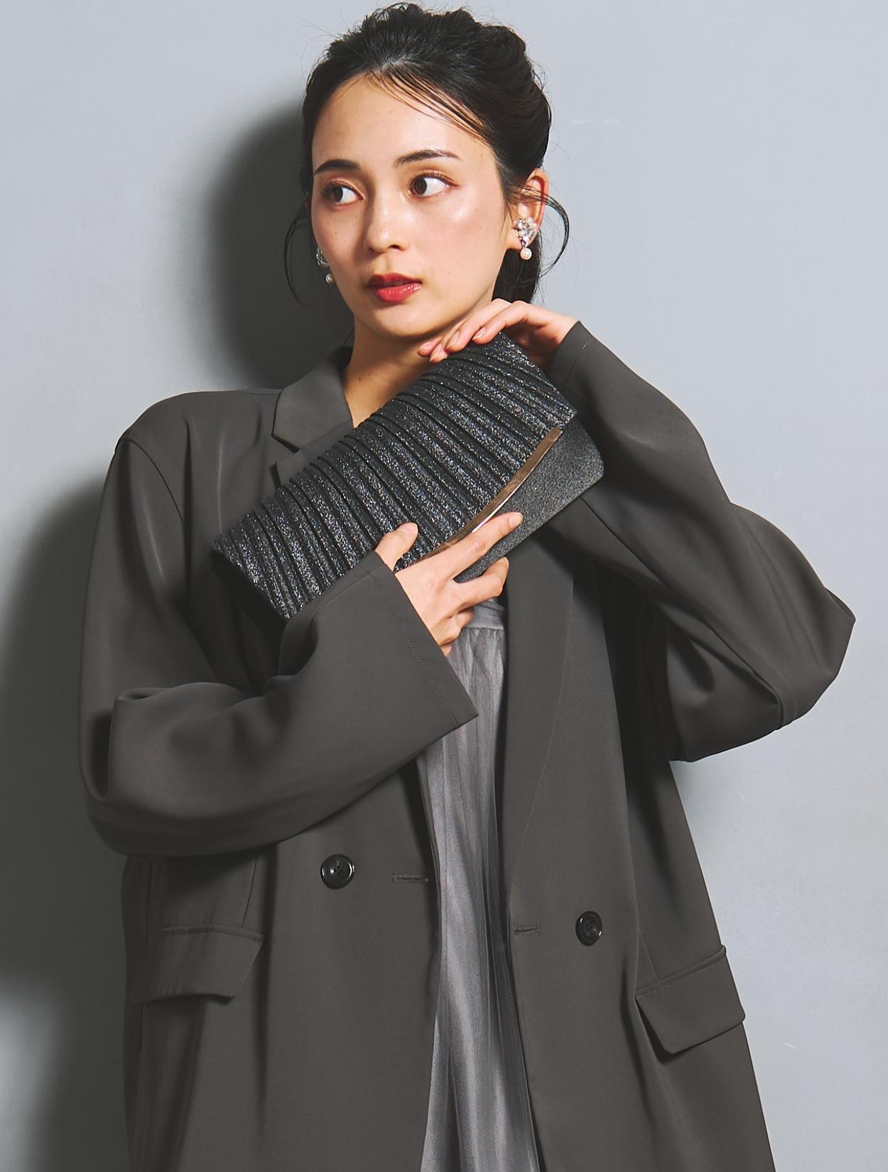 ざっくりと羽織るジャケットが今っぽいドレスに、カッコいいクールな印象のパーティーバッグを合わせた大人コーデ。チャコールグレーのドレスをシックに着こなせるコーディネートです。細かいラメ入りバッグなので地味見えするのも防げます。イヤリングはお顔映りを華やかに見せてくれるビジュータイプ。パールモチーフでフォーマル感もあります。