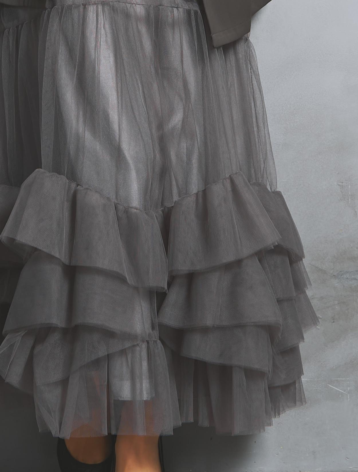 チャコールグレーのチュールからダークグレーの裏地が透ける、絶妙なグレーカラー。スカートのボリュームチュールフリルは、グレーを重ねて色味の濃さに変化があるのも◎。グレーは、ブラックより柔らかい雰囲気で着られるので人気のカラーです。