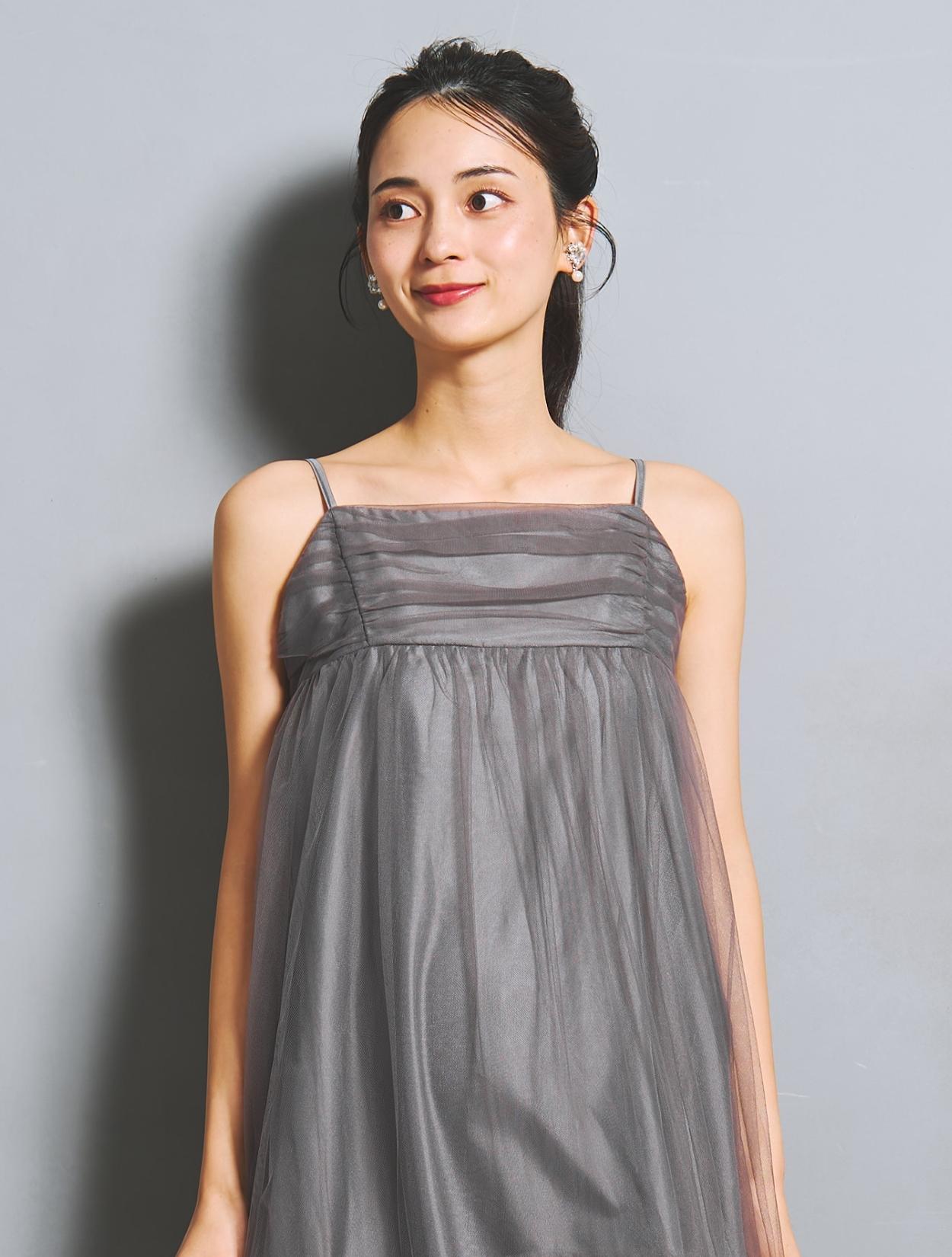 ワンピースはしっかりボリュームを持たせても、チュールの透け感でエアリーな雰囲気に。裏地が透けるのでダークカラーでも重たく見えません。ウエスト周りには切り替えがなく、ゆったり着られるのでマタニティ用のドレスとしてもおすすめ。