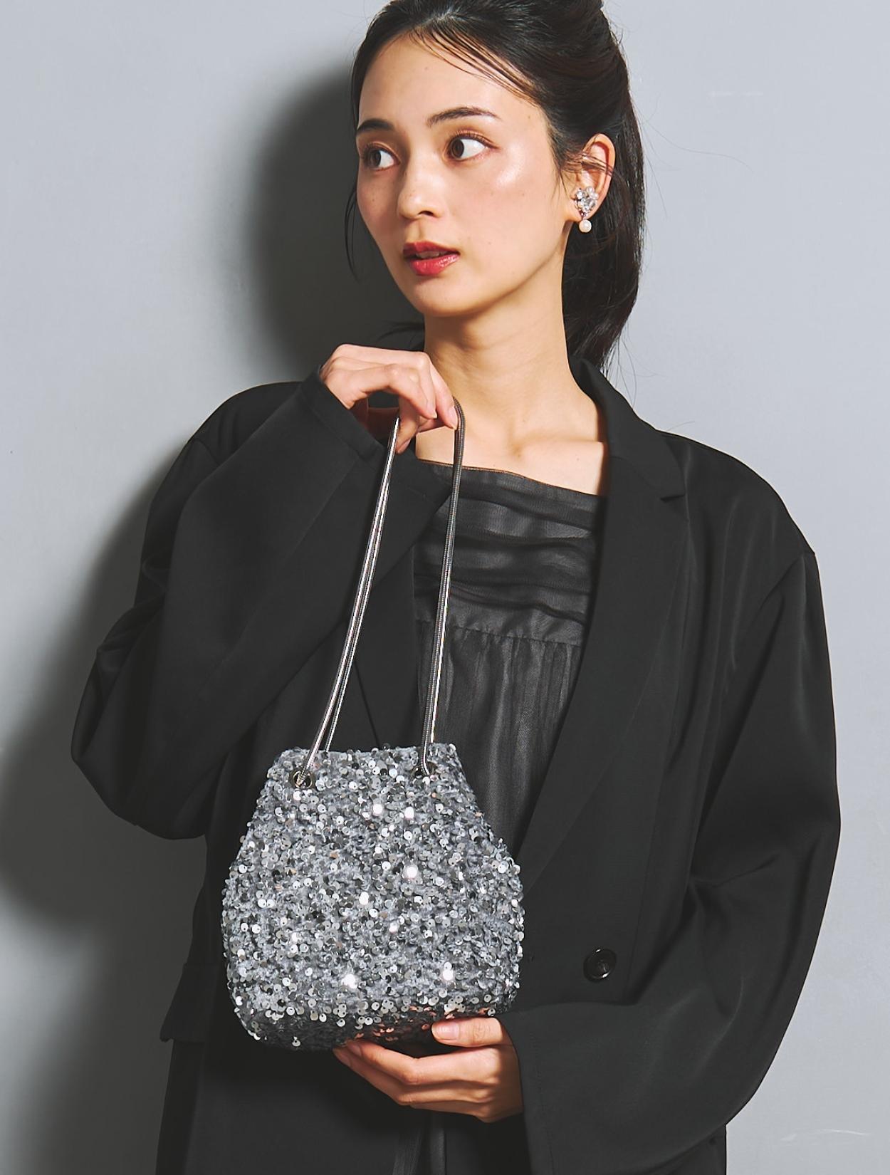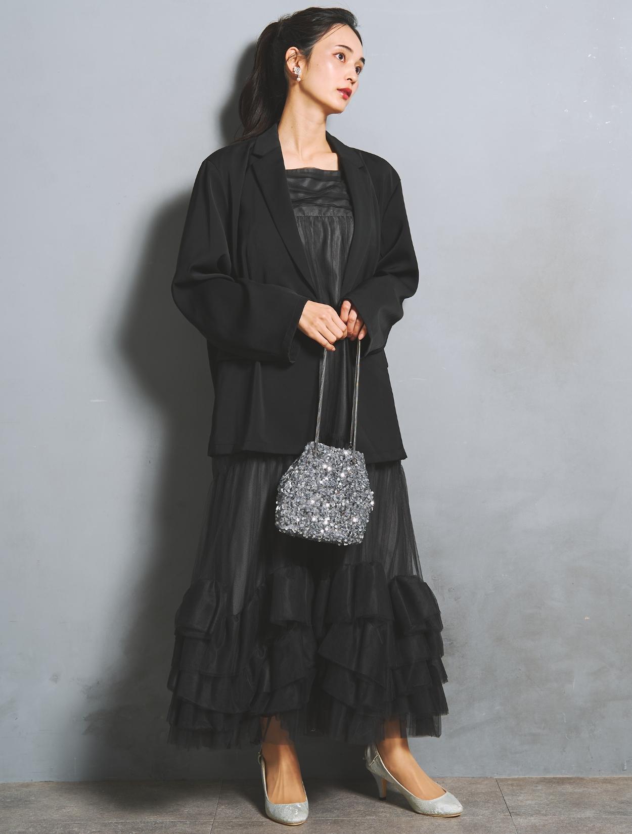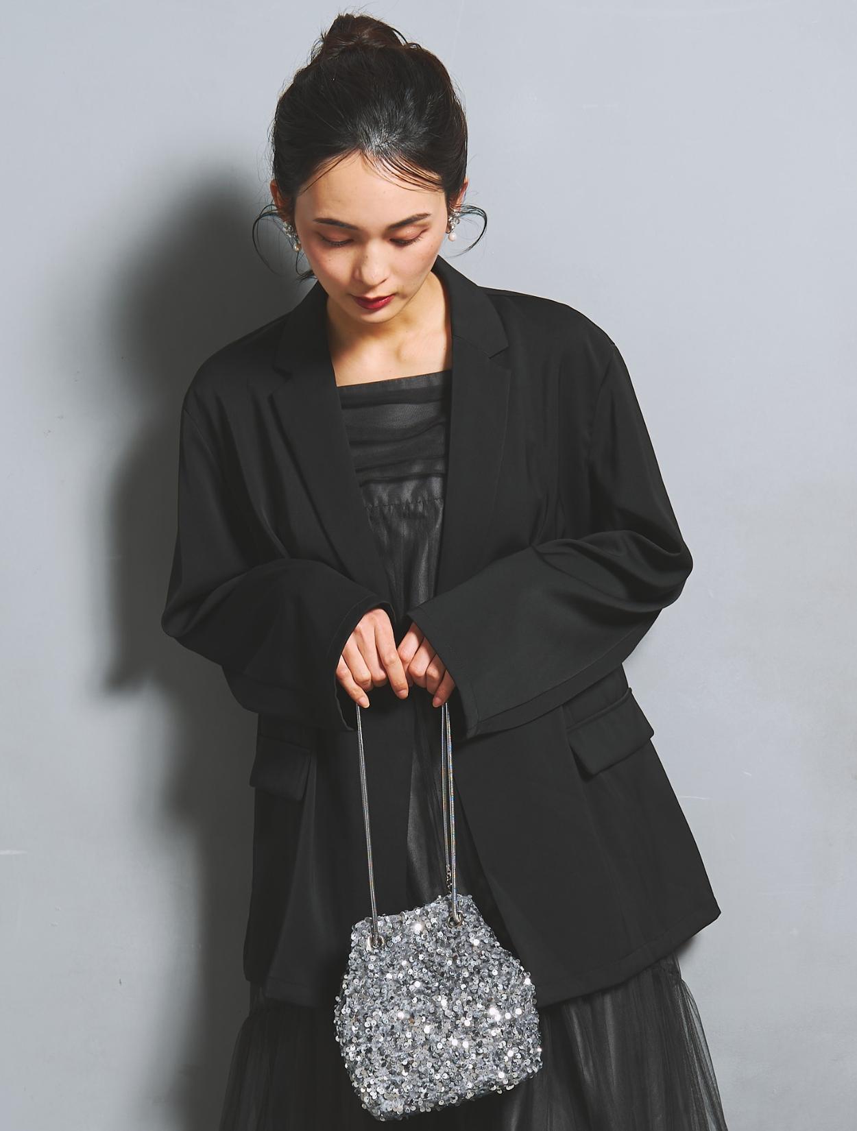 ざっくりと羽織るジャケットが今っぽいドレスに、スパンコールのバッグを合わせたトレンドコーデ。張り切り過ぎていないいい意味でラフな印象が人気。シルバースパンコールのキラキラが、ブラックコーデに思いっ切り華やかさをプラスしてくれます。コロンとした可愛いサイズ感も◎。イヤリングはお顔映りを華やかに見せてくれるビジュータイプ。パールモチーフでフォーマル感もあります。