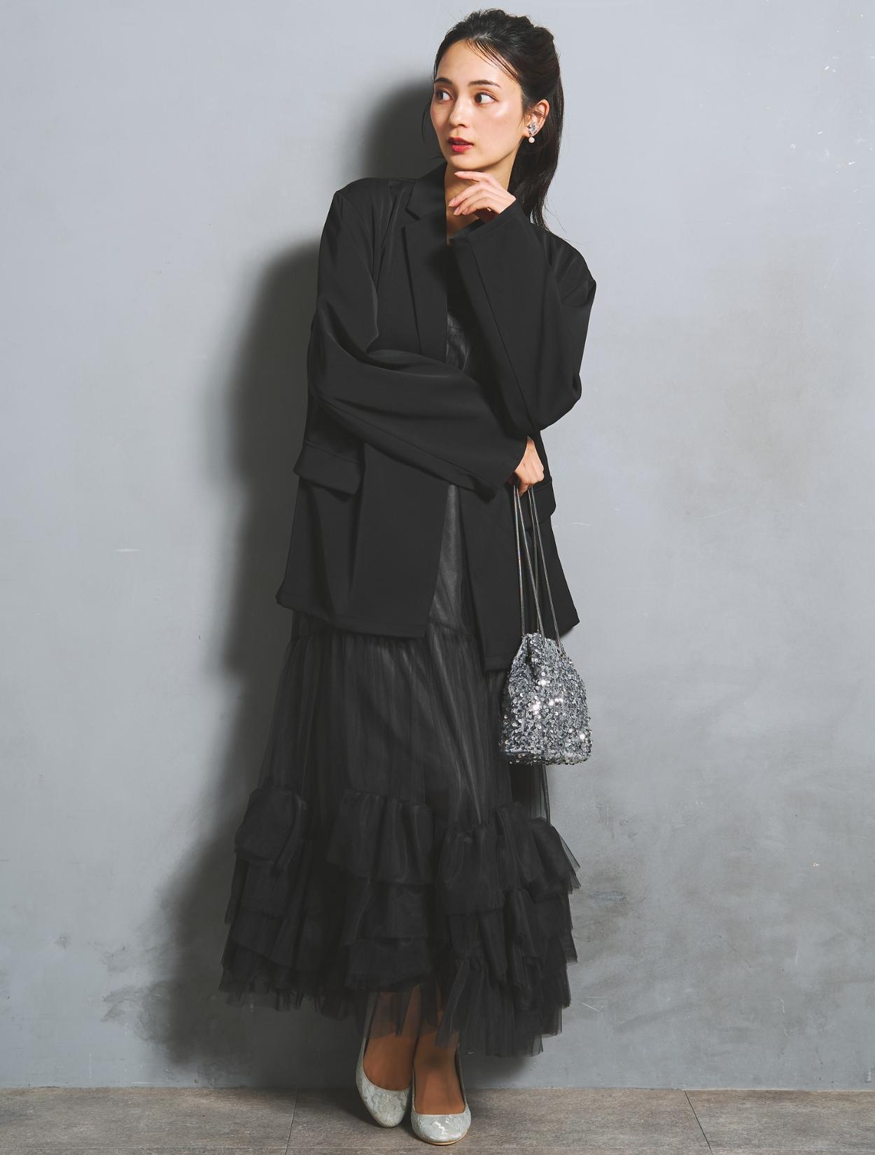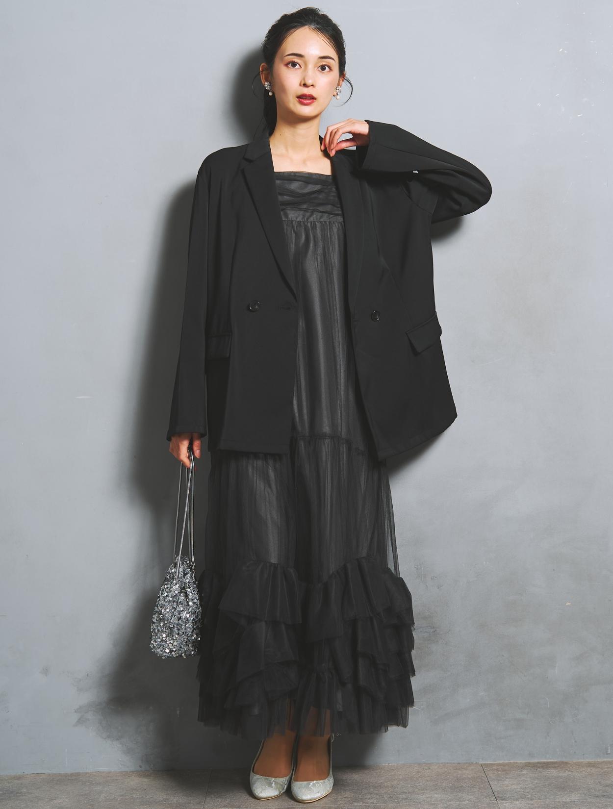 裾に大胆なフリルをあしらったチュールワンピースと、W仕立てジャケットがセットになった、こなれ感たっぷりのトレンドドレス。絶妙な甘辛バランスがおしゃれさんに人気です。