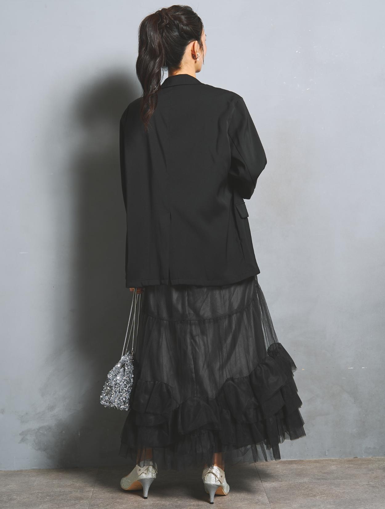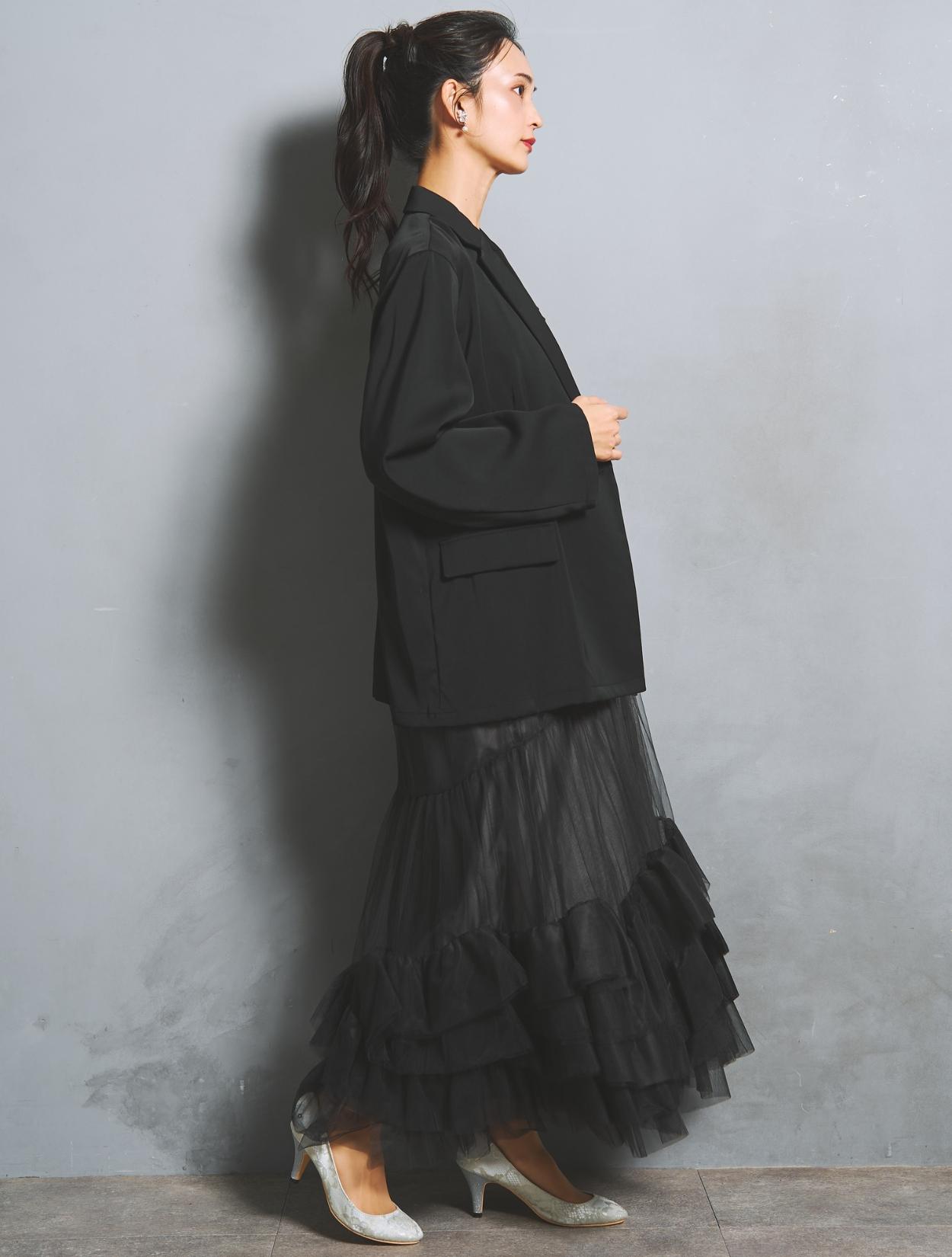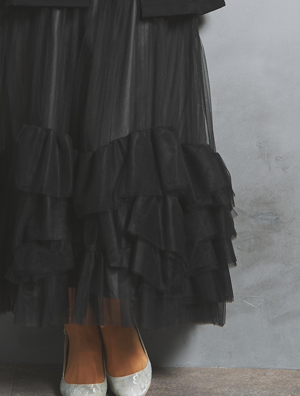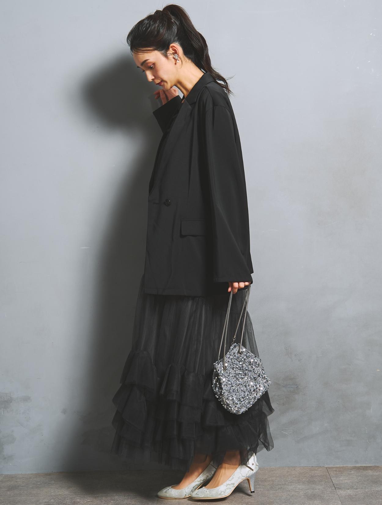 ブラックチュールから透ける光沢のあるブラックの裏地が、立体感と華やかさをプラス。ブラックのジャケットを合わせたオールブラックコーデでも重たく見えません。
