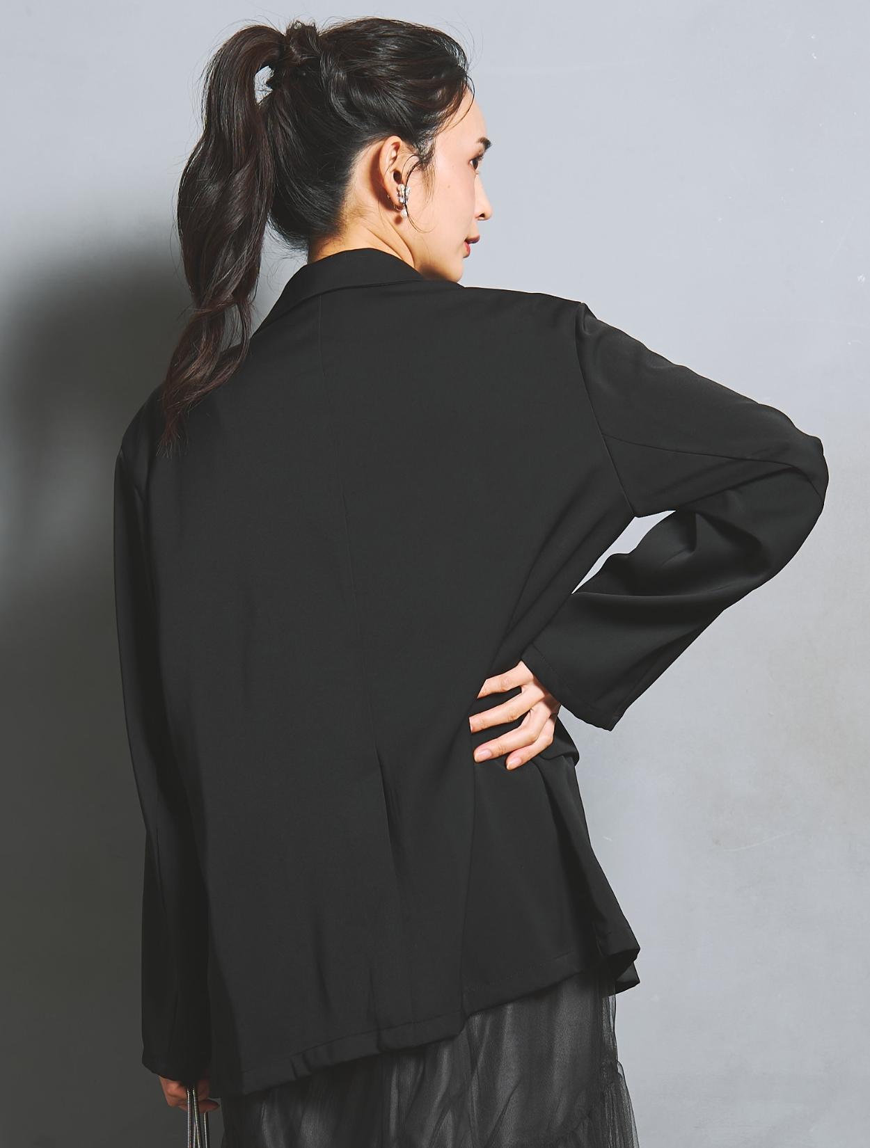 ジャケットはとろみのある生地で、落ち感が程よいリラックスムード。ゆとりを持たせたサイズ感で、サラッと羽織るだけでこなれたスタイリングに。華奢な方がざっくり着てもかっこいい着こなしになりますし、キャミワンピでは上半身の肉付きが気になる…という方にもカバー力抜群の強い味方のジャケットです。