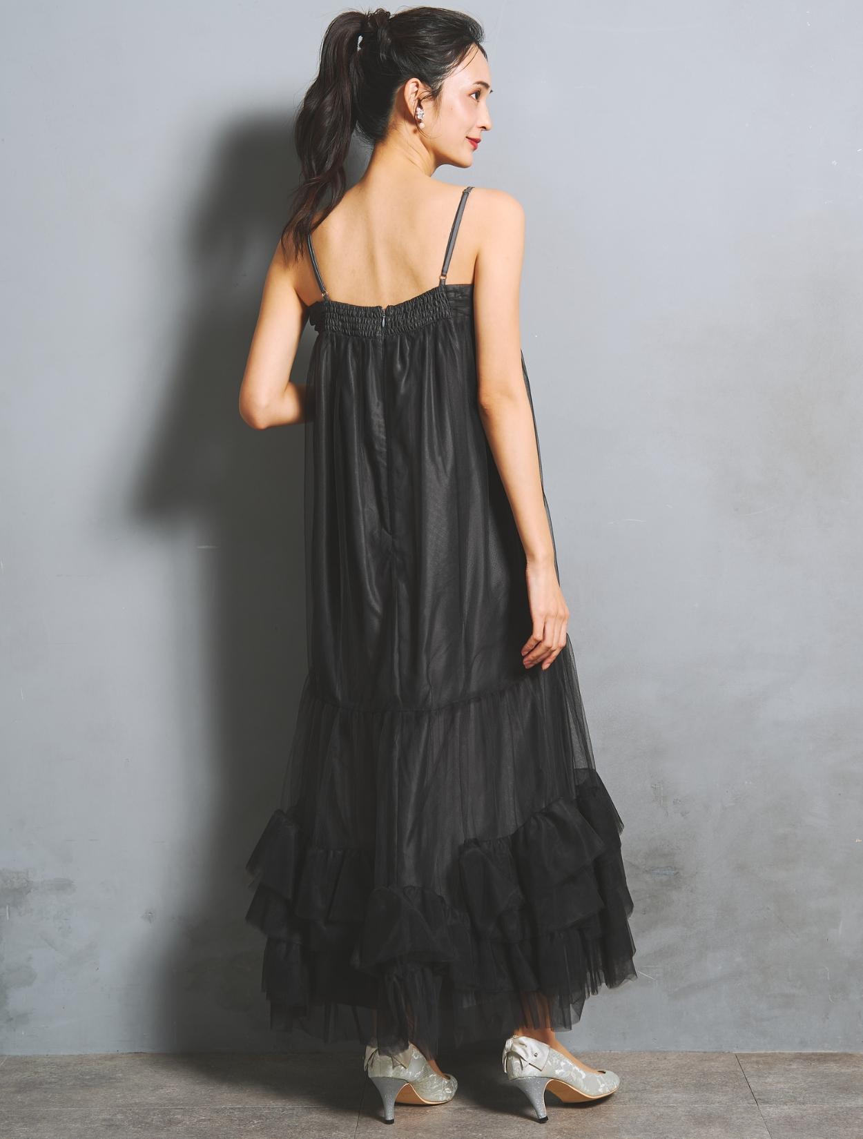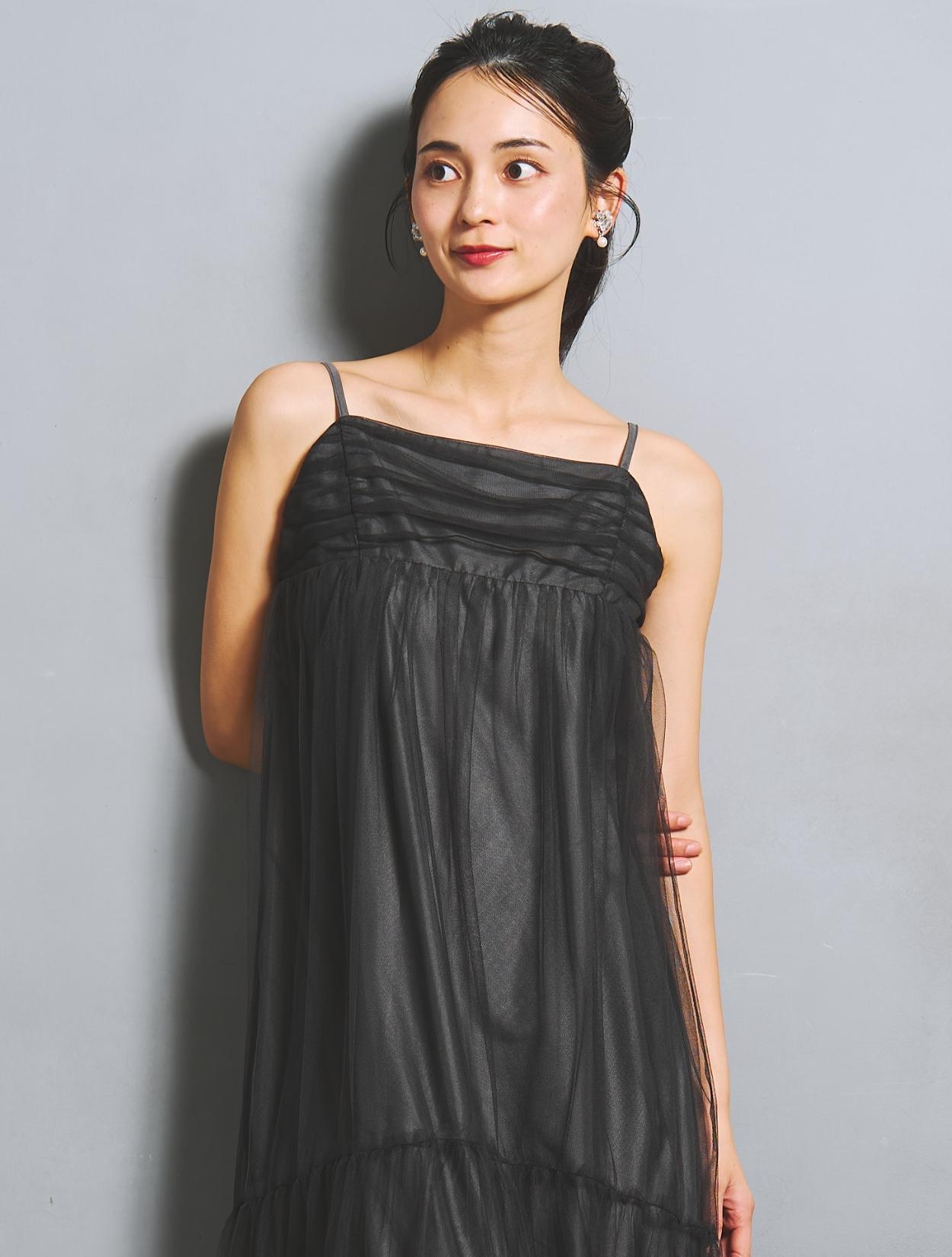 ワンピースはしっかりボリュームを持たせても、チュールの透け感でエアリーな雰囲気に。裏地が透けるのでダークカラーでも重たく見えません。ウエスト周りには切り替えがなく、ゆったり着られるのでマタニティ用のドレスとしてもおすすめ。