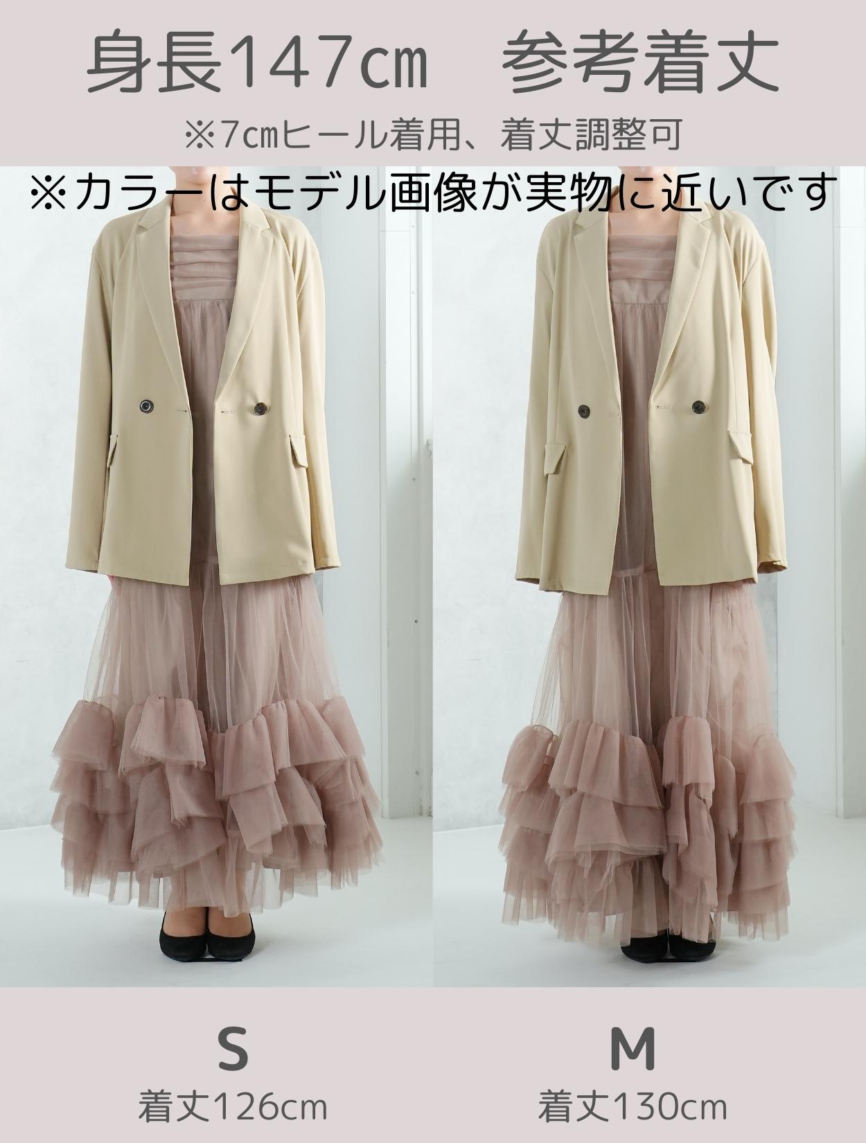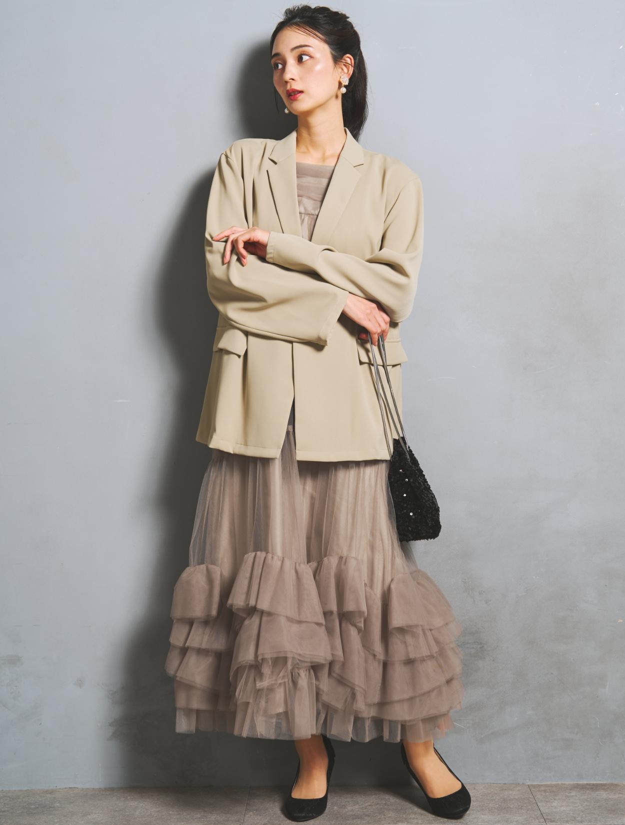 裾に大胆なフリルをあしらったチュールワンピースと、W仕立てジャケットがセットになった、こなれ感たっぷりのトレンドドレス。絶妙な甘辛バランスがおしゃれさんに人気です。