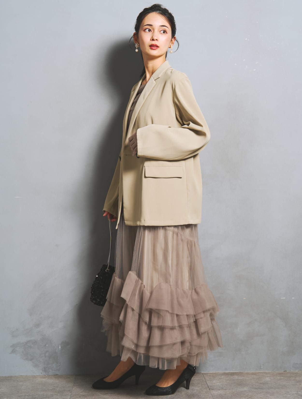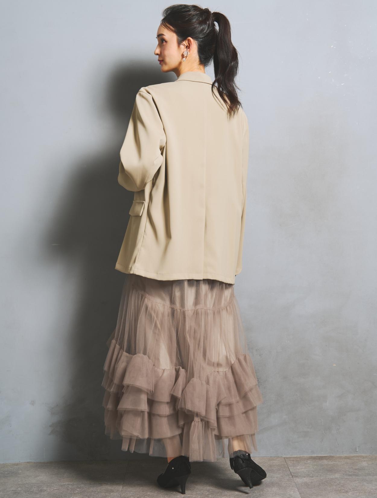 たっぷりのチュールフリルにトレンド感たっぷりのジャケットコーデは、20代30代におすすめです。