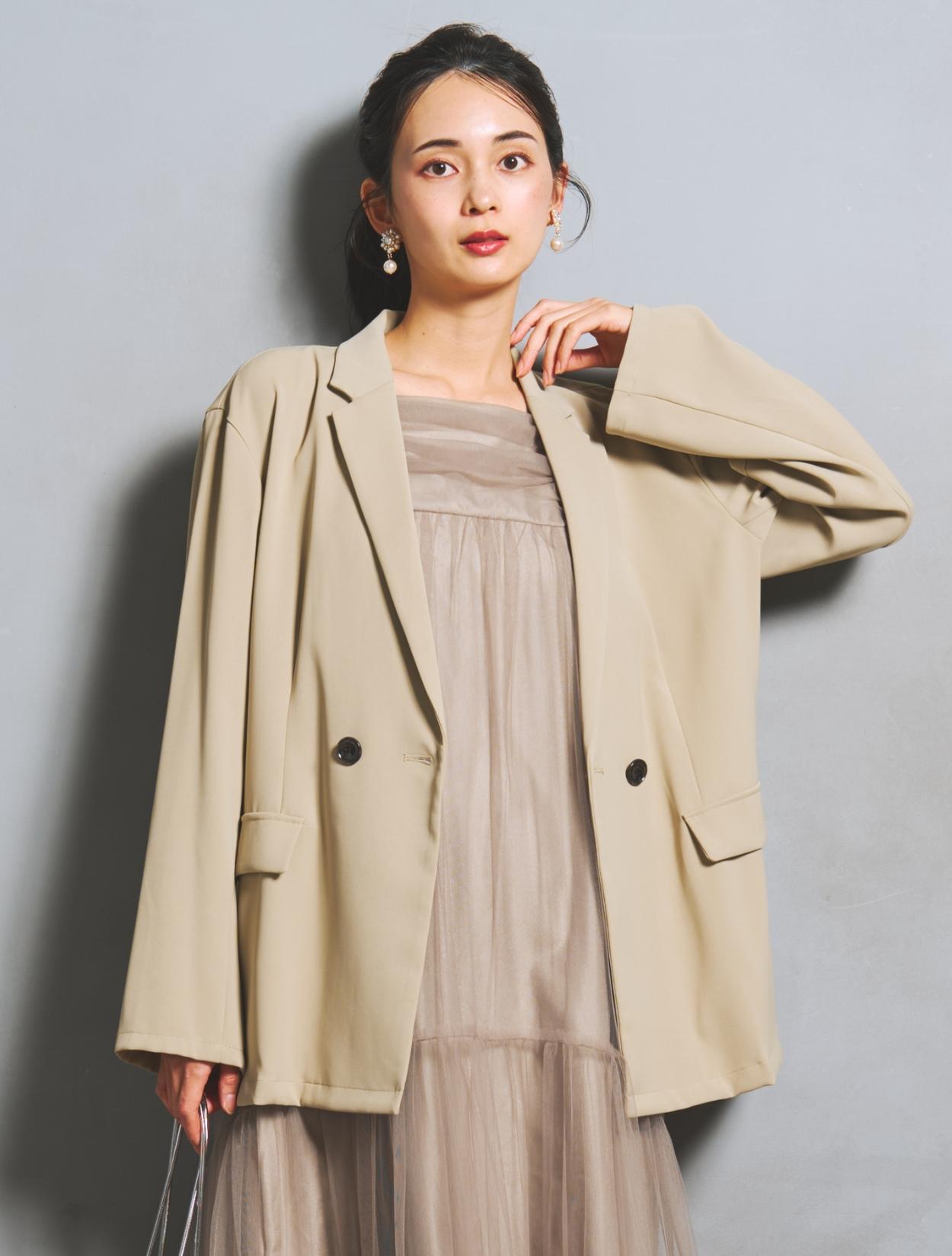 ジャケットはとろみのある生地で、落ち感が程よいリラックスムード。ゆとりを持たせたサイズ感で、サラッと羽織るだけでこなれたスタイリングに。華奢な方がざっくり着てもかっこいい着こなしになりますし、キャミワンピでは上半身の肉付きが気になる…という方にもカバー力抜群の強い味方のジャケットです。