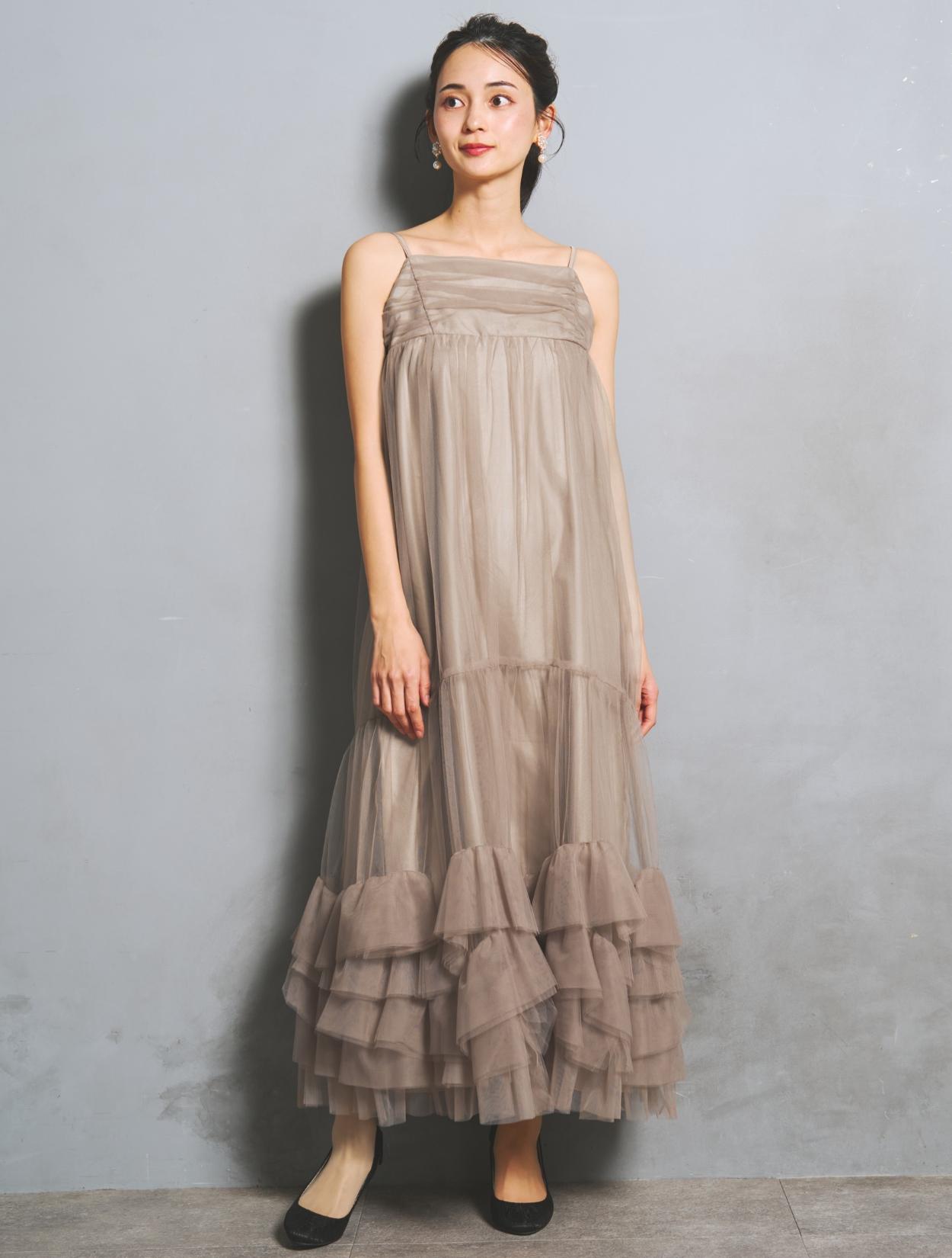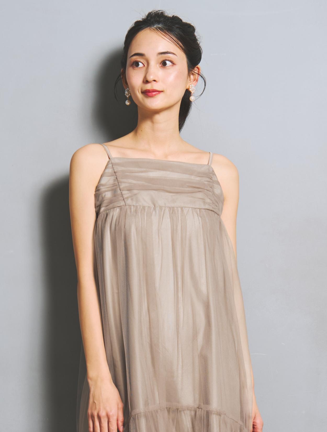 ワンピースはしっかりボリュームを持たせても、チュールの透け感でエアリーな雰囲気に。裏地が透けるのでダークカラーでも重たく見えません。ウエスト周りには切り替えがなく、ゆったり着られるのでマタニティ用のドレスとしてもおすすめ。