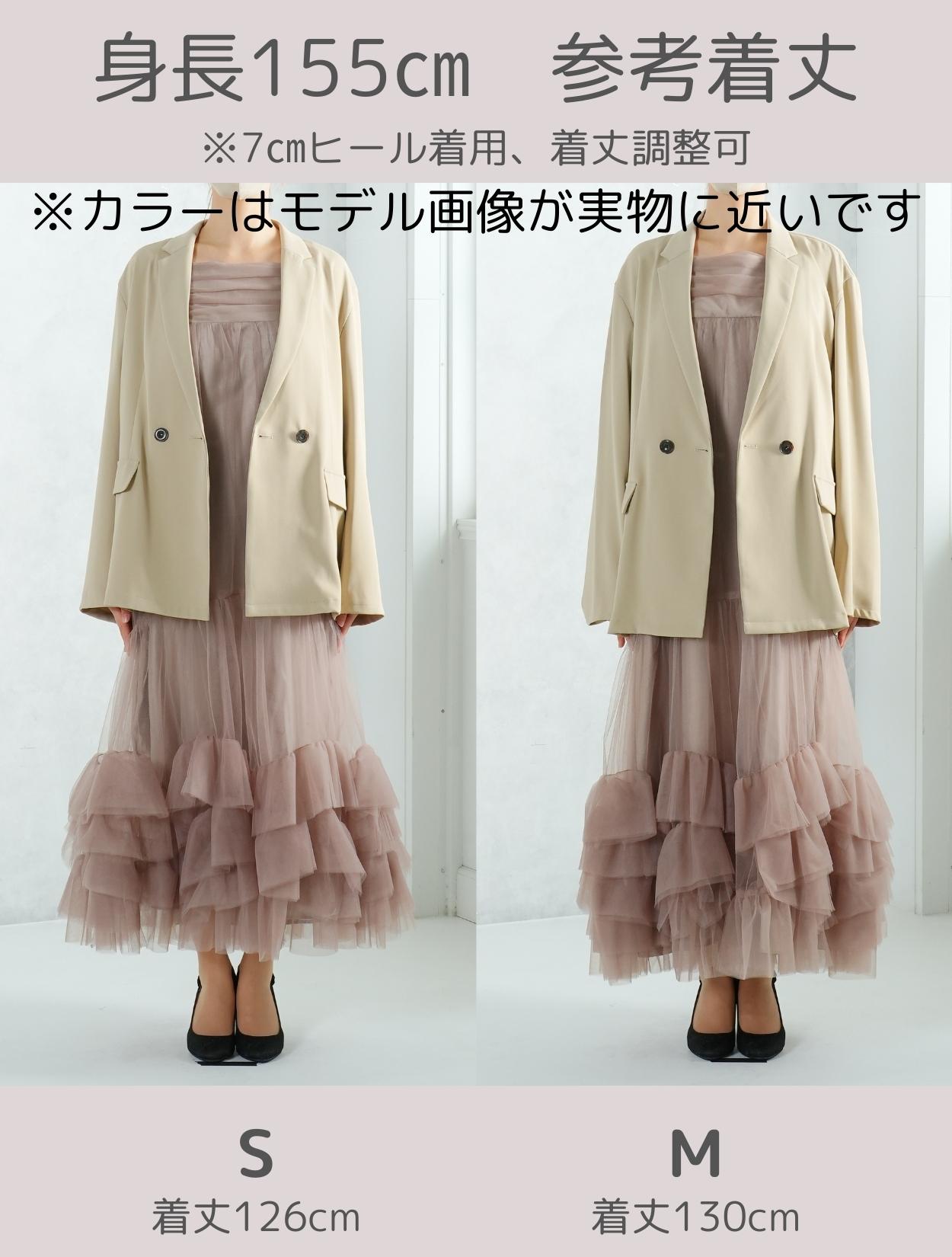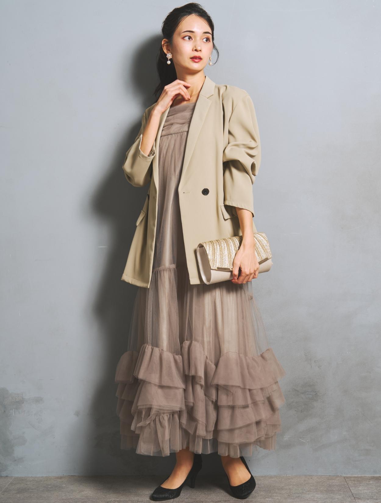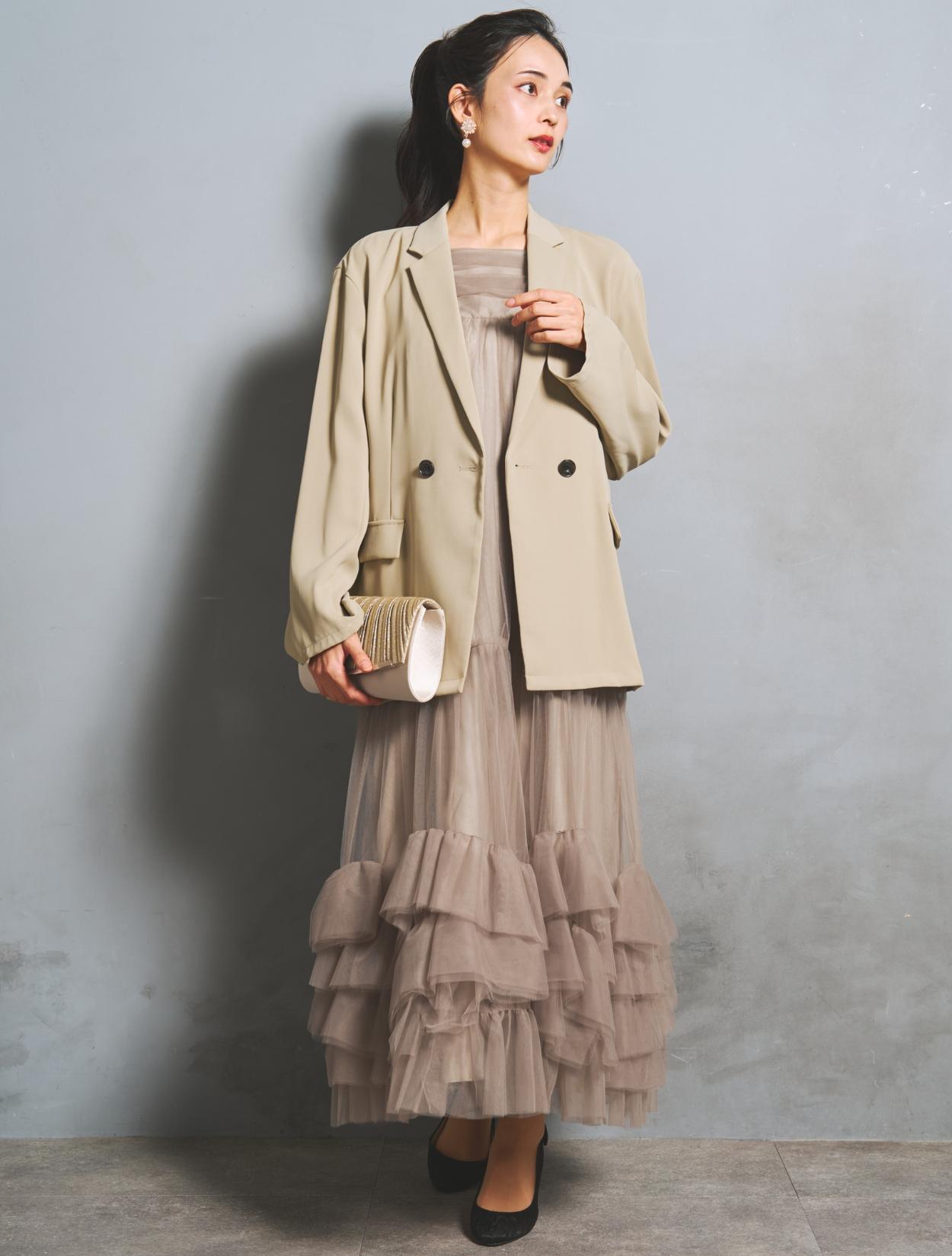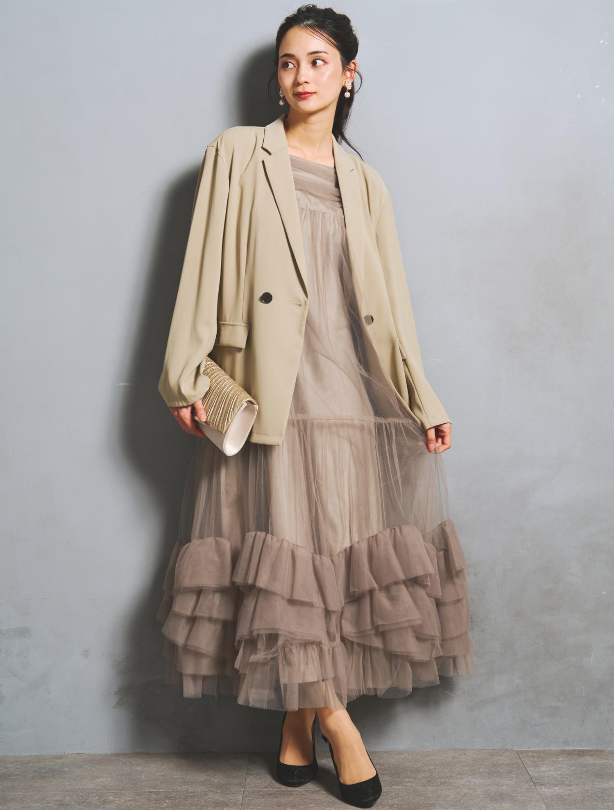裾に大胆なフリルをあしらったチュールワンピースと、W仕立てジャケットがセットになった、こなれ感たっぷりのトレンドドレス。絶妙な甘辛バランスがおしゃれさんに人気です。