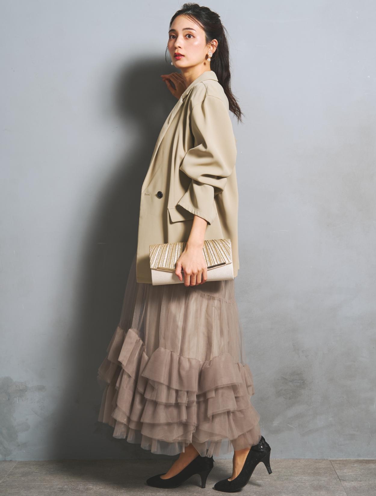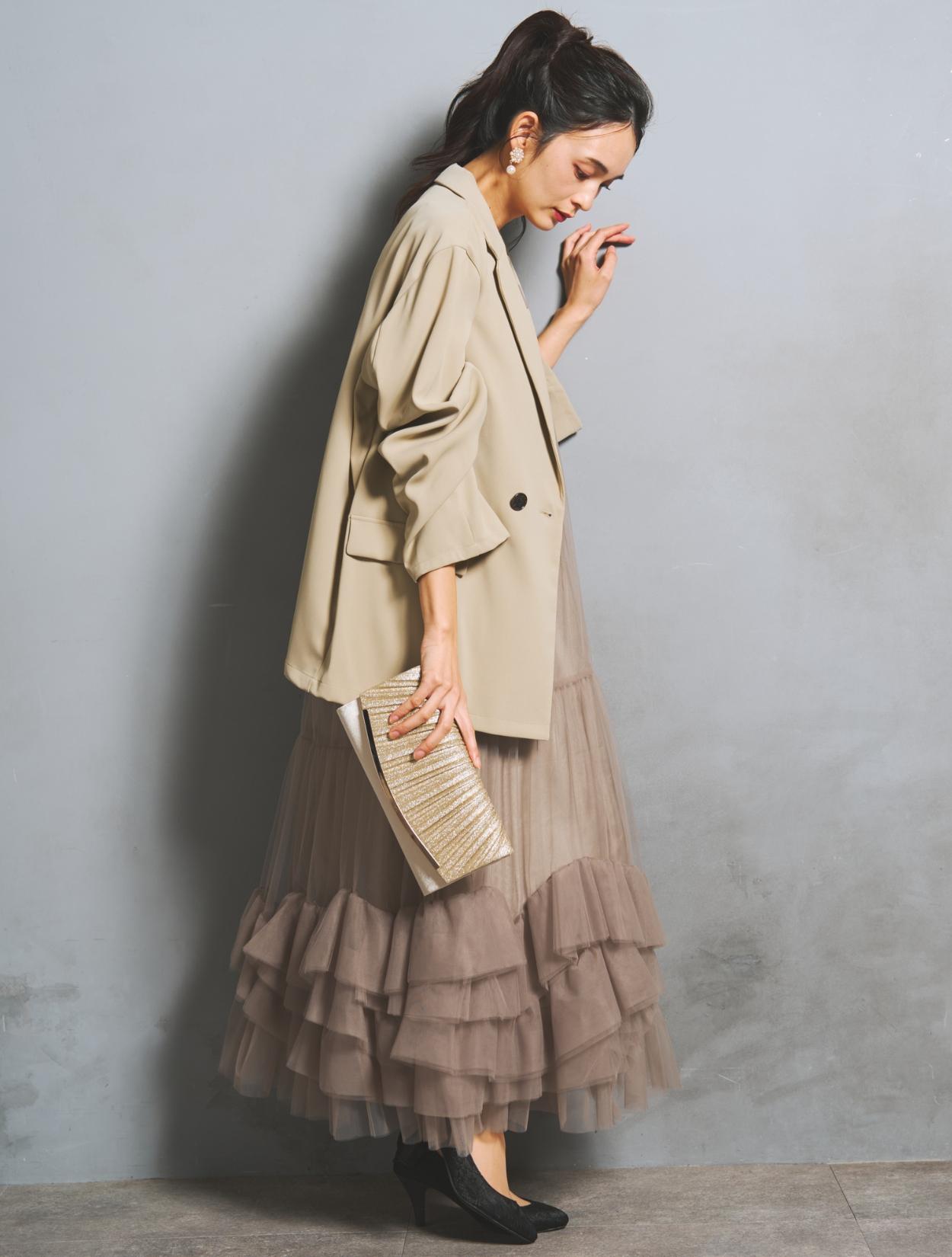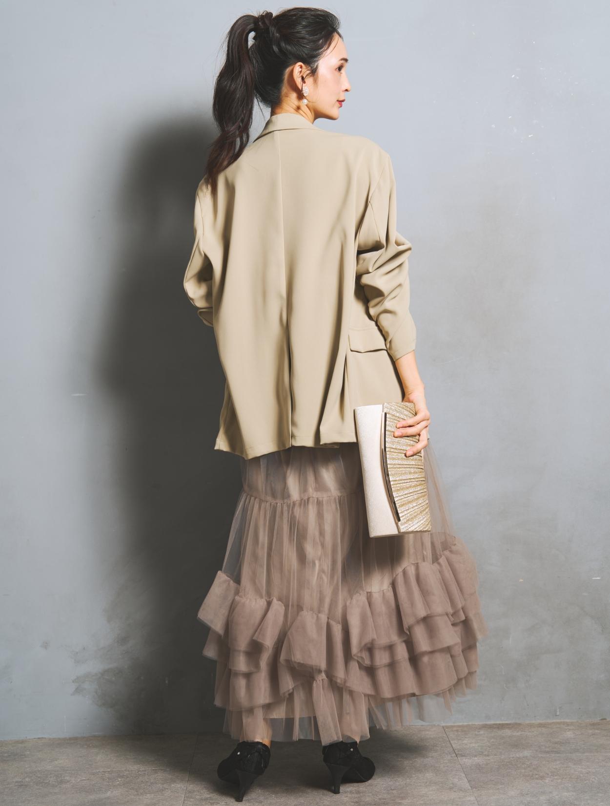 たっぷりのチュールフリルにトレンド感たっぷりのジャケットコーデは、20代30代におすすめです。