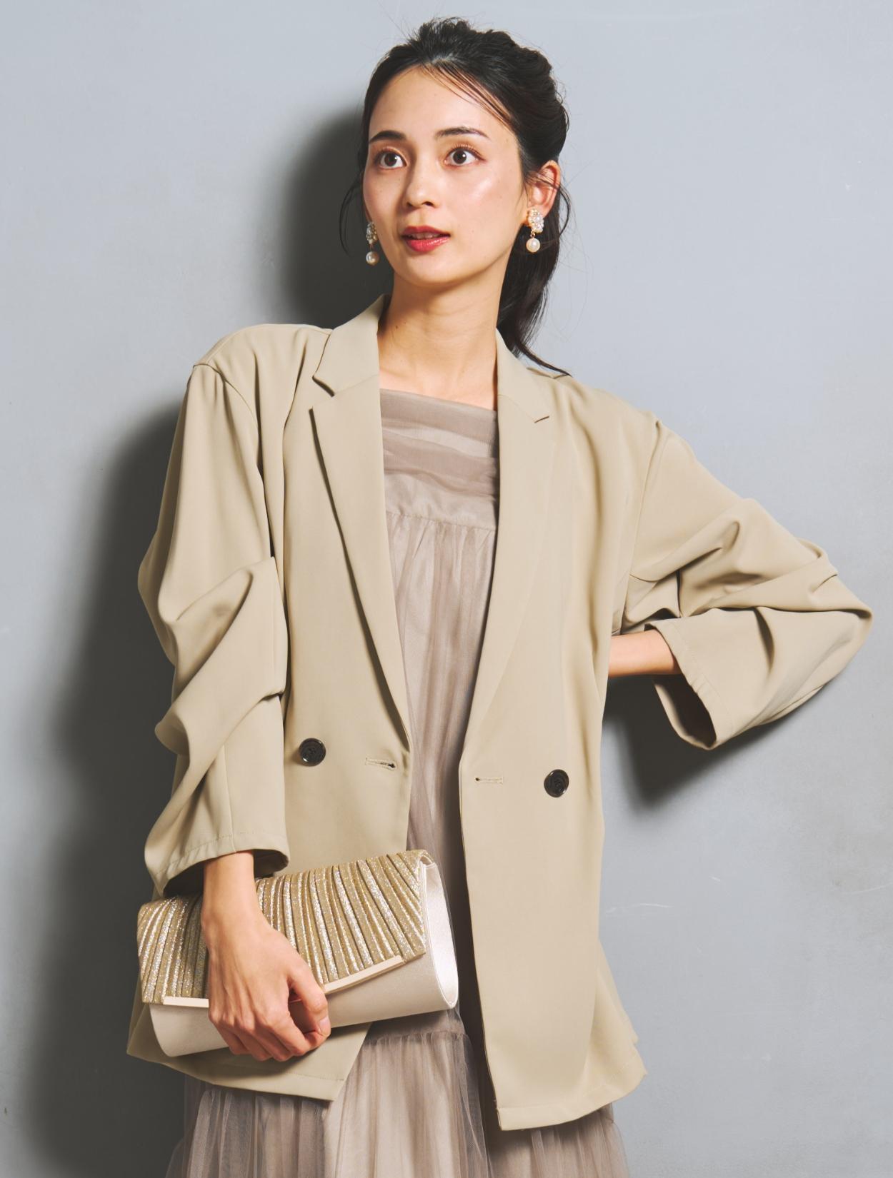 ざっくりと羽織るジャケットが今っぽいドレスに、ゴールドのラメが華やかなパーティー感のあるフォーマルコーデ。ワントーンでまとめておしゃれ見えするのもポイント。イヤリングはお顔映りを華やかに見せてくれる大振りフラワービジュータイプ。パールモチーフでフォーマル感もあります。