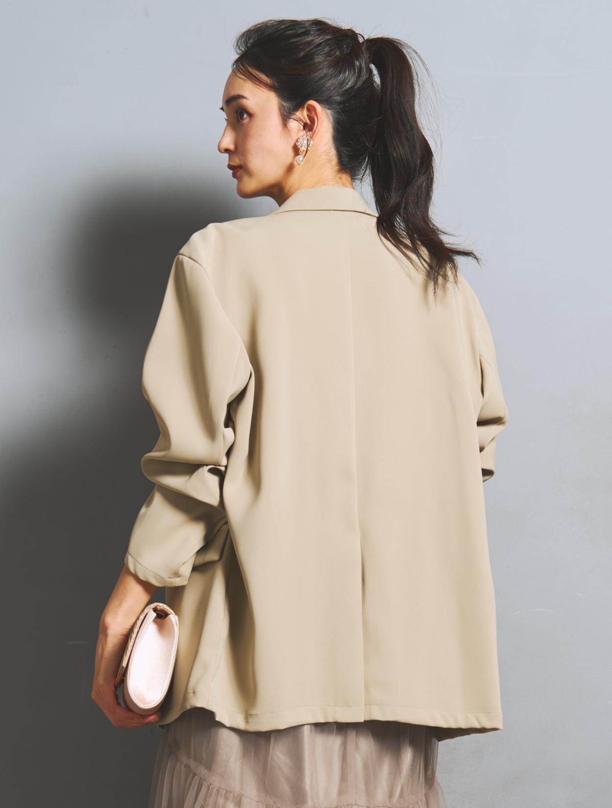 ジャケットはとろみのある生地で、落ち感が程よいリラックスムード。ゆとりを持たせたサイズ感で、サラッと羽織るだけでこなれたスタイリングに。華奢な方がざっくり着てもかっこいい着こなしになりますし、キャミワンピでは上半身の肉付きが気になる…という方にもカバー力抜群の強い味方のジャケットです。
