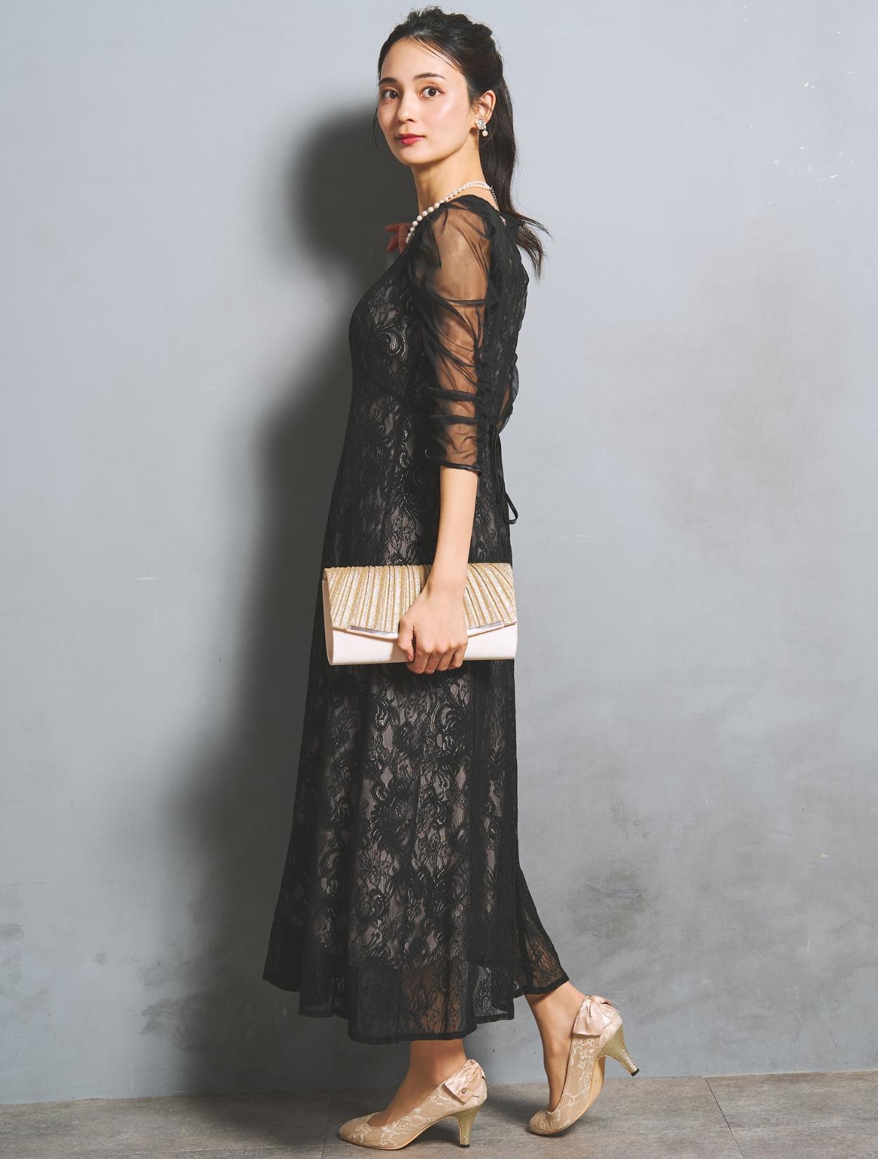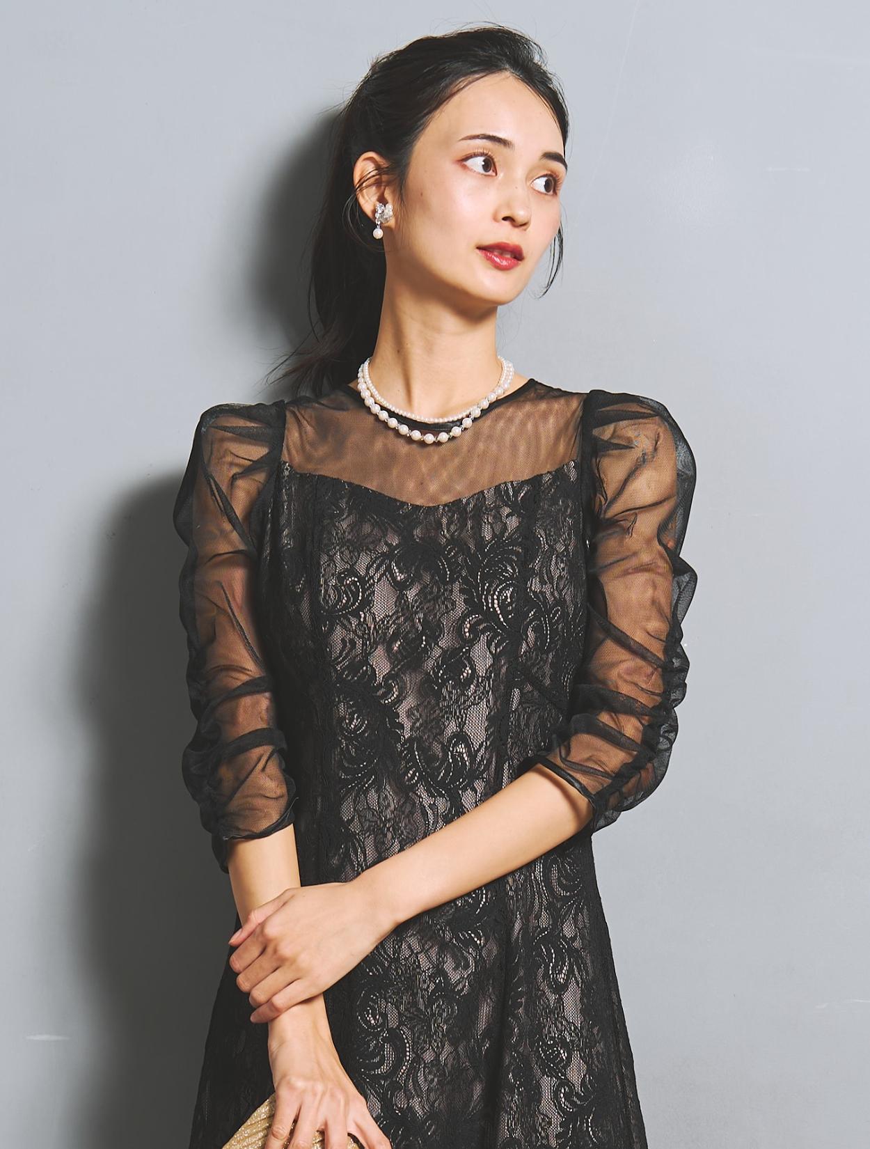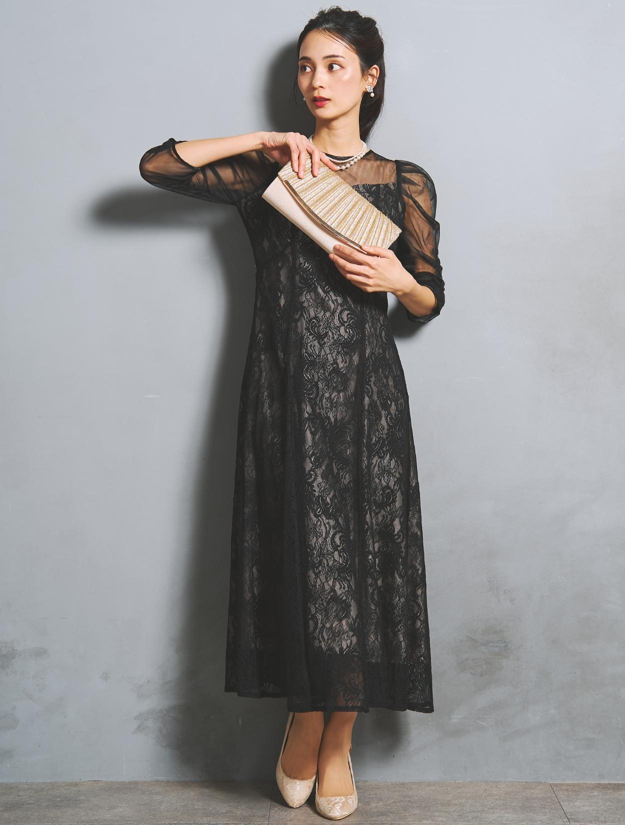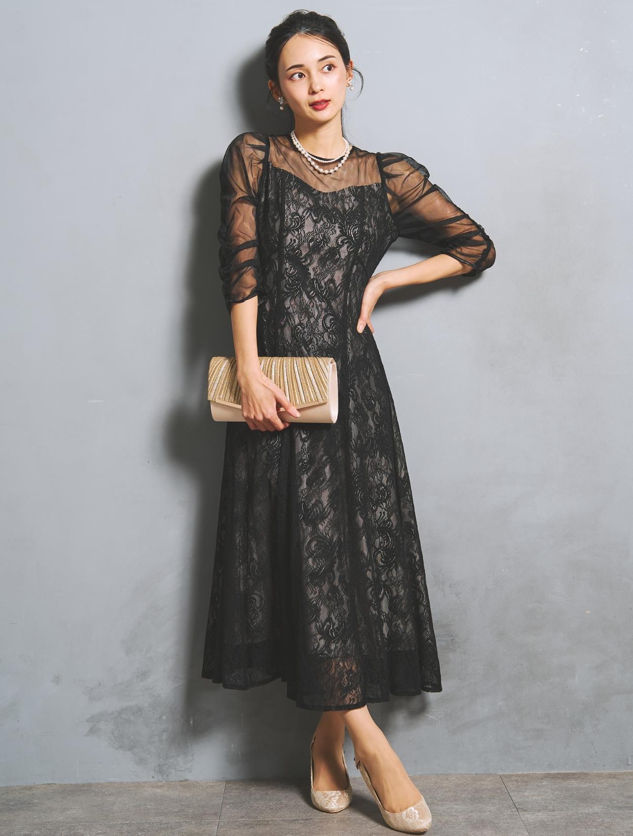 大人可愛いブラックのレースドレス。落ち着いた色合いながらも、レースから裏地が透けるので華やかさがあります。裏地はの色は赤味のあるグレージュで、ブラックドレスをほんのり優しい印象に見せてくれます。