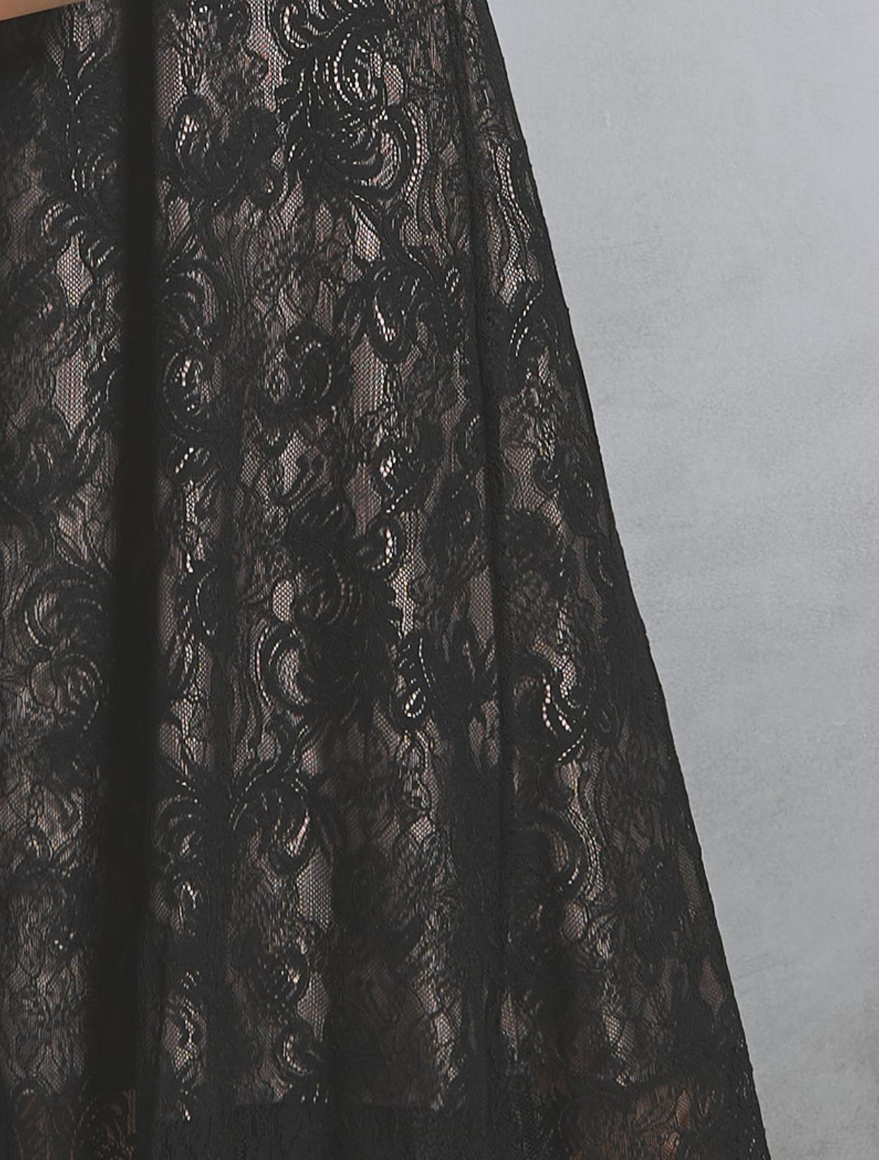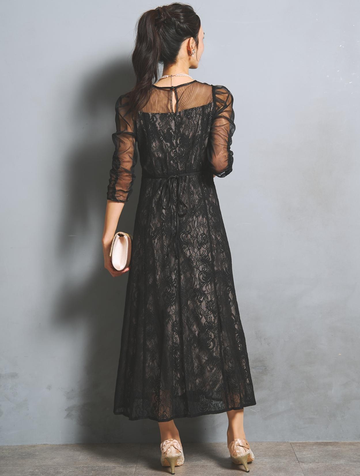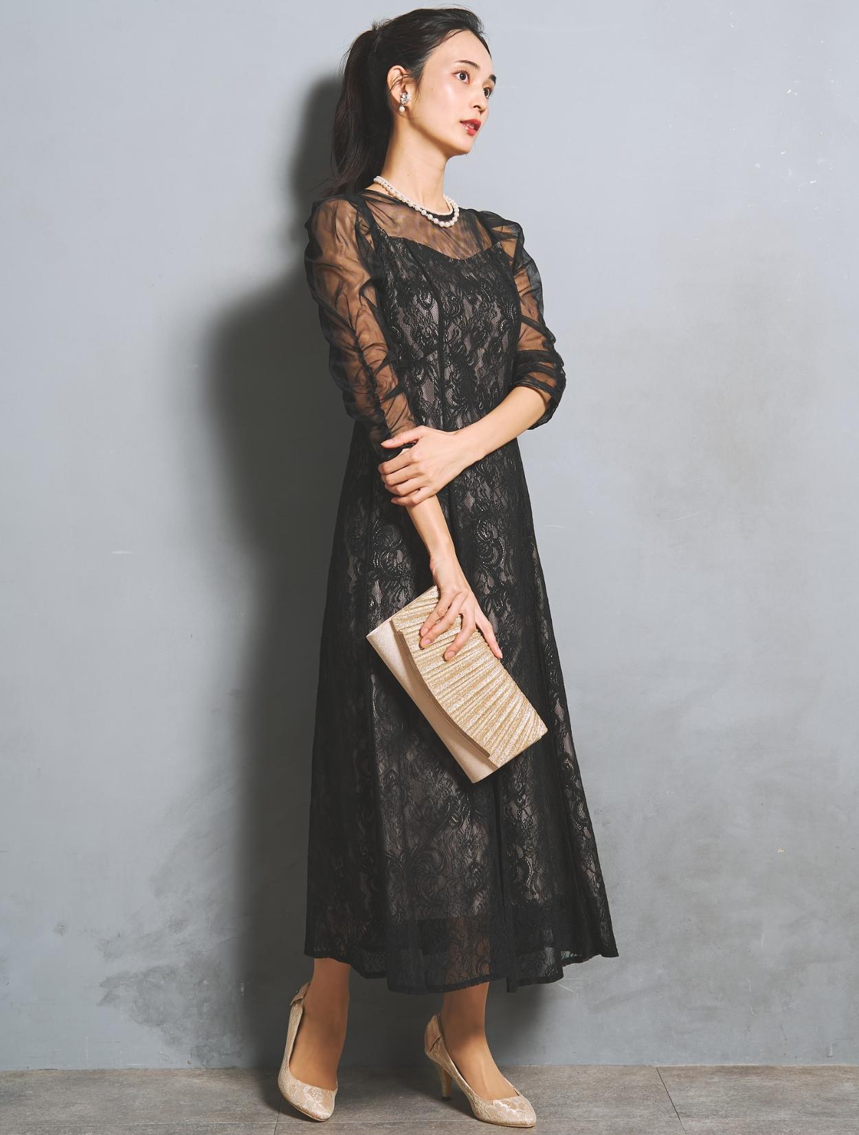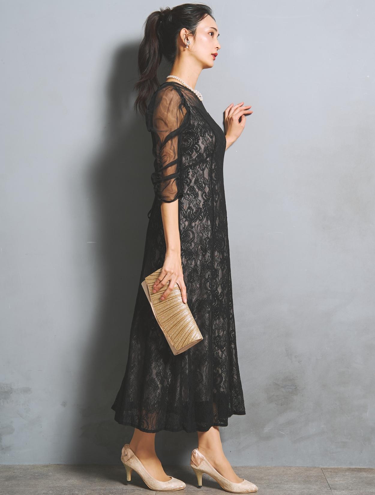 大人可愛いブラックのレースドレス。落ち着いた色合いながらも、レースから裏地が透けるので華やかさがあります。裏地はの色は赤味のあるグレージュで、ブラックドレスをほんのり優しい印象に見せてくれます。