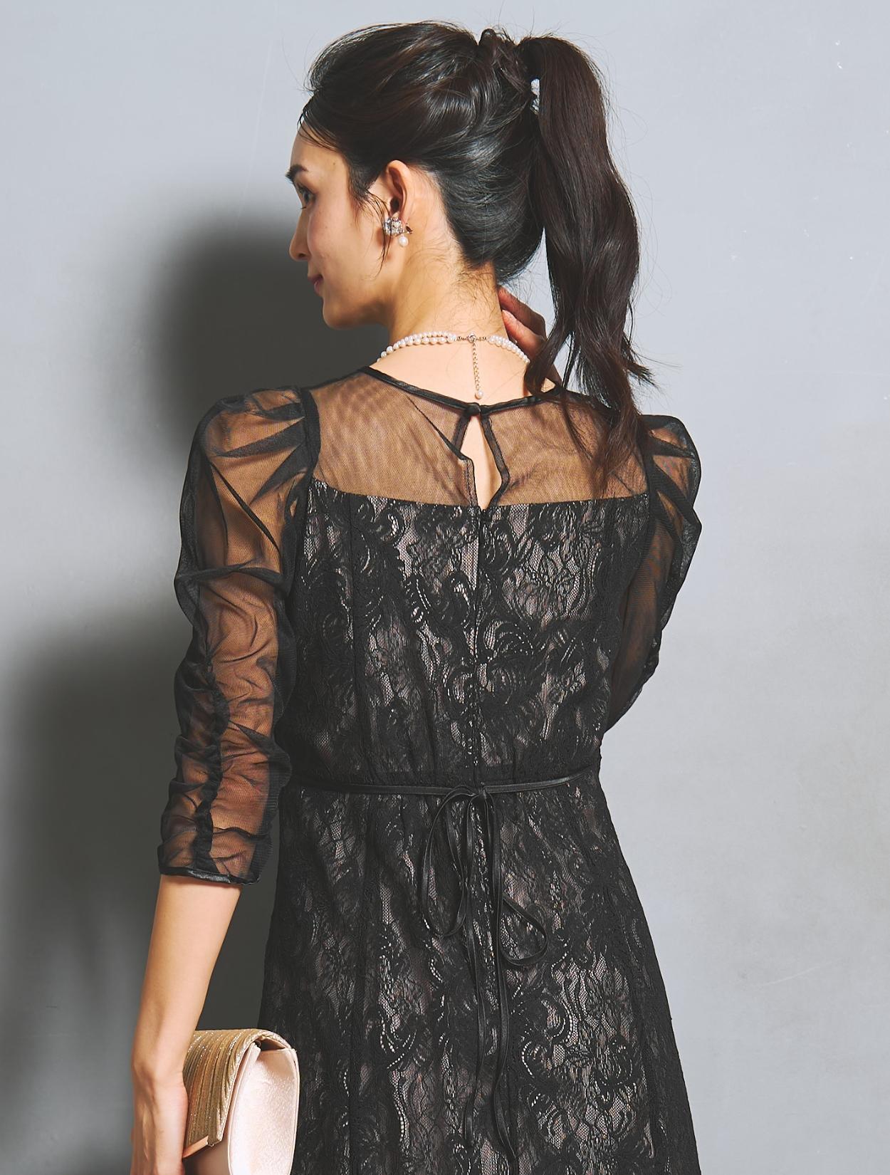 高級感のある上品なレースが目を惹くドレス。デコルテからお袖にかけてはシンプルなシアーチュールが使われているので、レースドレスでも甘くなり過ぎず幅広い年代におすすめです。ギャザーを寄せたお袖のデザインはお顔周りを華やかに見せてくれて、写真写りも良くSNS映えします◎。肩幅が気になる方でも着こなしやすい、控えめなボリューム感なのも嬉しいポイントです。ウエストには華奢なリボン紐が付いているので、キュッと絞って細身の方でもキレイに着こなせます。さりげなくウエストマークできるのでスタイルアップ効果もあり。首元も開きすぎないデザインなので、Sサイズや低身長の方でも着こなしやすいドレスです。ボリュームを落としたフレアスカートは、全体のバランスをすっきり大人っぽく見せてくれます。