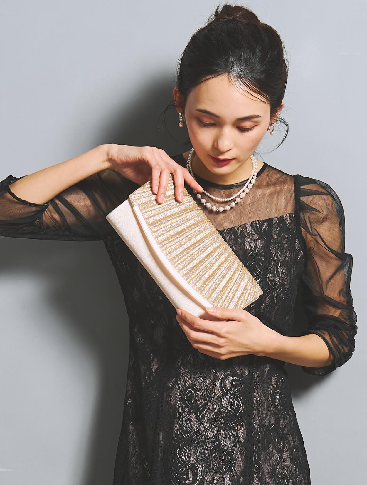 上品なブラックレースのドレスに、ゴールドベージュのパーティーバッグを合わせて華やかさを演出するコーディネート。上品なゴールドラメがブラックドレスに映えるので、ブラックドレスでも暗く見えません。2連ネックレスのパールのホワイトも、お顔映りを明るくしてくれるアイテム。