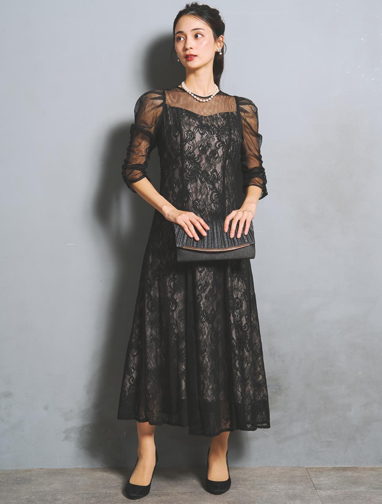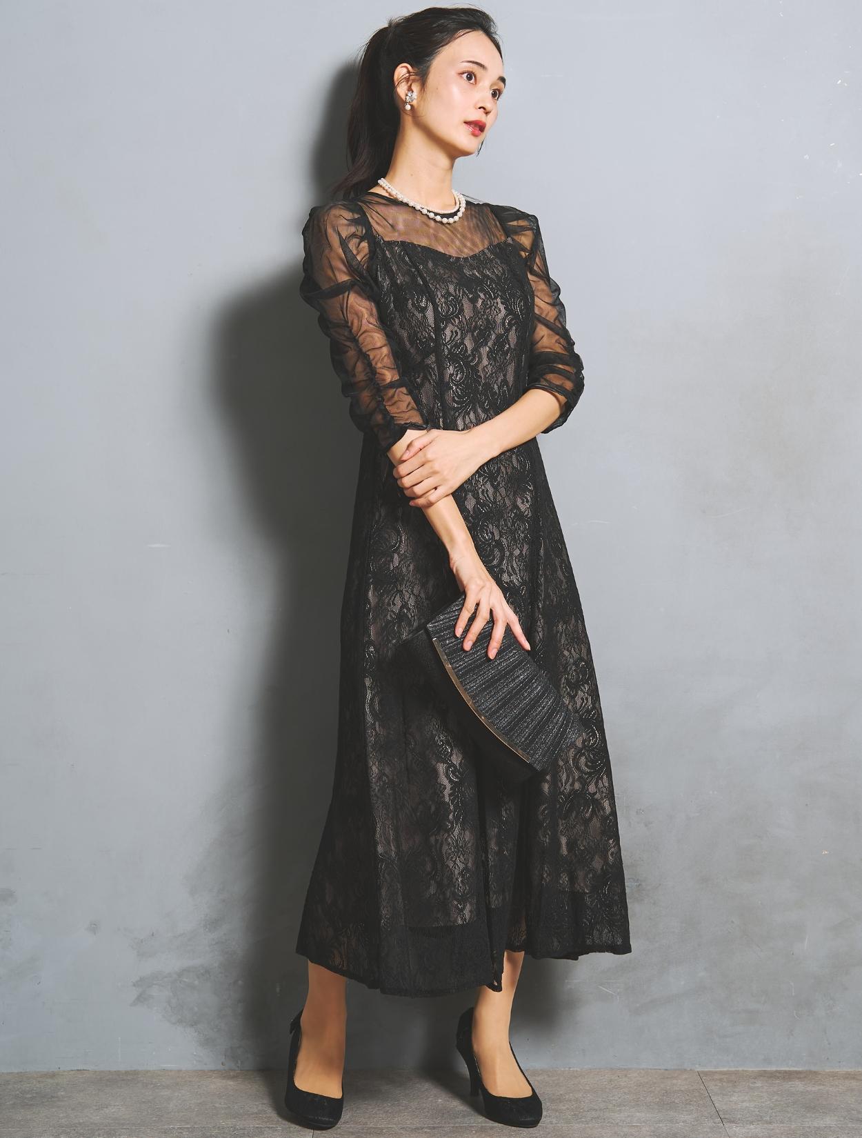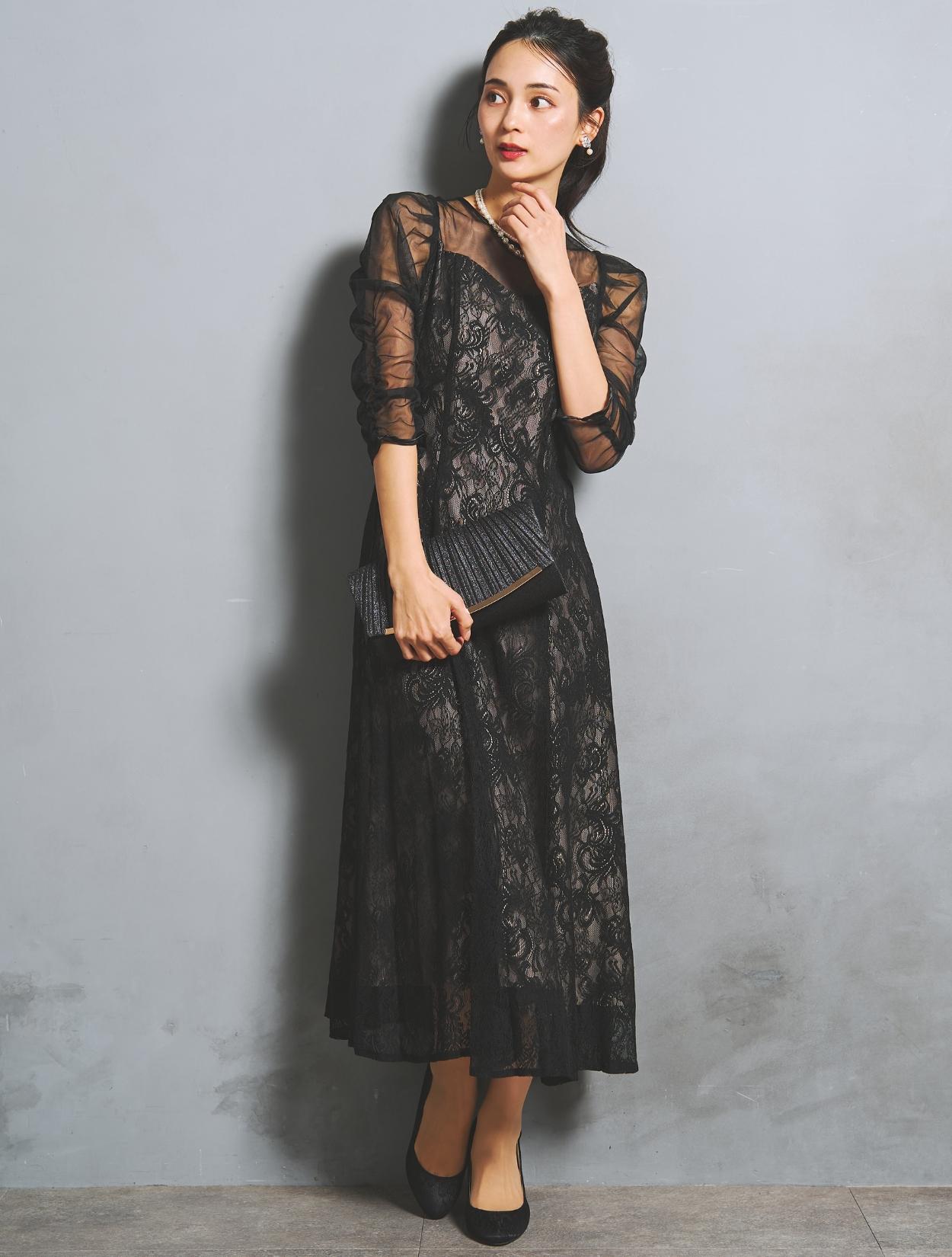 大人可愛いブラックのレースドレス。落ち着いた色合いながらも、レースから裏地が透けるので華やかさがあります。裏地はの色は赤味のあるグレージュで、ブラックドレスをほんのり優しい印象に見せてくれます。
