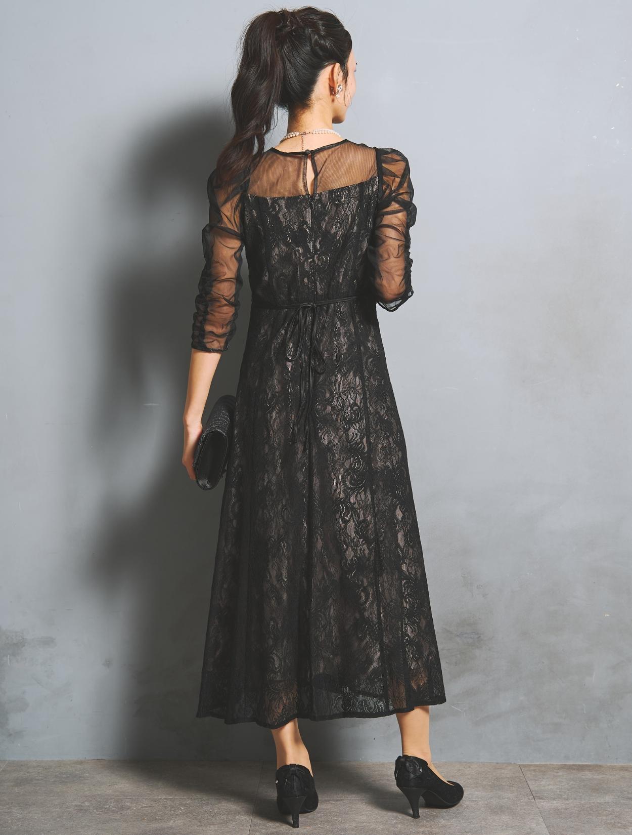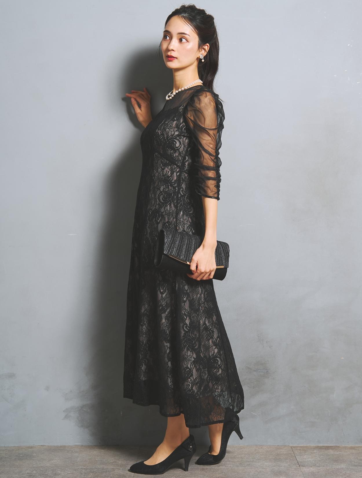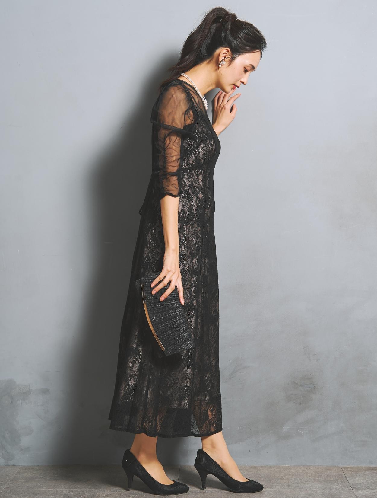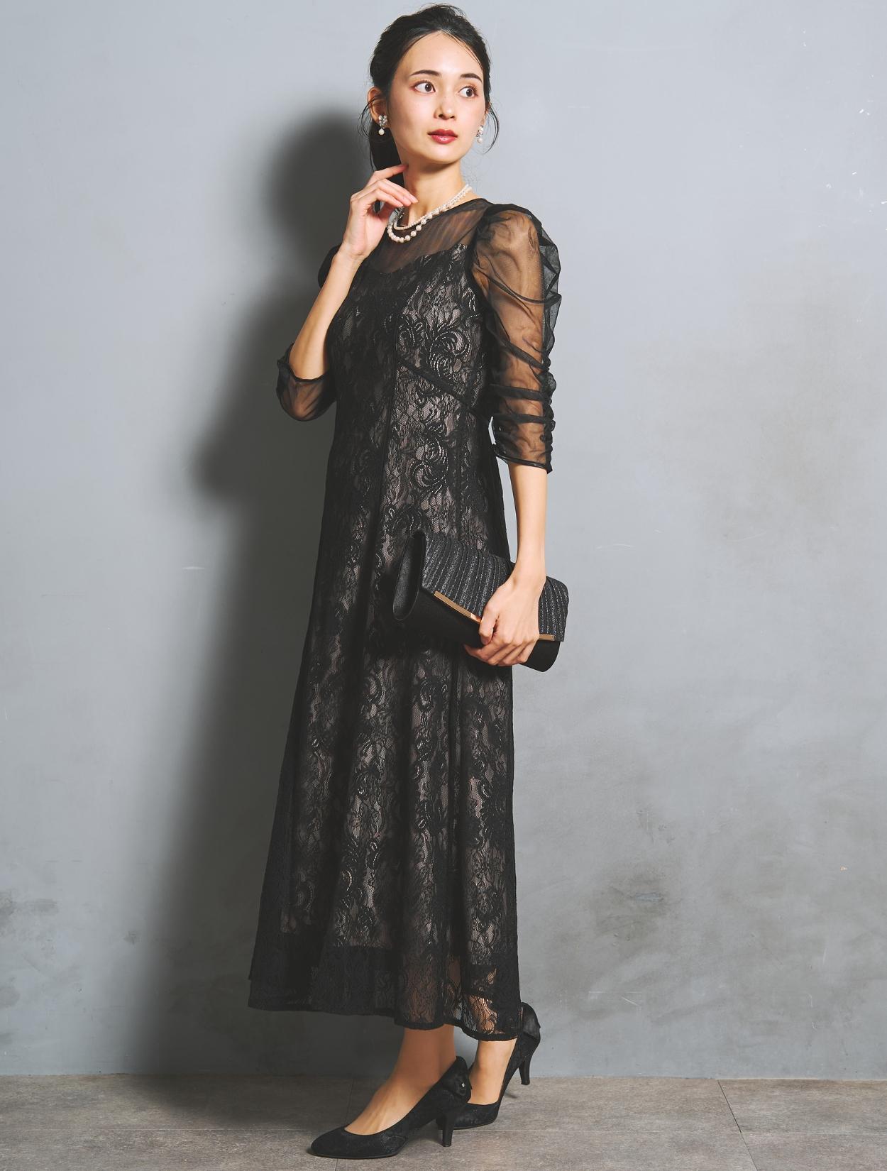 大人可愛いブラックのレースドレス。落ち着いた色合いながらも、レースから裏地が透けるので華やかさがあります。裏地はの色は赤味のあるグレージュで、ブラックドレスをほんのり優しい印象に見せてくれます。
