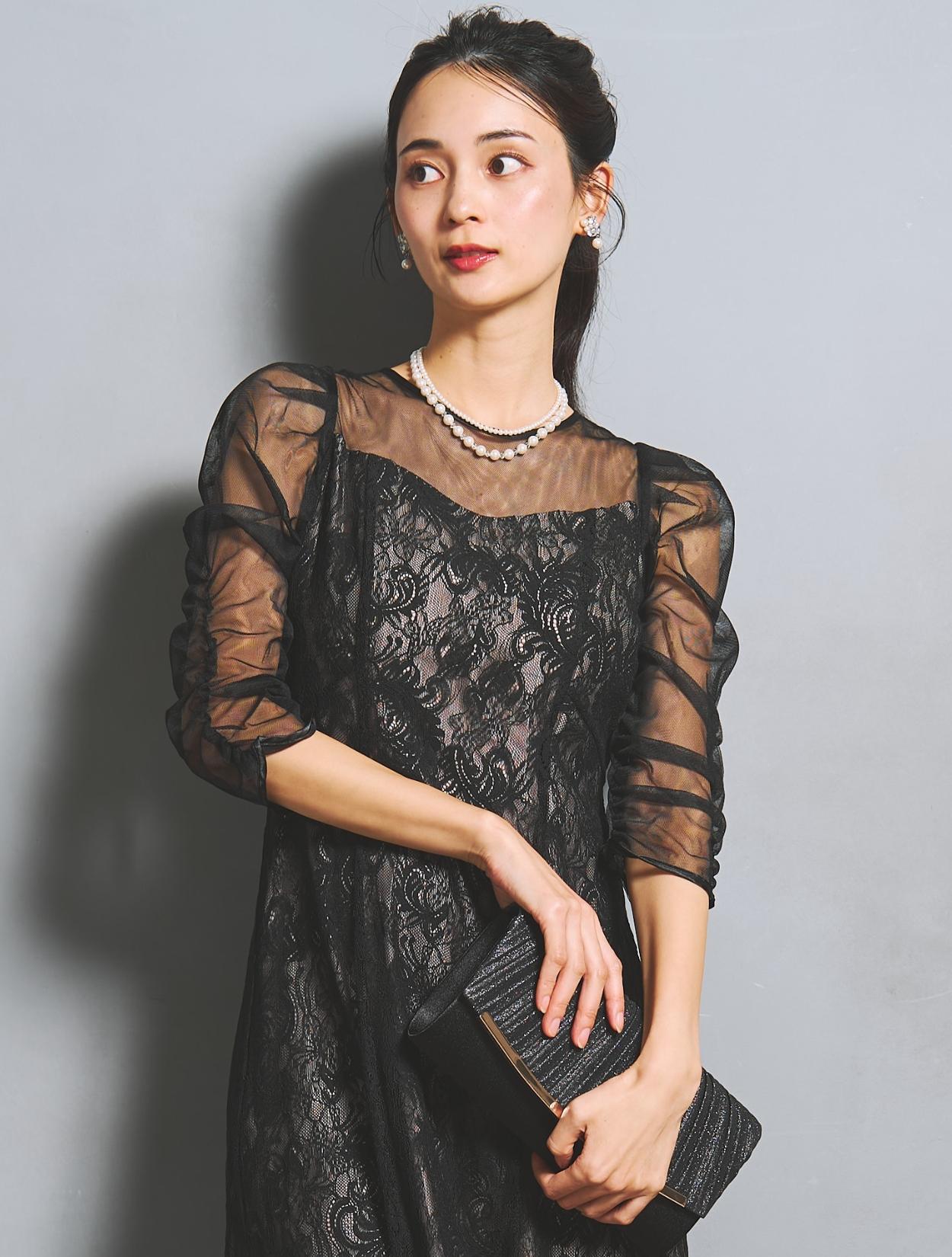 上品なブラックレースのドレスを、シックに着こなすコーディネート。ブラックバッグでも、ラメ感やゴールドパーツに華やかさがあり、結婚式のゲスト、親族にもおすすめです。2連ネックレスのパールのホワイトも、お顔映りを明るくしてくれるアイテム。